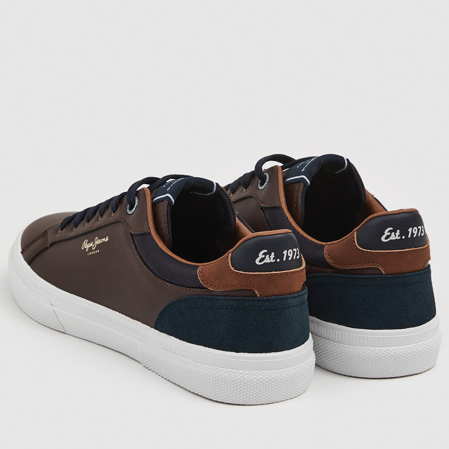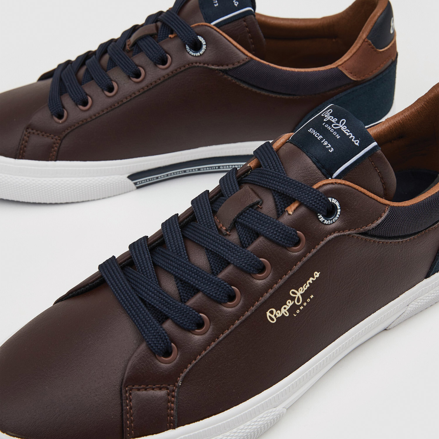 Pepe Jeans ανδρικό sneaker σε χρώμα καφέ κατασκευασμένο από οικολογικό δέρμα με δερμάτινες λεπτομέρειες. Διαθέτει ανατομικό πατάκι. Ύψος σόλας 2.5εκ.