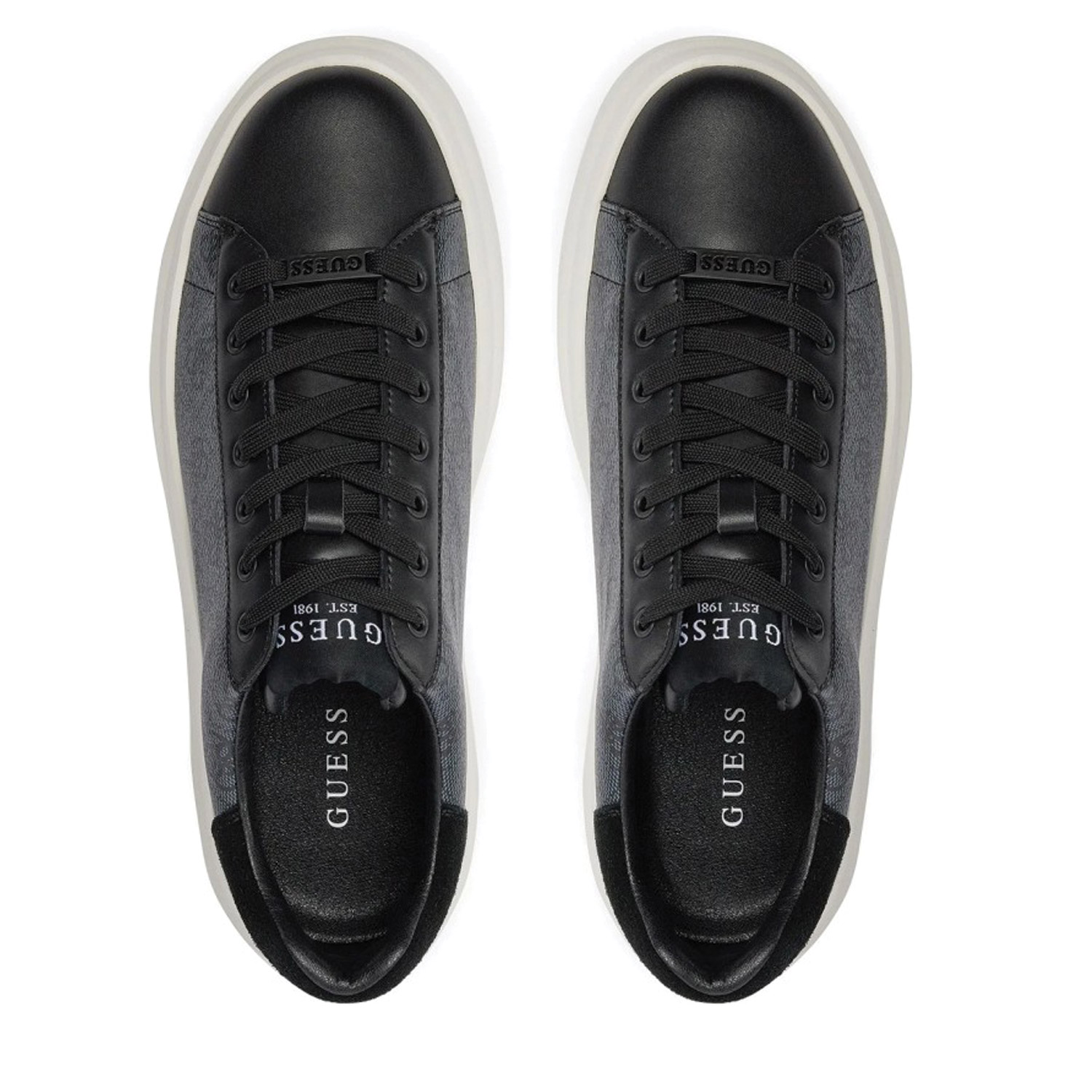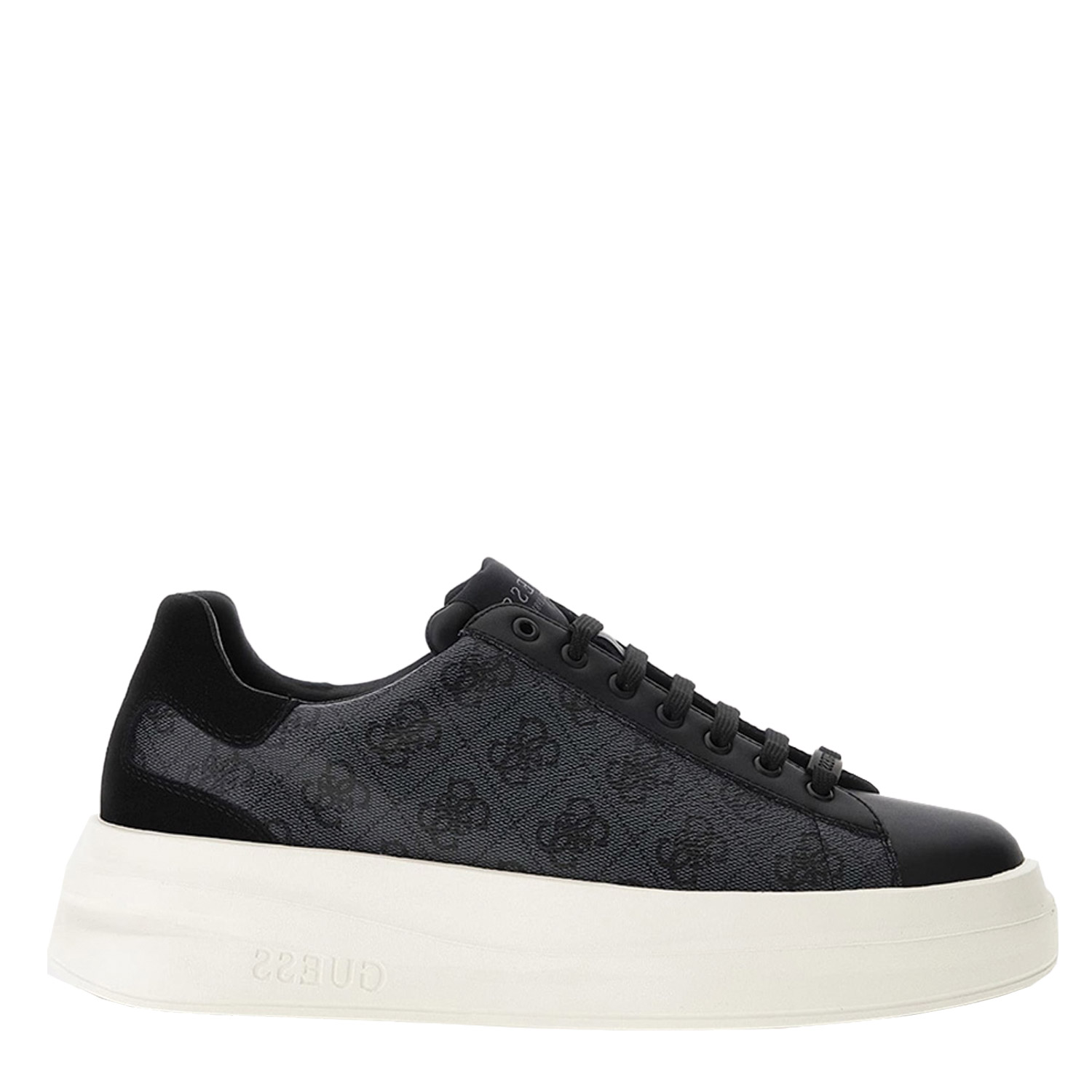Guess ανδρικό sneaker, σε coal χρώμα, κατασκευασμένο από οικολογικό δέρμα, με suede λεπτομέρειες στην φτέρνα. Ύψος σόλας 5εκ.