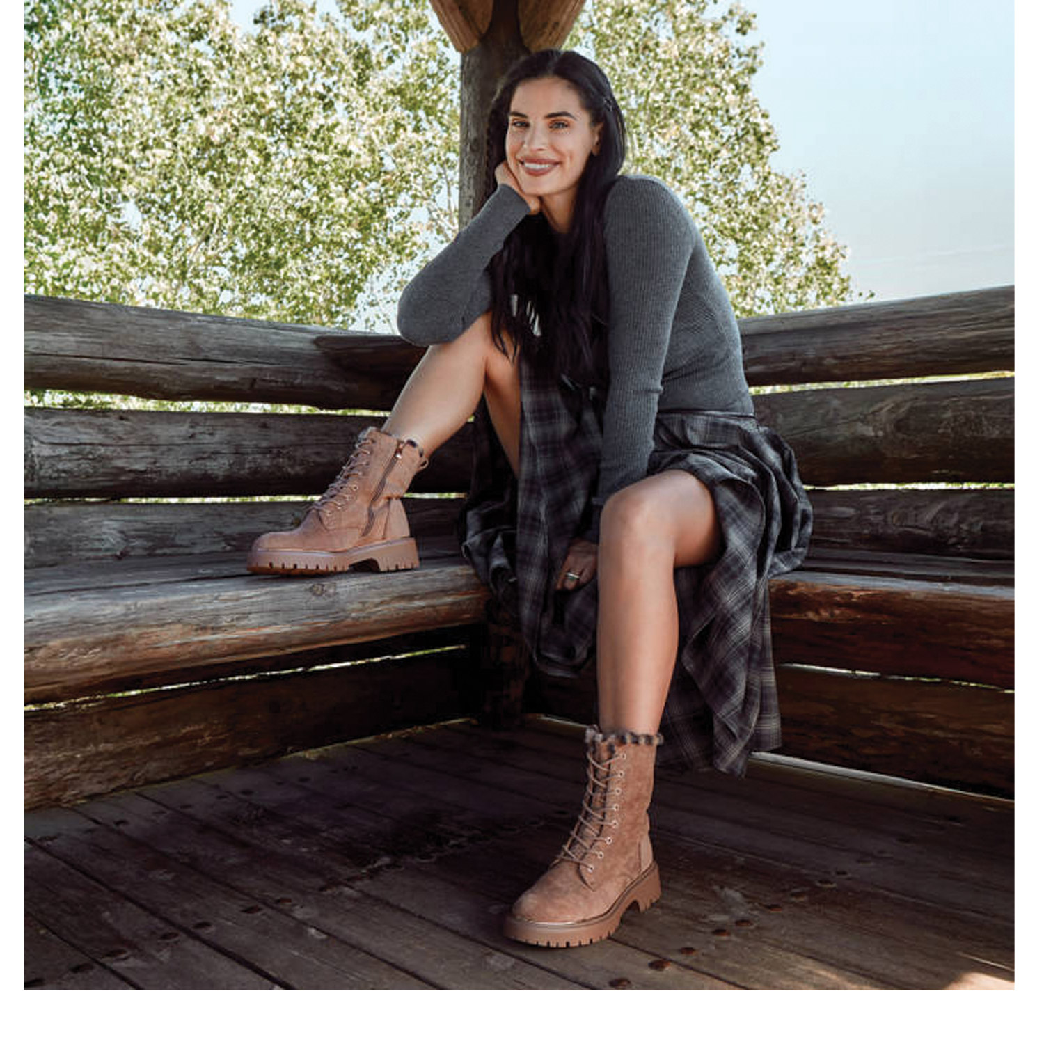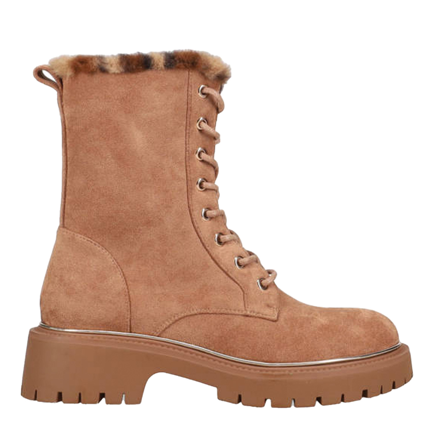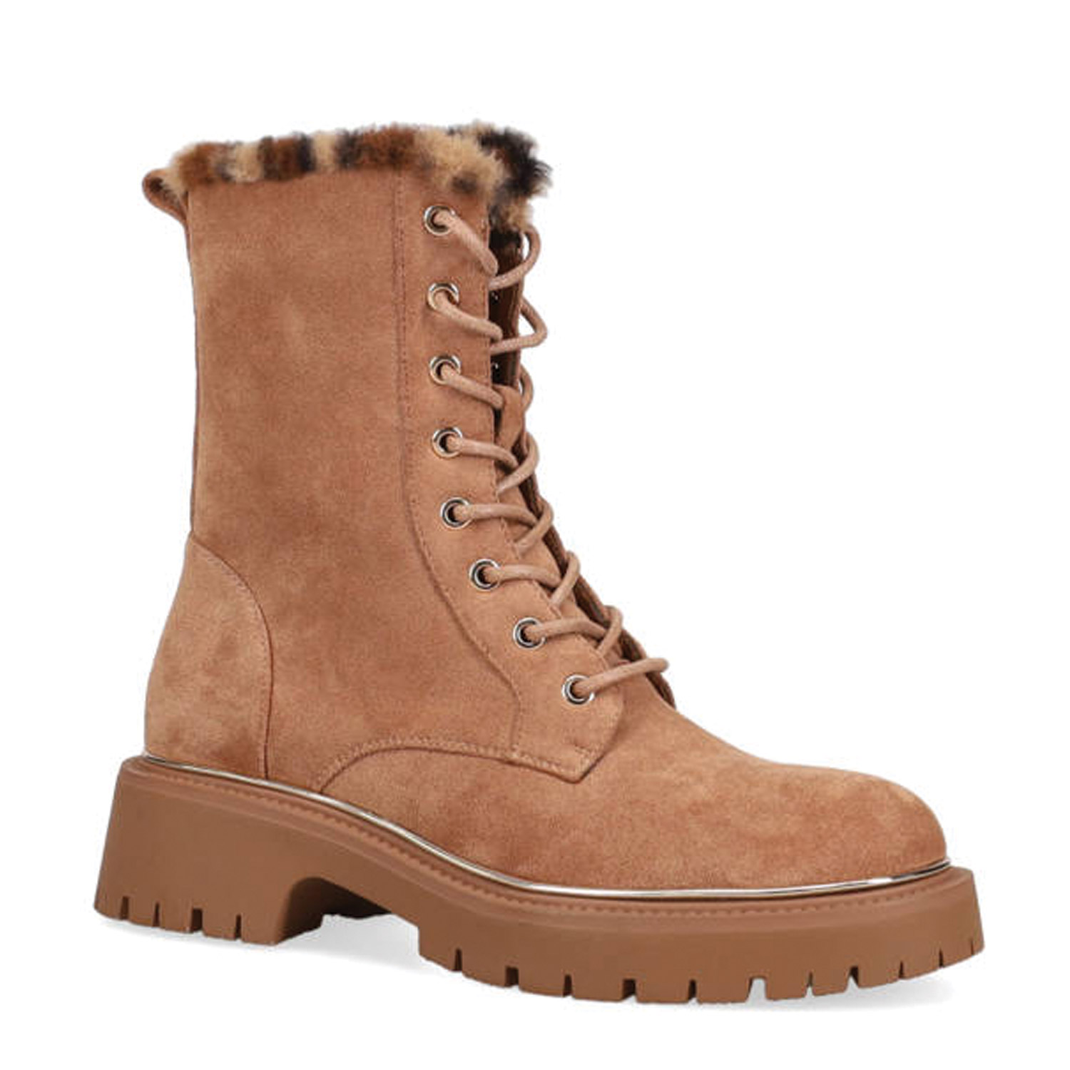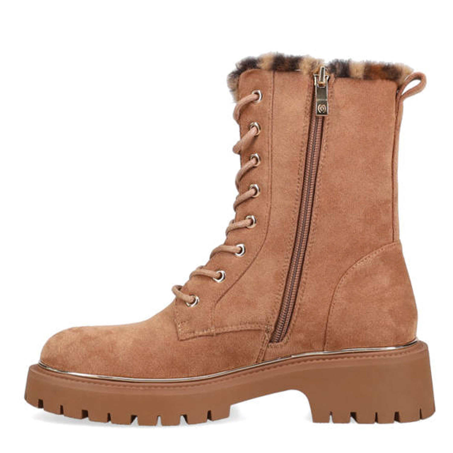 Ταμπά μποτάκι. Διαθέτει σουέντ υφή, λεοπάρ λεπτομέρεια με συνθετική γούνα και τρακτερή σόλα. Δένει με κορδόνια και φερμουάρ για πιο εύκολη και γρήγορη εφαρμογή.