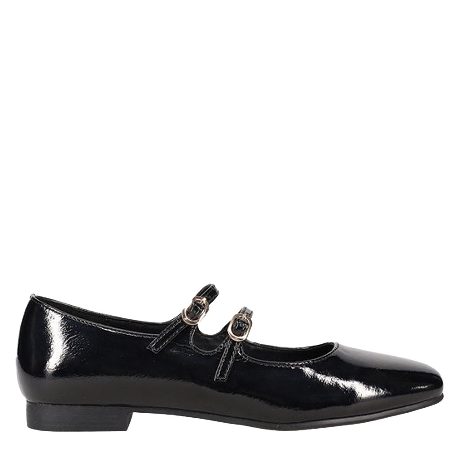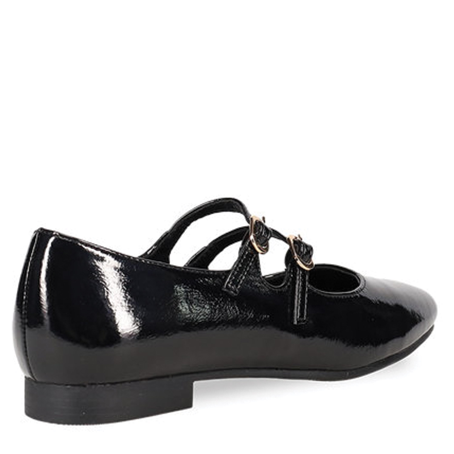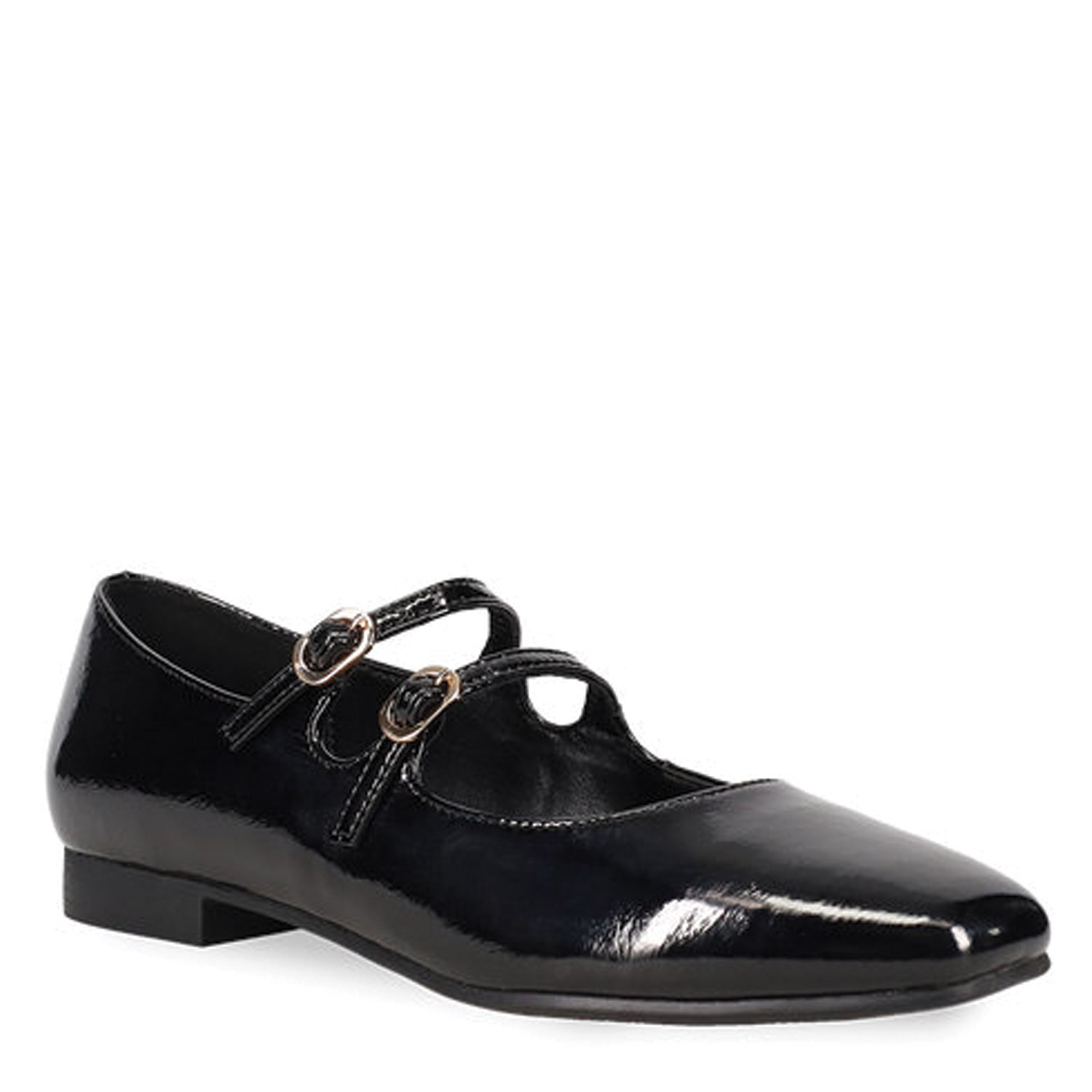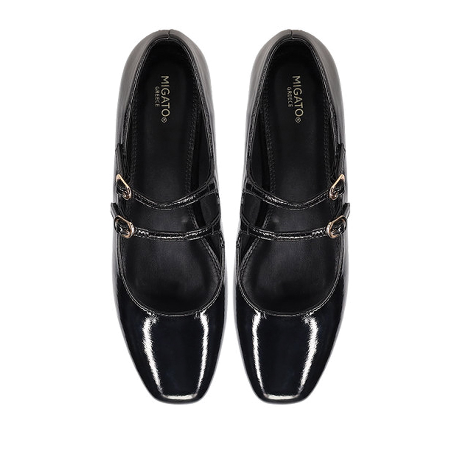Μαύρη μπαλαρίνα λουστρίνι Mary Jane. Κλείνει με δύο ρυθμιζόμενα λουράκια με αγκράφες.