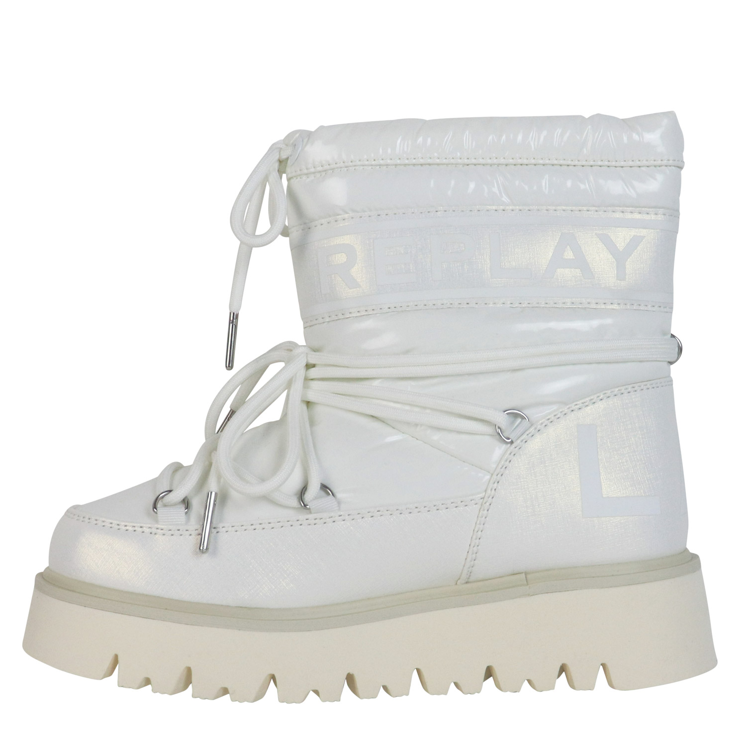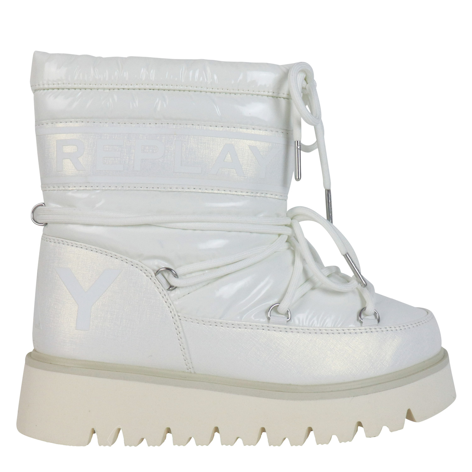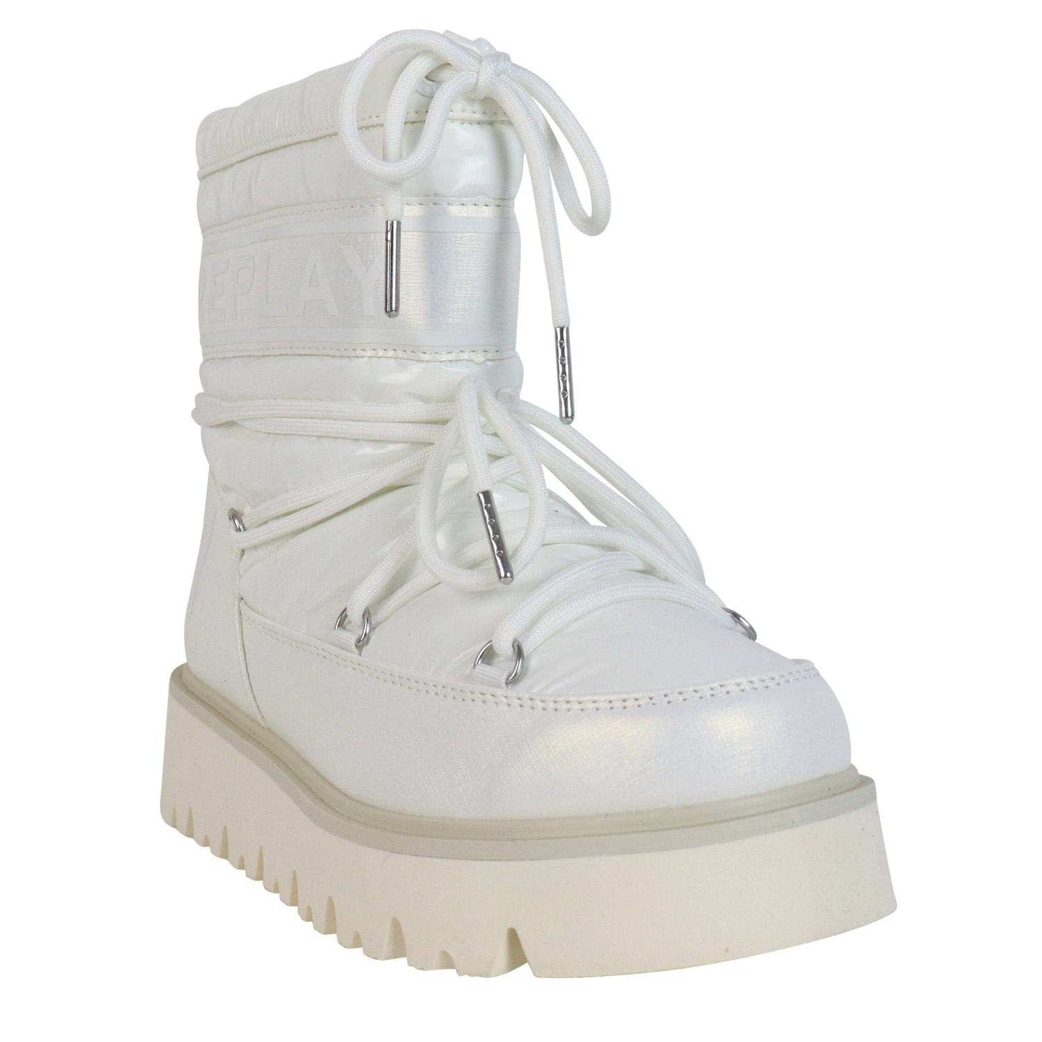 Replay γυναικείο μποτάκι χιονιού, σε εκρού χρώμα, κατασκευασμένο από ύφασμα. Ύψος σόλας 5εκ.