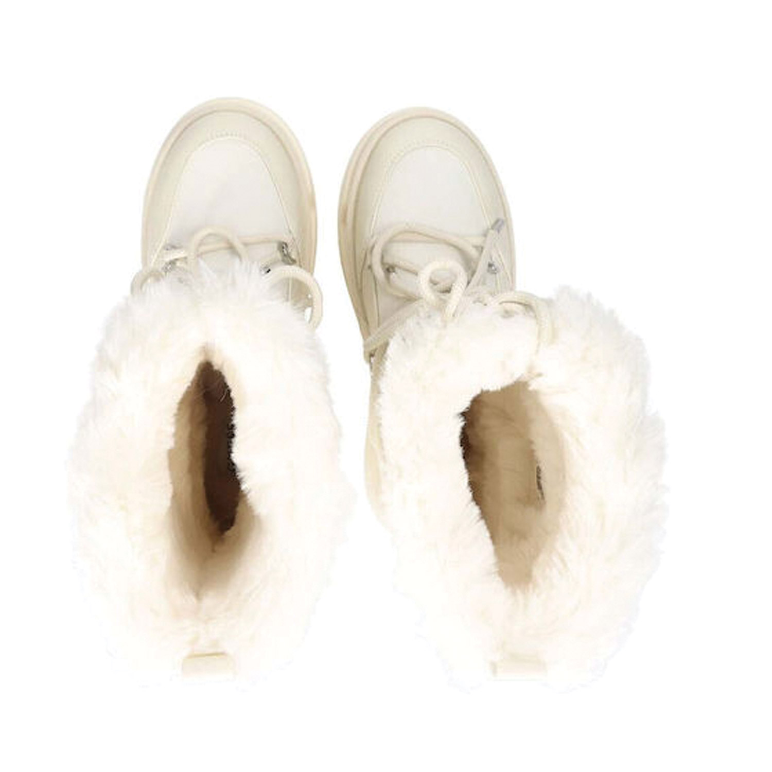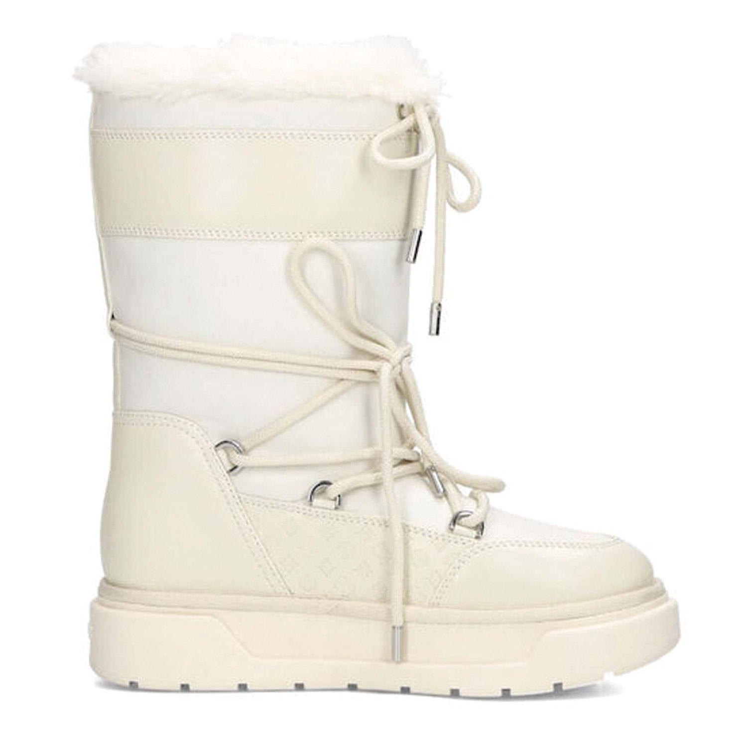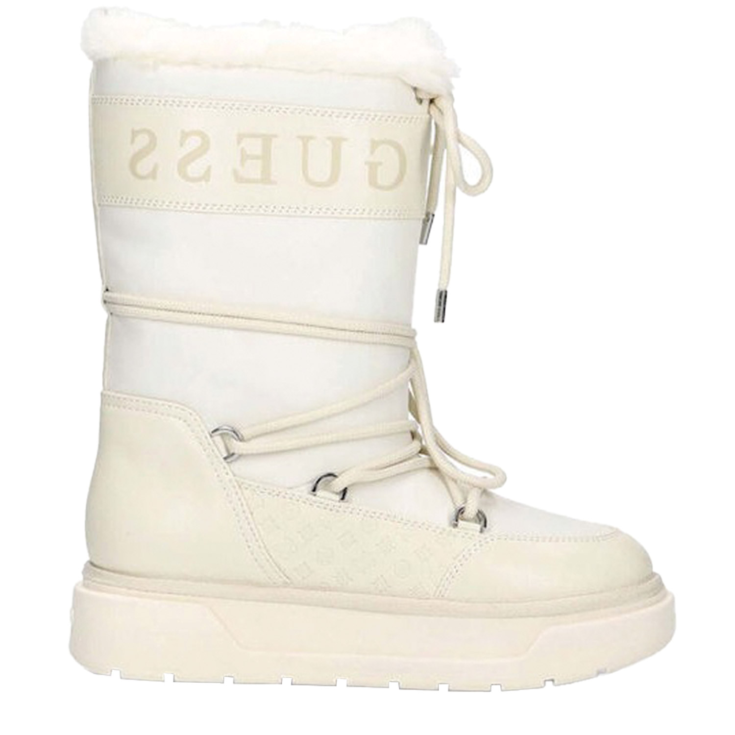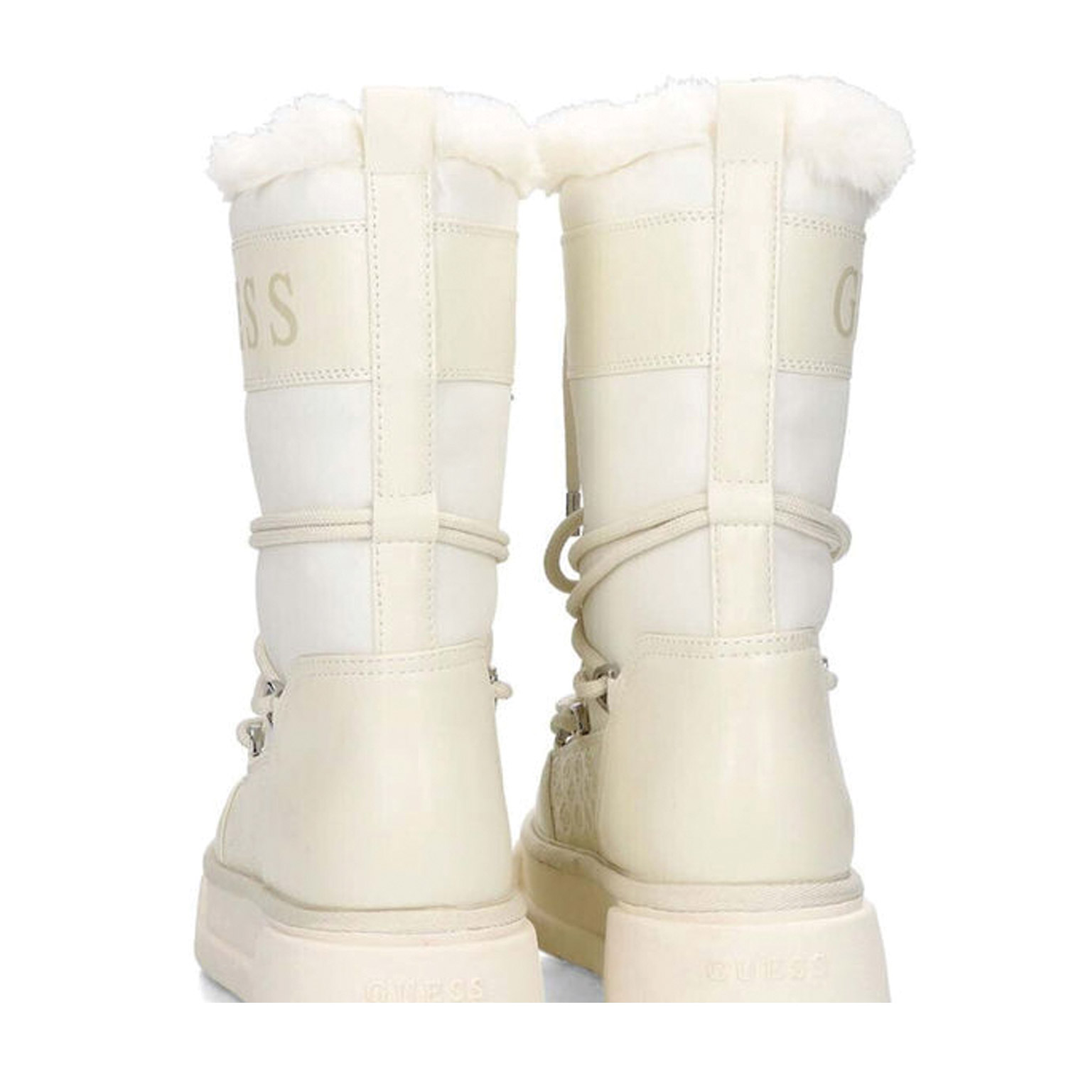 Guess γυναικείο μποτάκι χιονιού σε λευκό-μπεζ χρώμα, κατασκευασμένο από οικολογικό δέρμα και ύφασμα. Ύψος σόλας 3εκ.