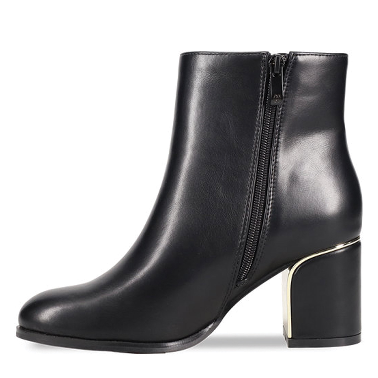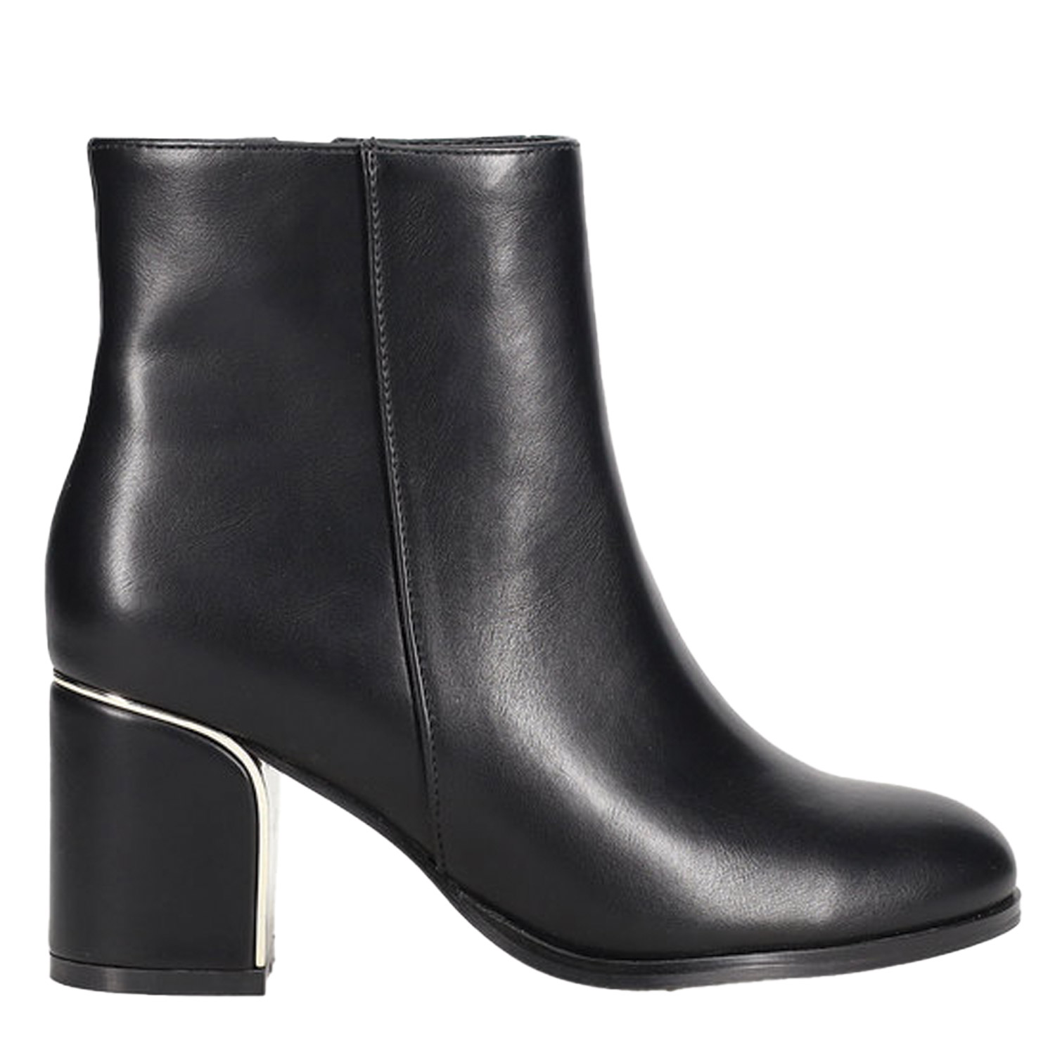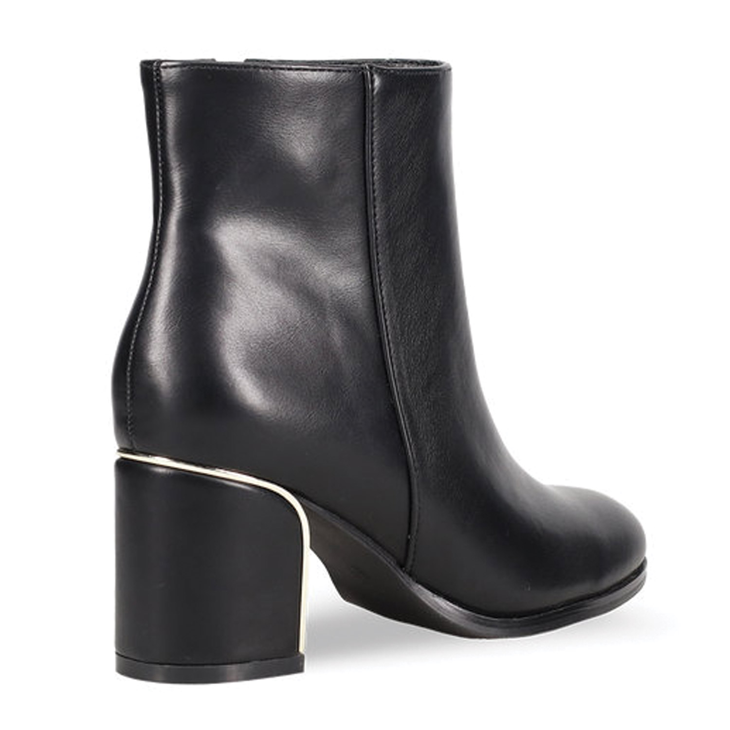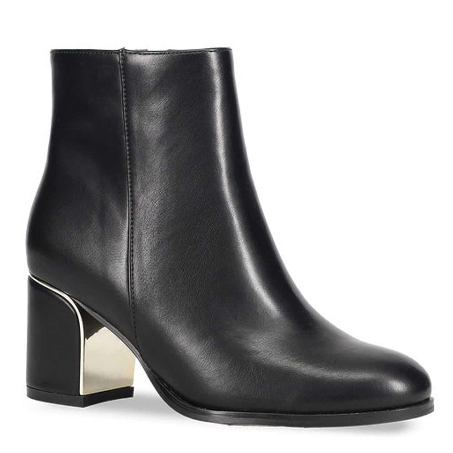 Μαύρο μποτάκι μέχρι πάνω από τον αστράγαλο. Διαθέτει χοντρό τακούνι μεσαίου ύψους με χρυσή λεπτομέρεια. Κλείνει με φερμουάρ στο πλάι.