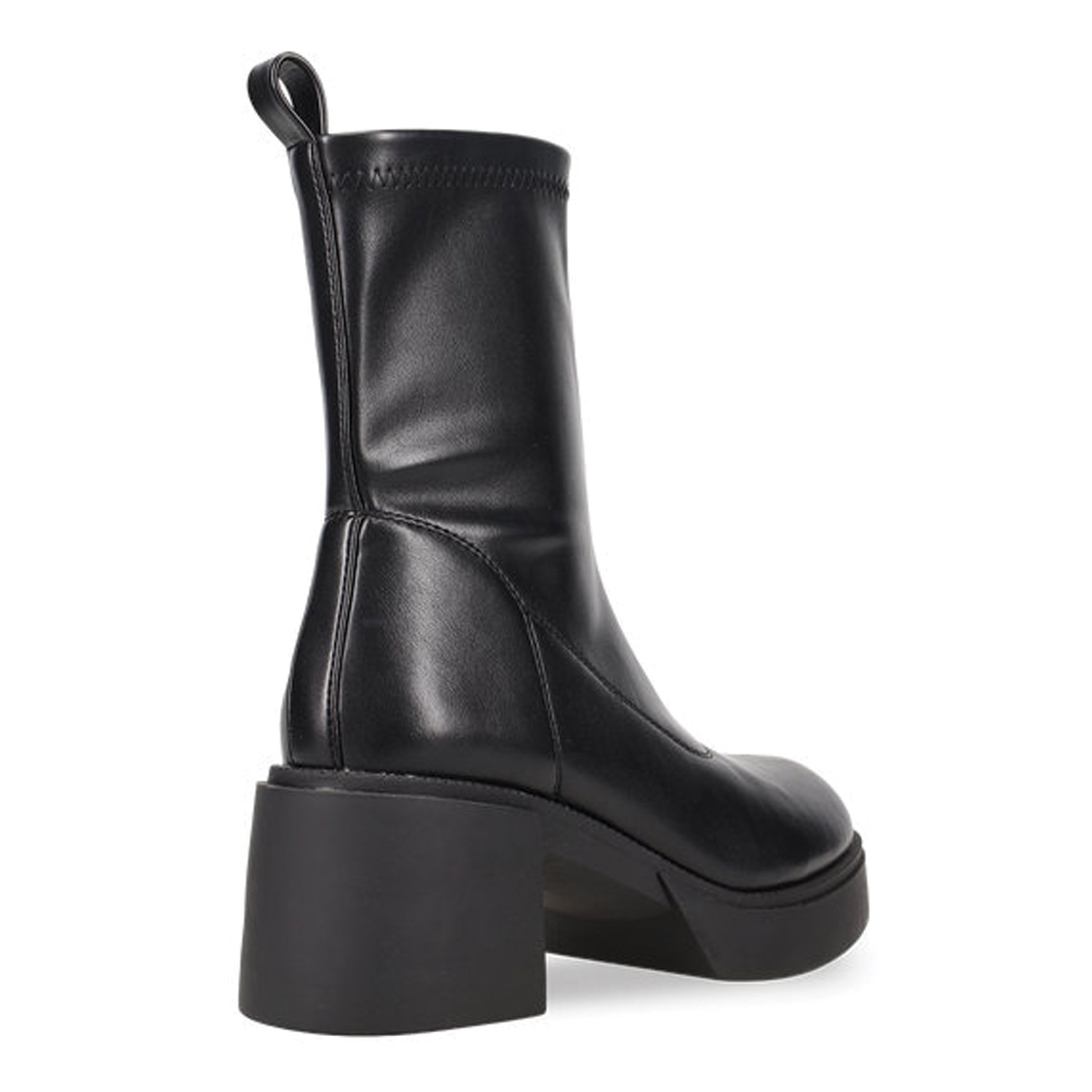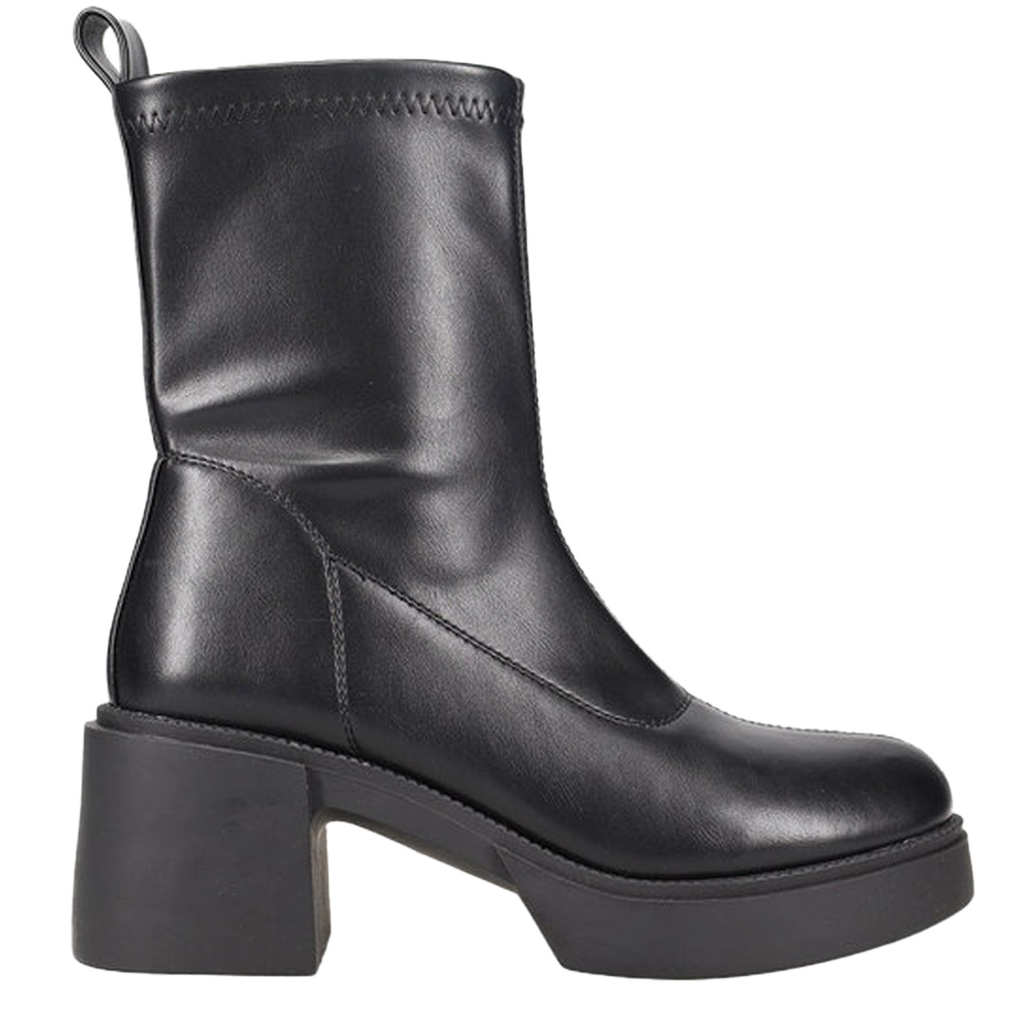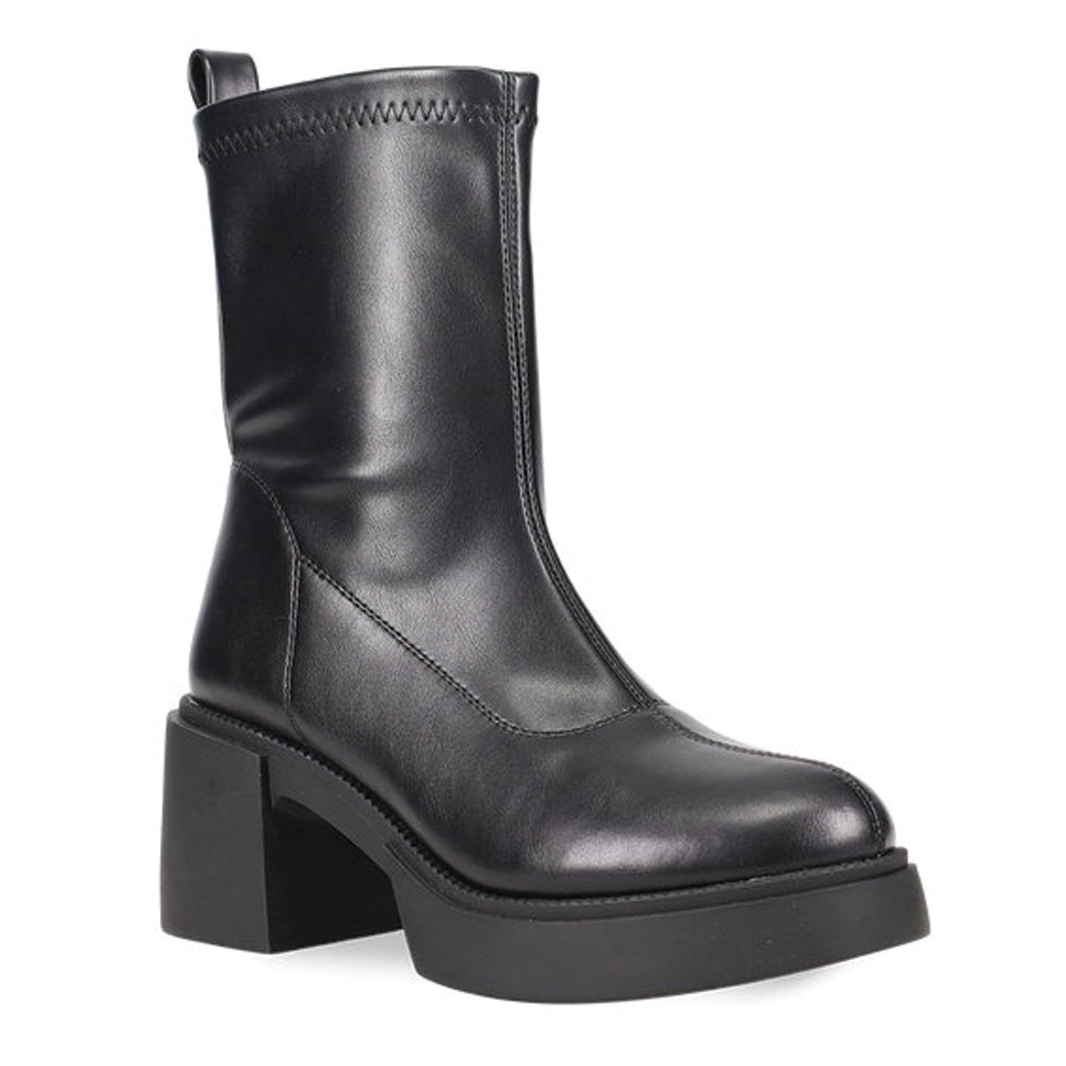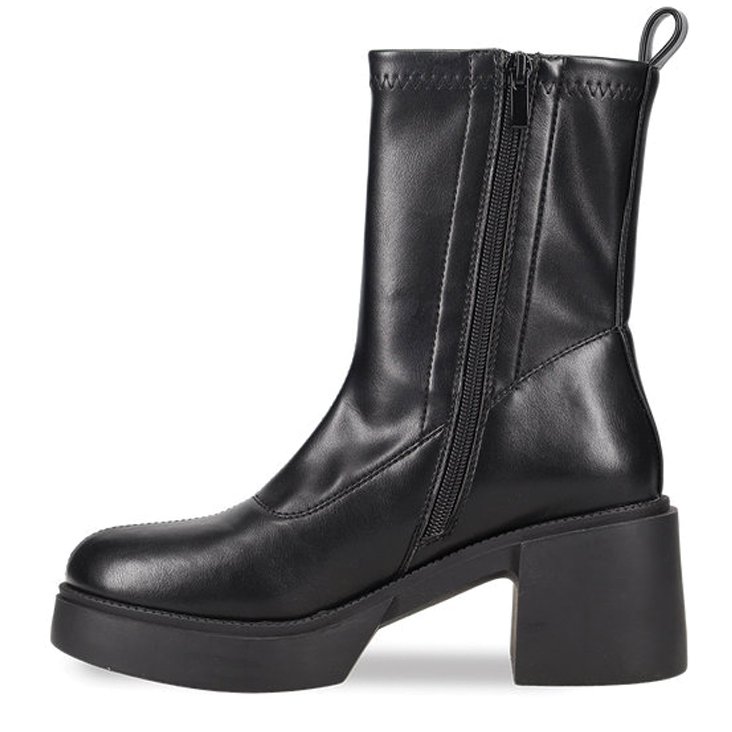Μαύρο μποτάκι με ελαστική όψη. Διαθέτει χοντρή σόλα και ψηλό χοντρό τακούνι. Κλείνει με φερμουάρ στο πλάι.