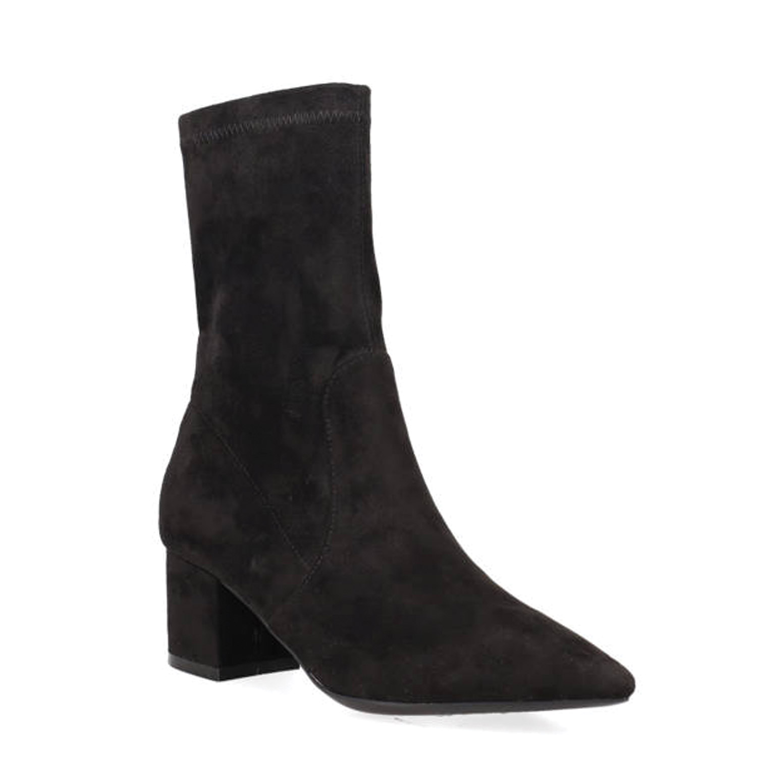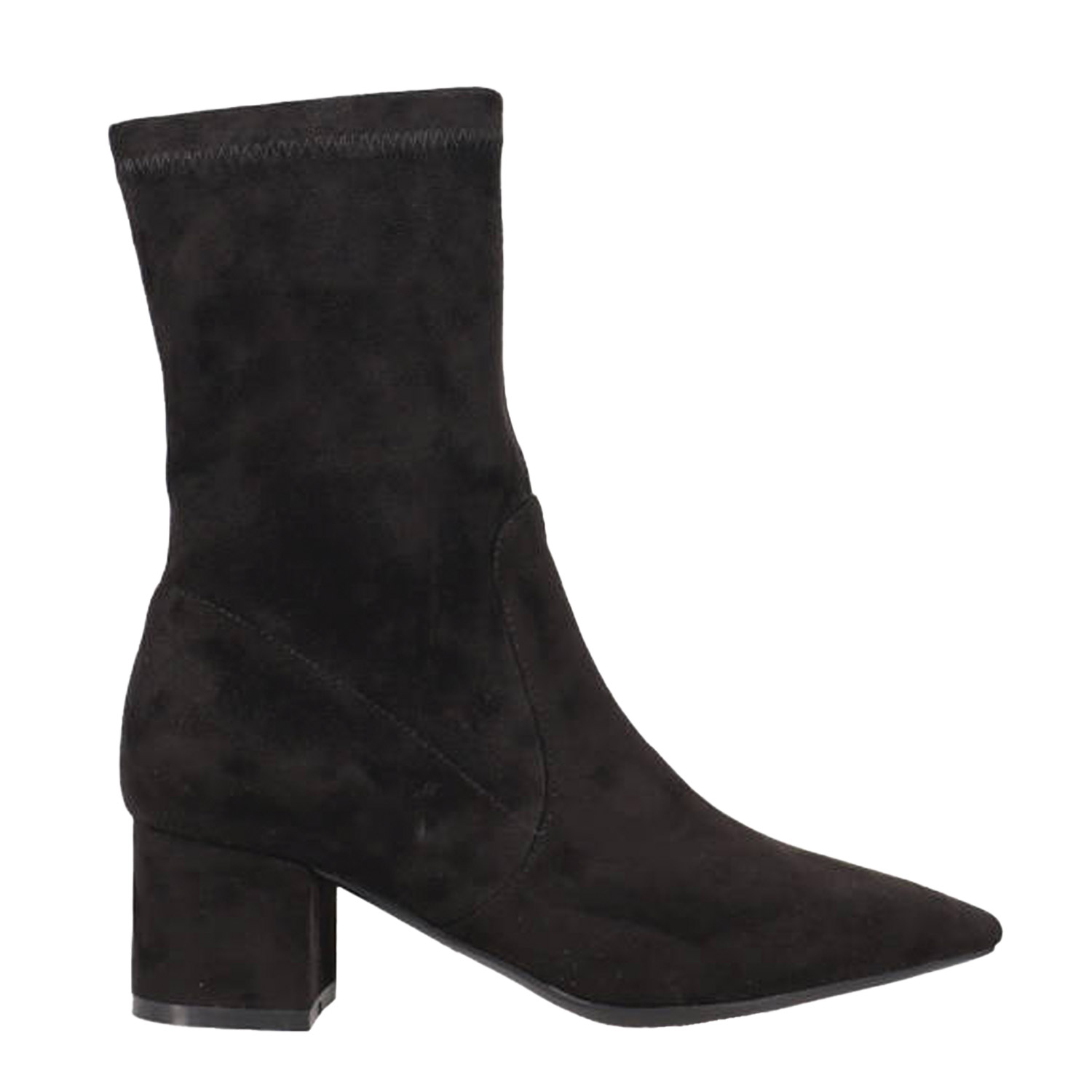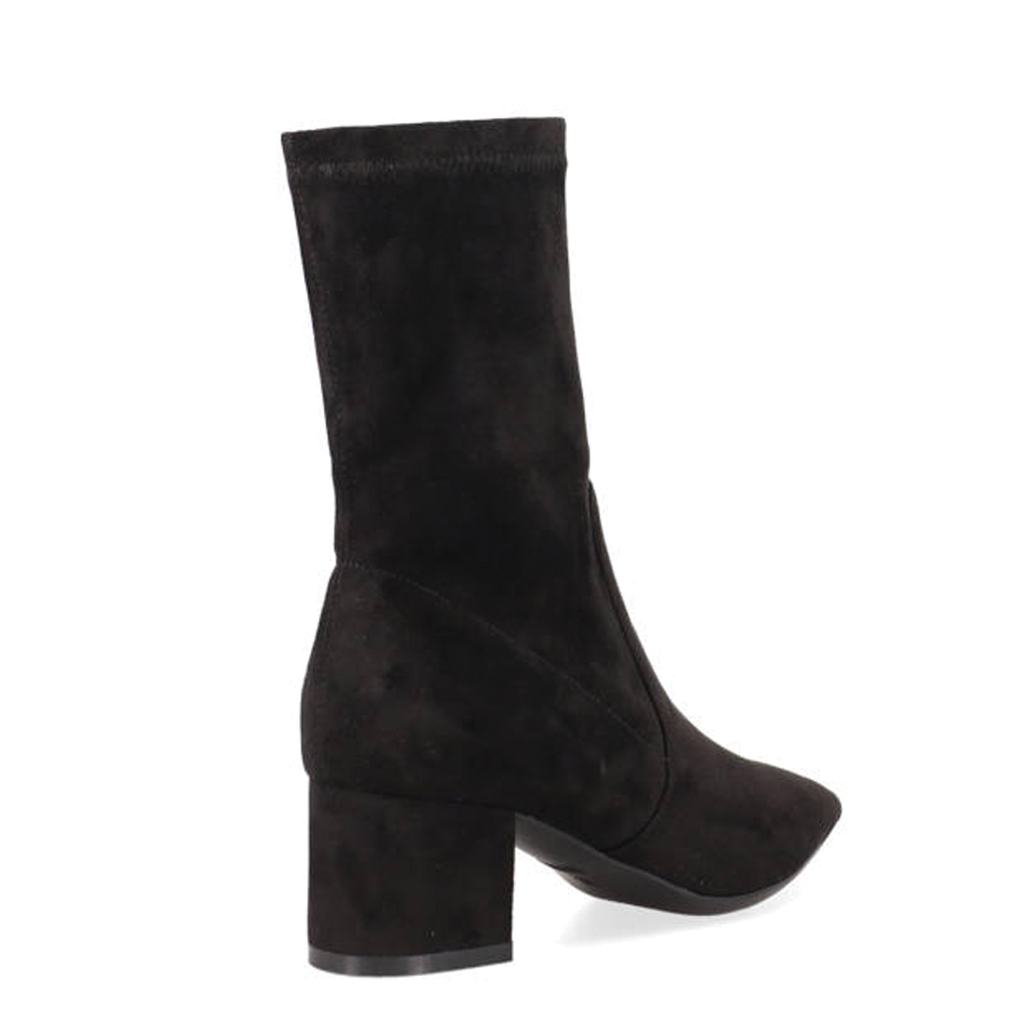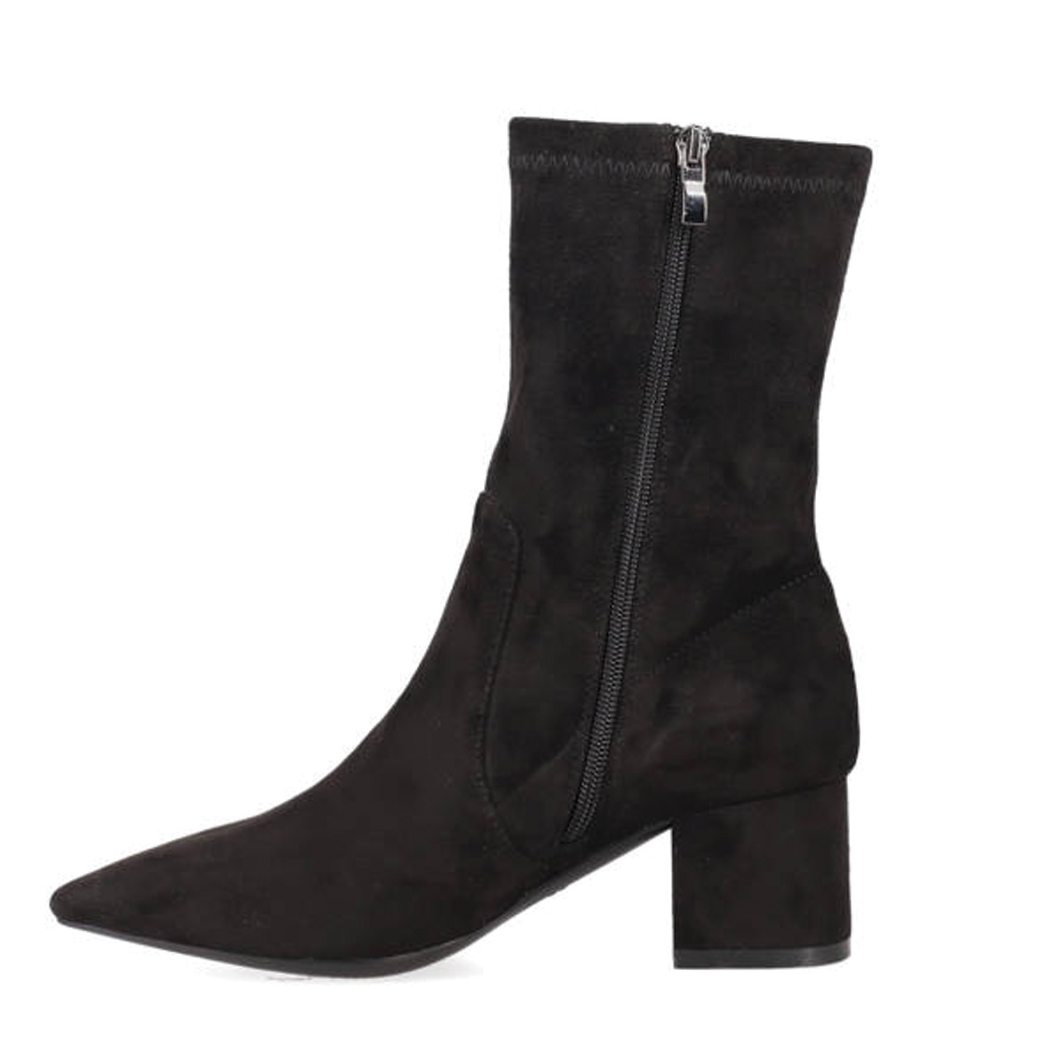 Μαύρο καστόρι μποτάκι μέχρι τη μέση της γάμπας. Διαθέτει μυτερή φόρμα και μεσαίο χοντρό τακούνι. Κλείνει με φερμουάρ.