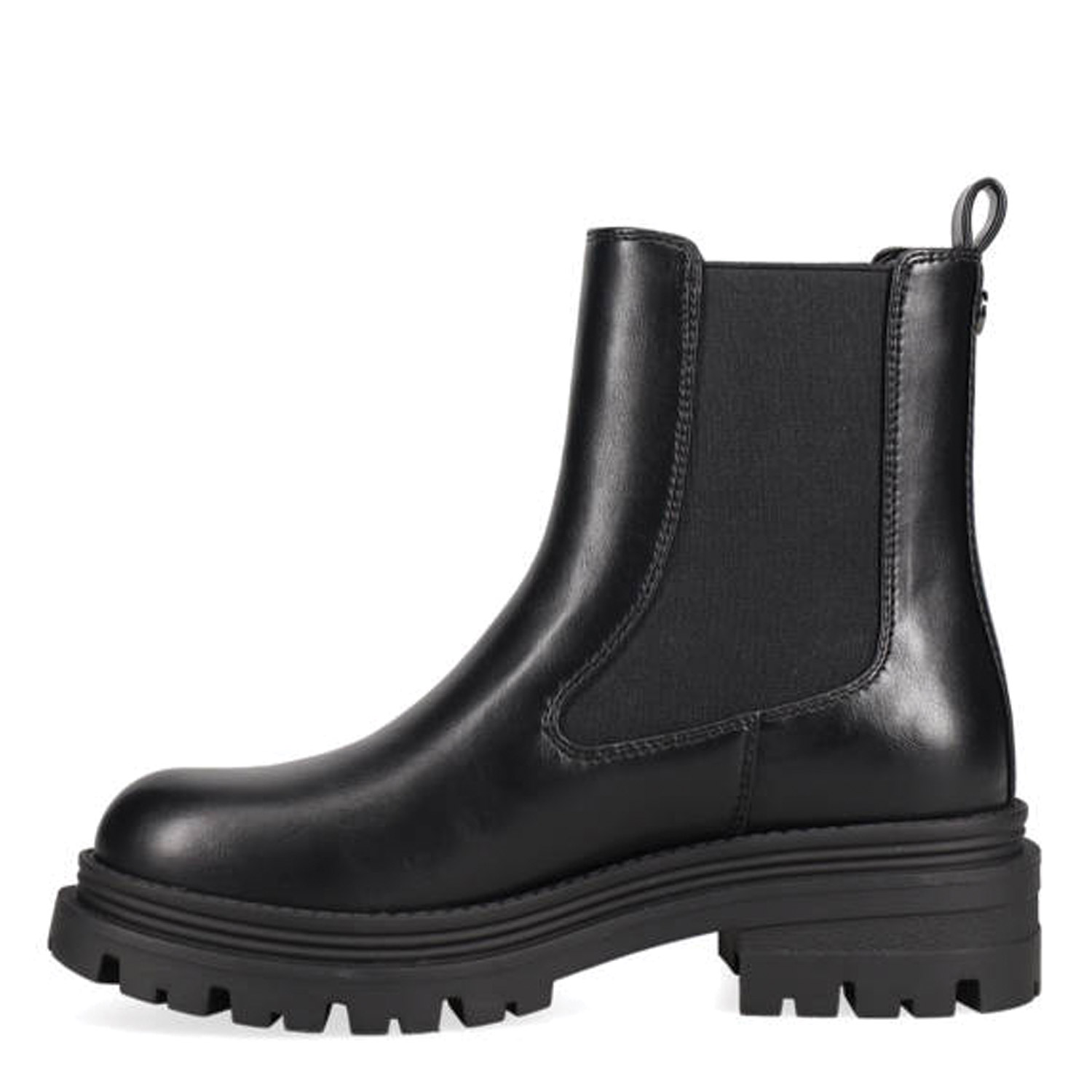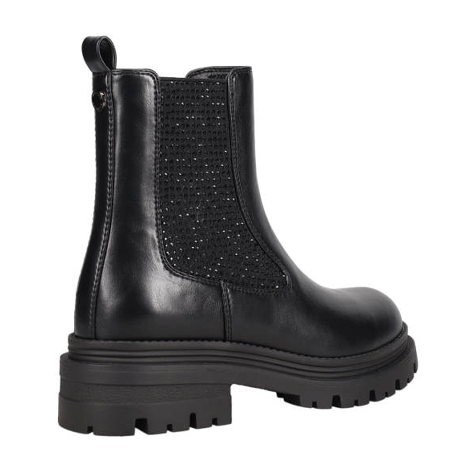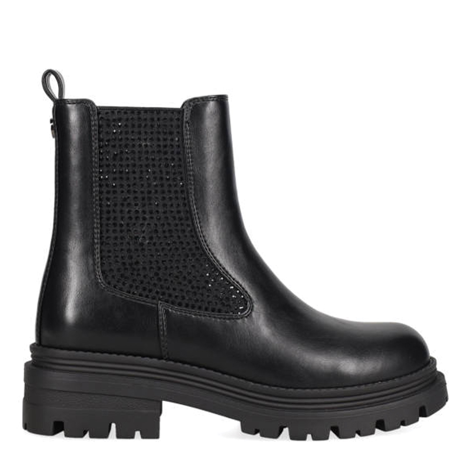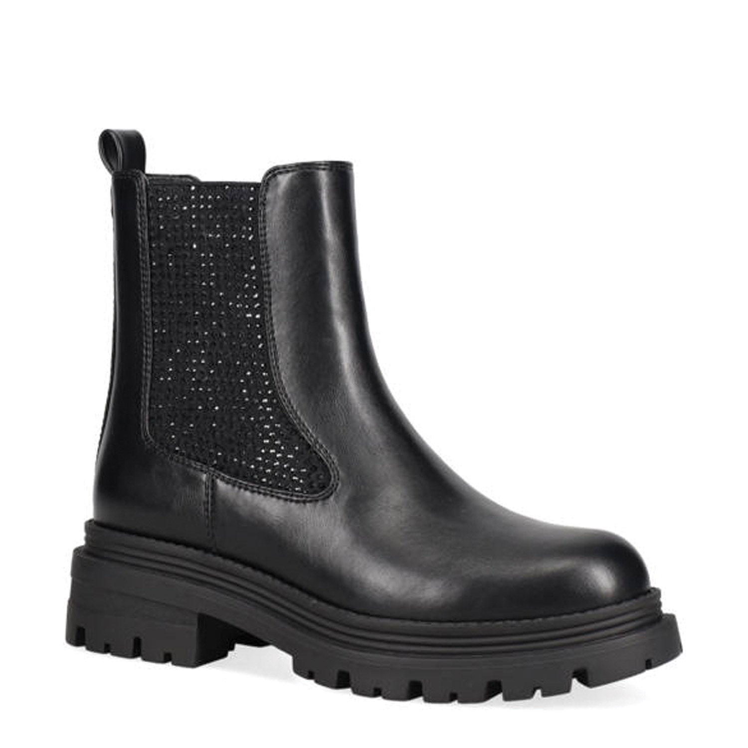 Μαύρο μποτάκι. Διαθέτει διακοσμητικά στρας, ελαστικά πλαϊνά και τρακτερωτή σόλα.