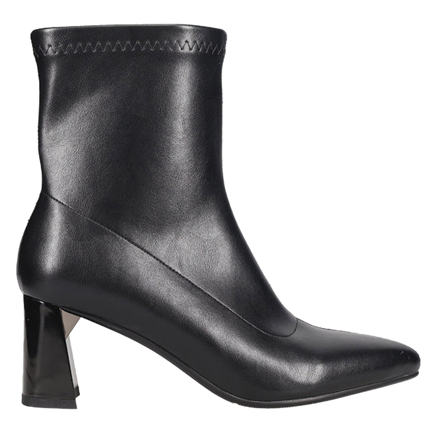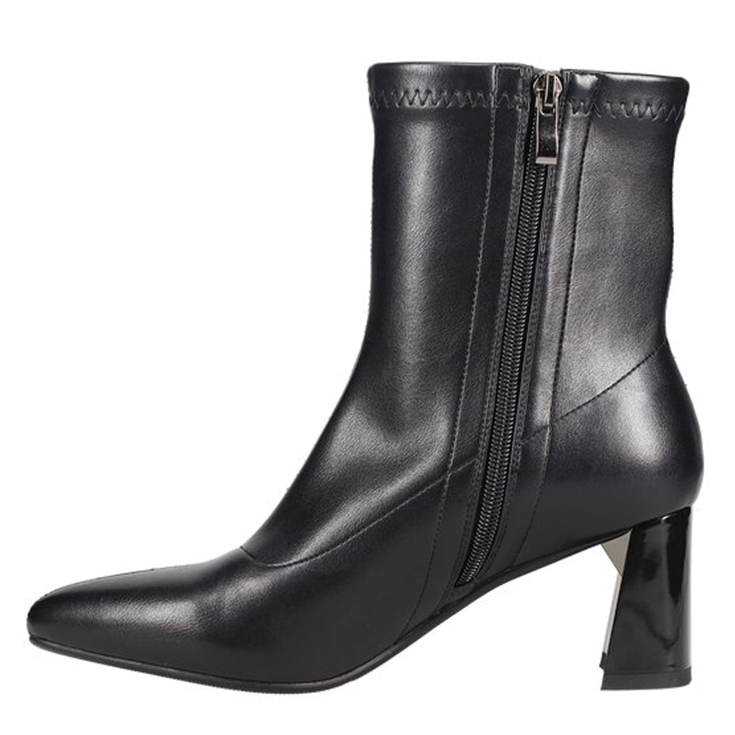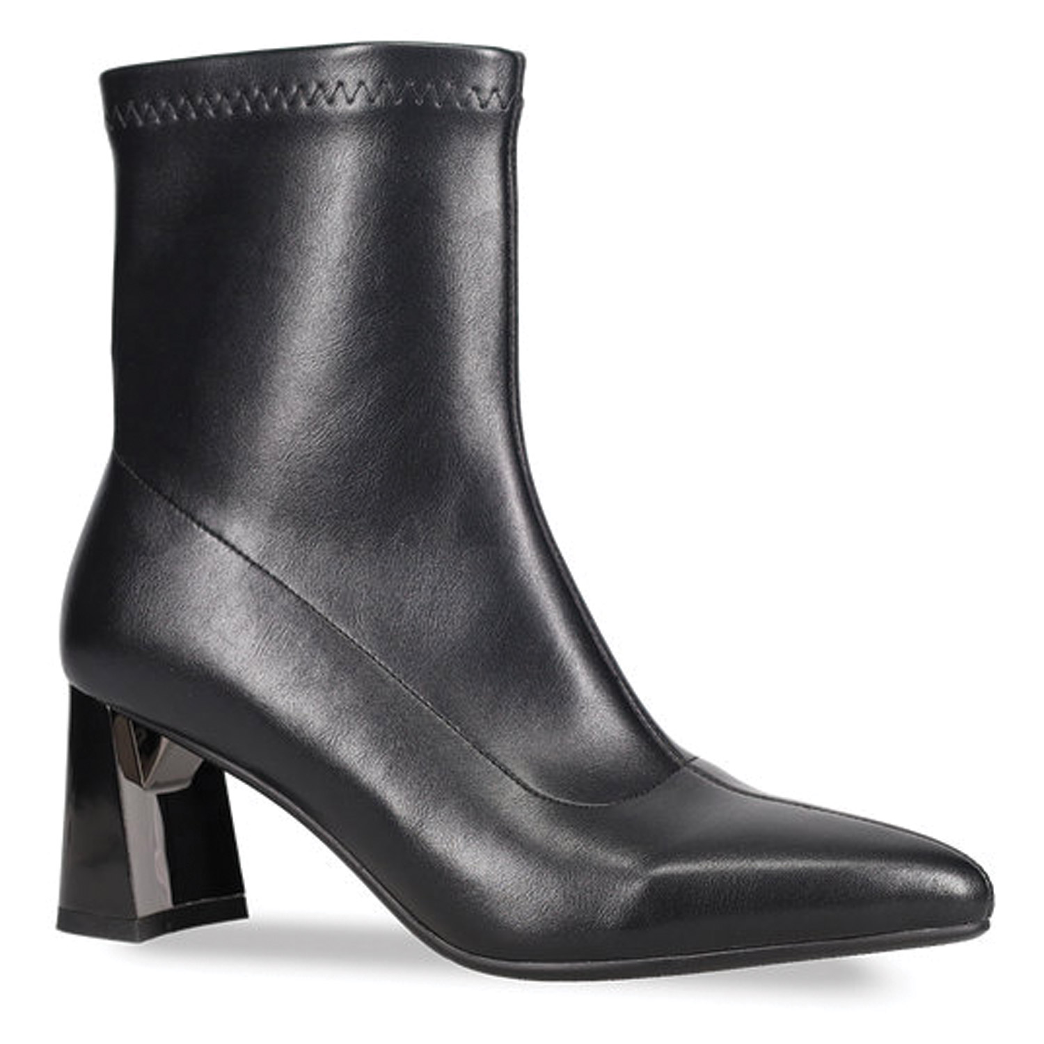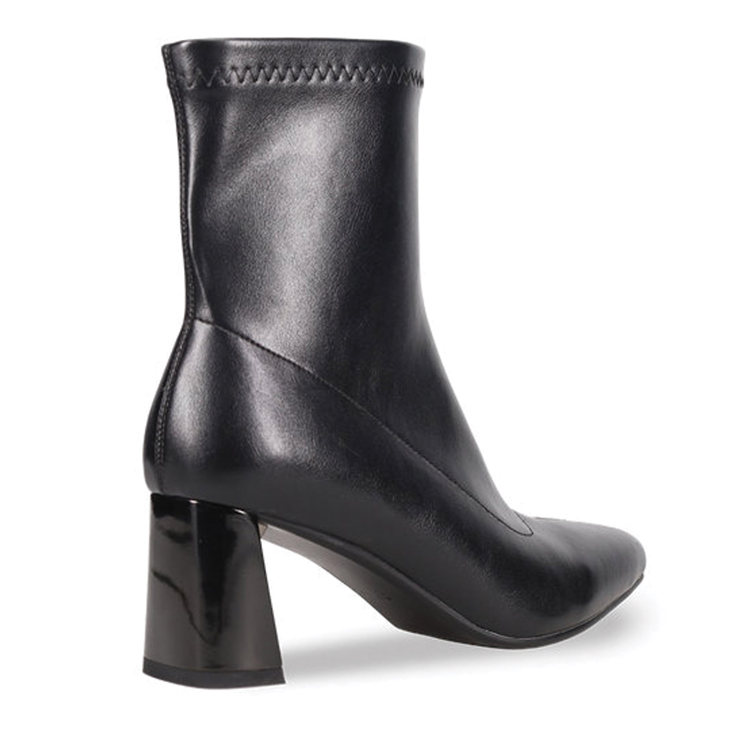 Μαύρο μποτάκι μέχρι πάνω από τον αστράγαλο. Διαθέτει χοντρό τακούνι. Κλείνει με φερμουάρ στο πλάι.