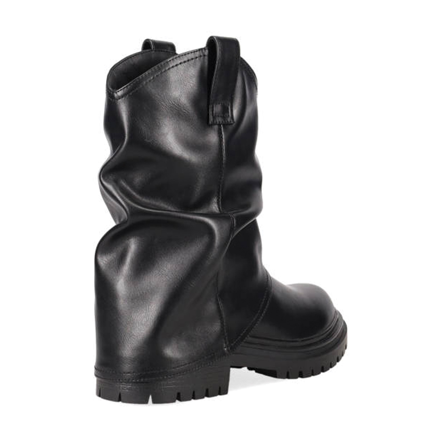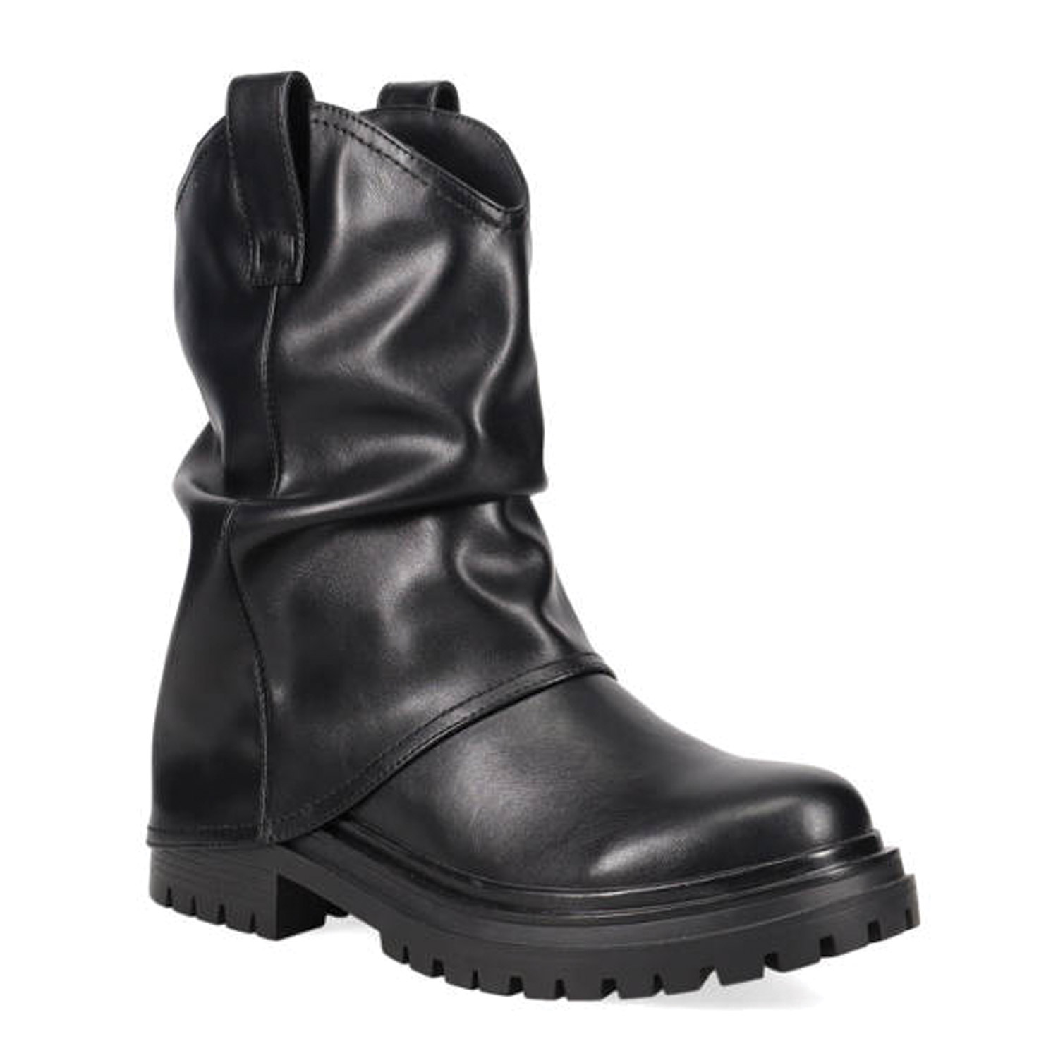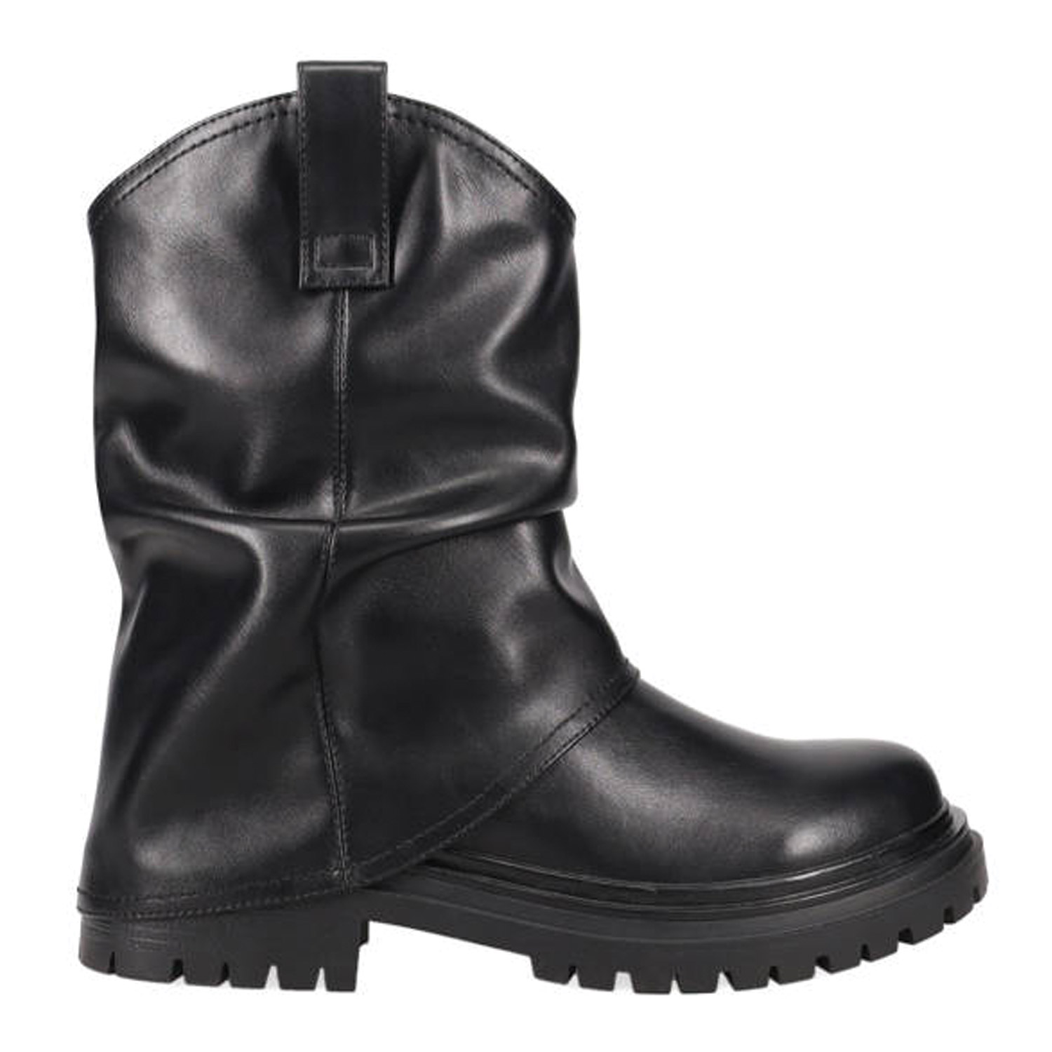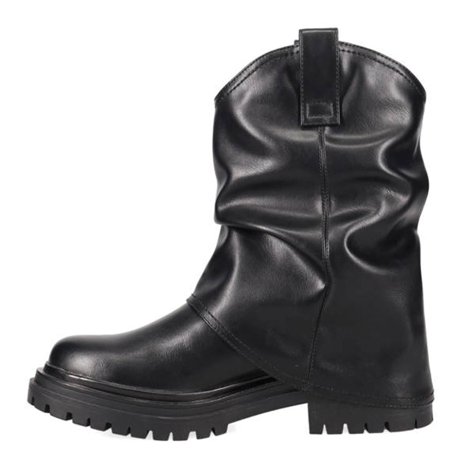 Μαύρο μποτάκι με γκέτα μέχρι πάνω από τον αστράγαλο. Διαθέτει χαμηλό χοντρό τακούνι και θηλάκια για πιο εύκολη εφαρμογή.