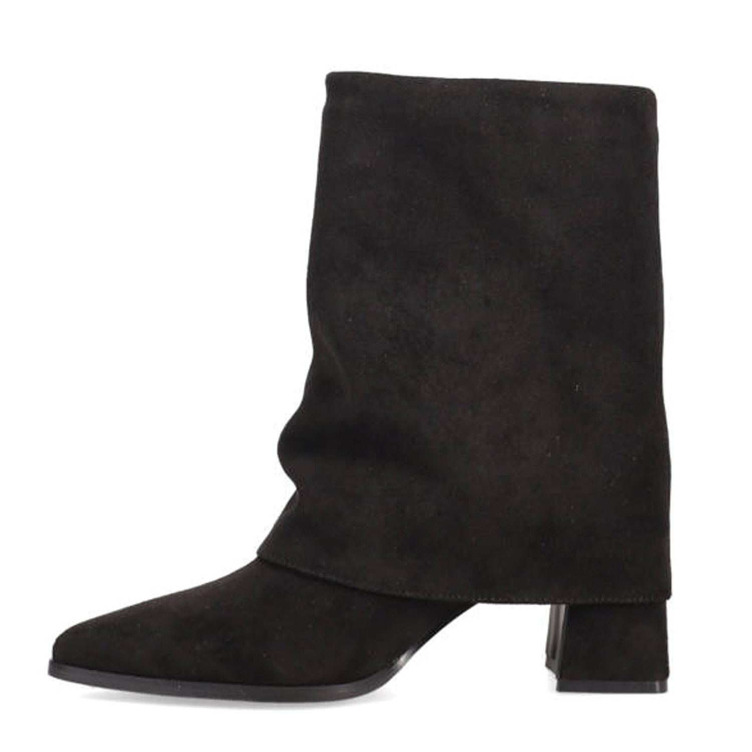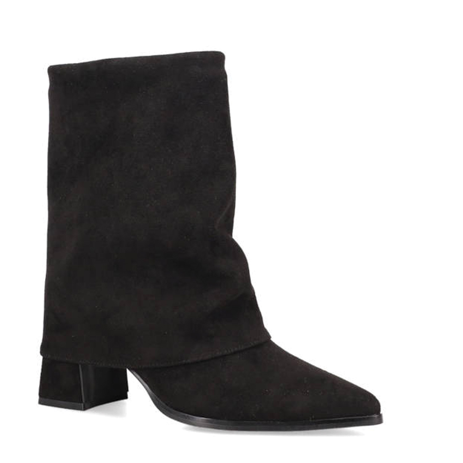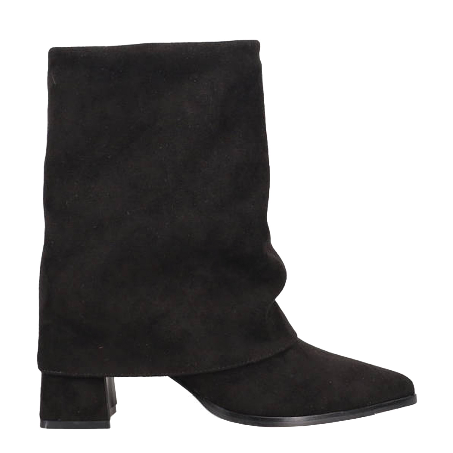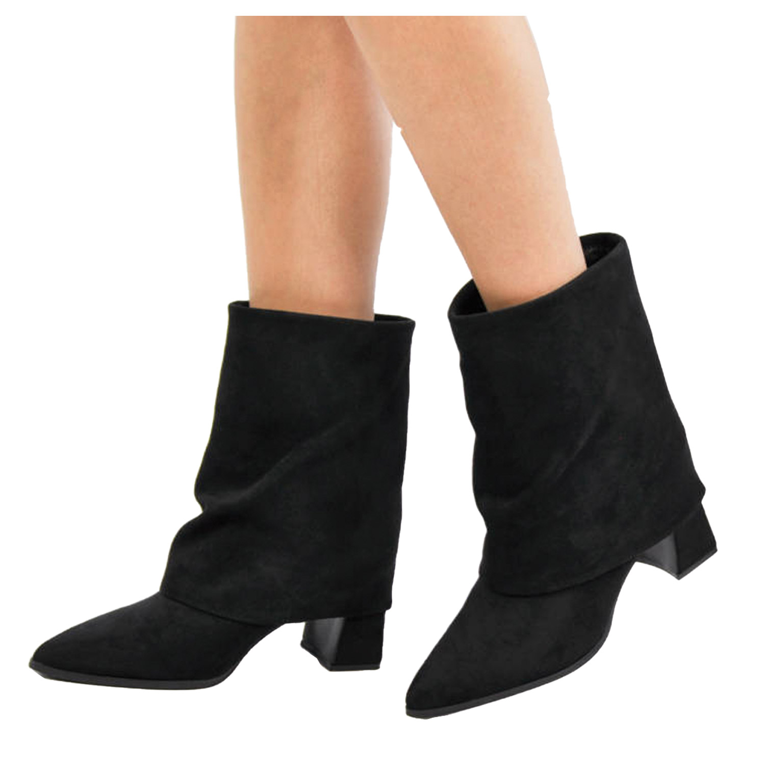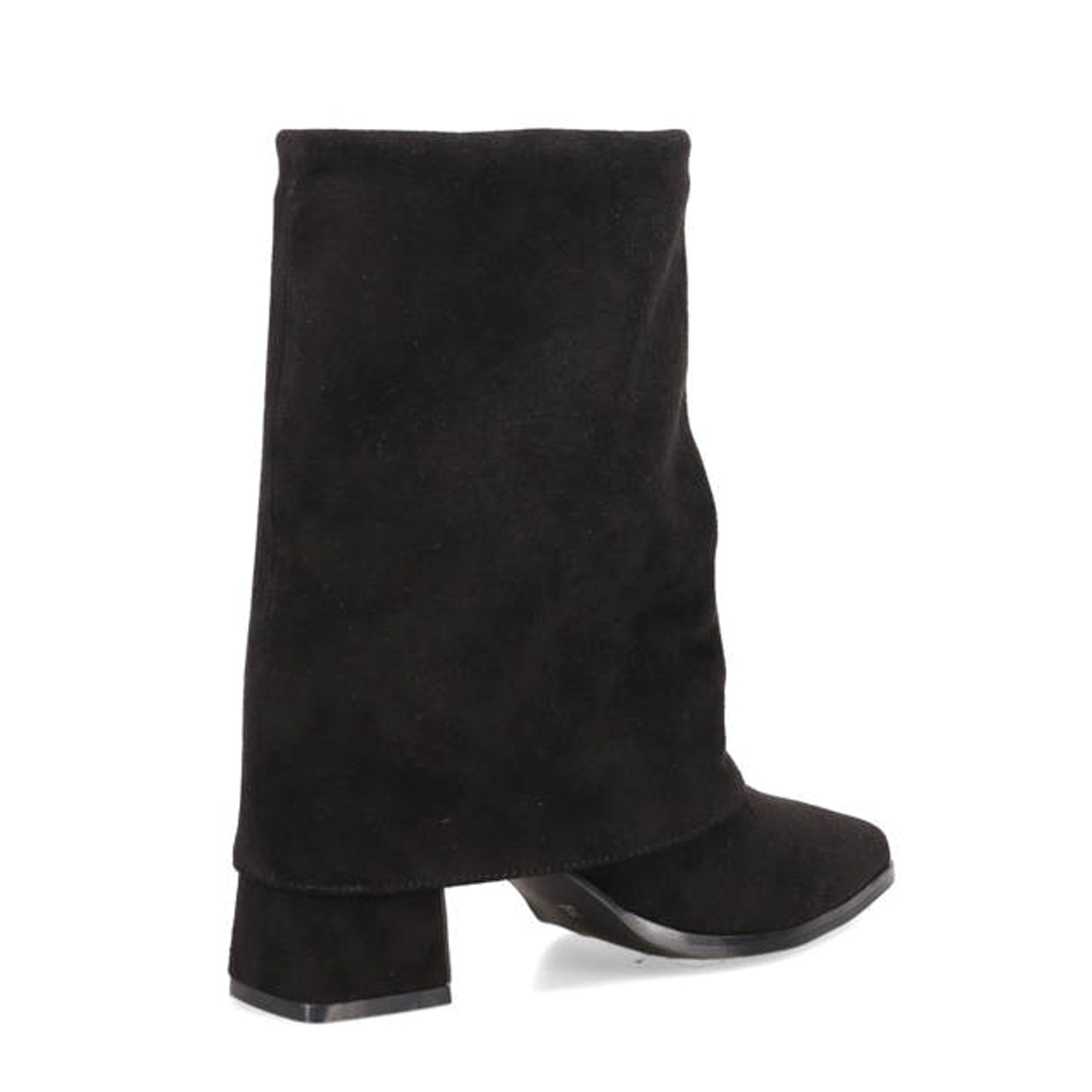 Μαύρο μποτάκι με γκέτα. Διαθέτε σουέντ υφή και μεσαίο χοντρό τακούνι.