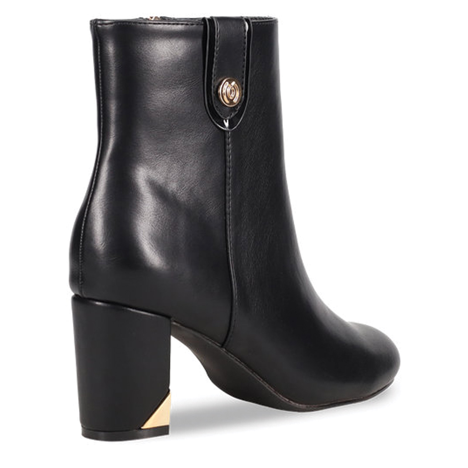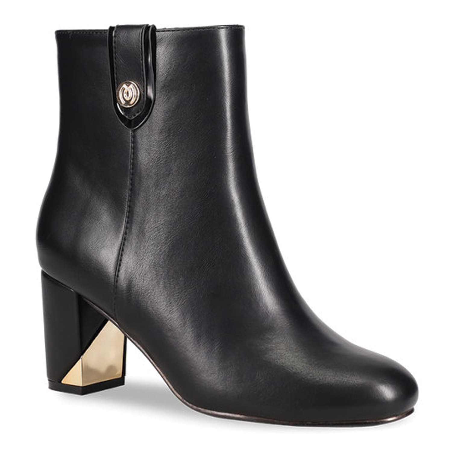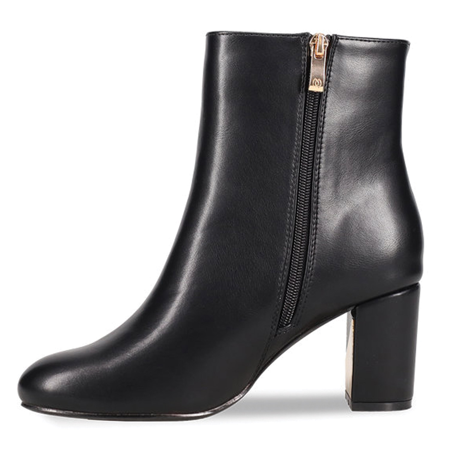 Μαύρο μποτάκι μέχρι πάνω από τον αστράγαλο. Διαθέτει χοντρό τακούνι μεσαίου ύψους με χρυσή λεπτομέρεια. Κλείνει με φερμουάρ στο πλάι.