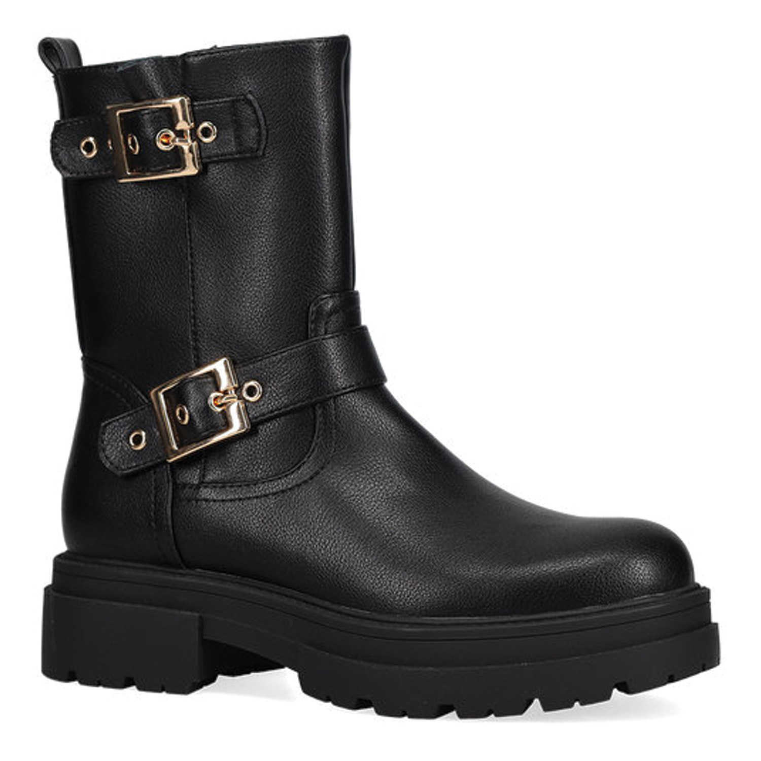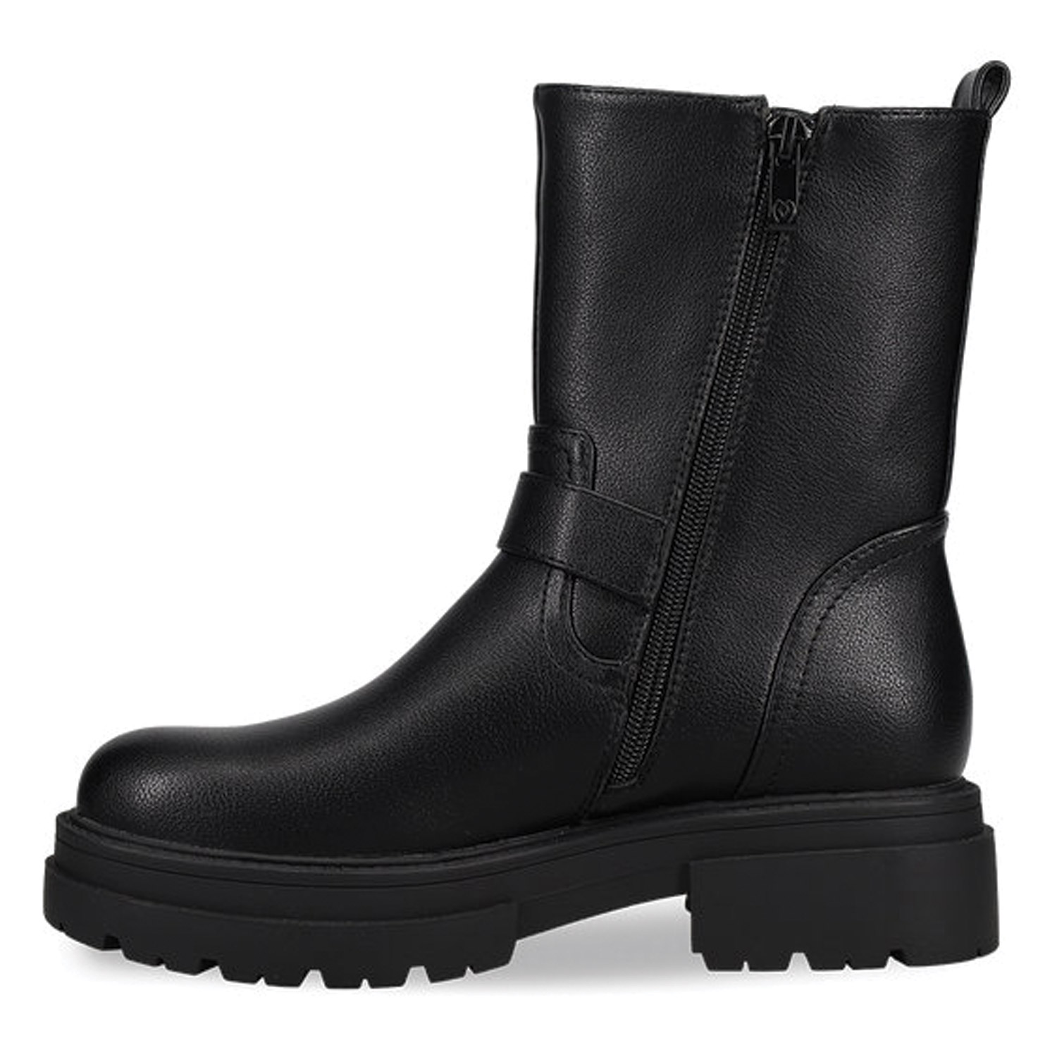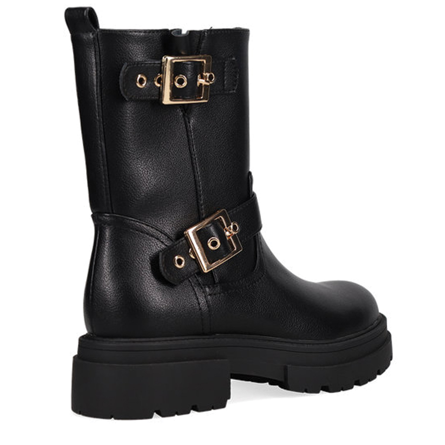 Μαύρο μποτάκι biker μέχρι τη μέση της γάμπας. Διαθέτει διακοσμητικά λουράκια με αγκράφες. Κλείνει με φερμουάρ στο πλάι.