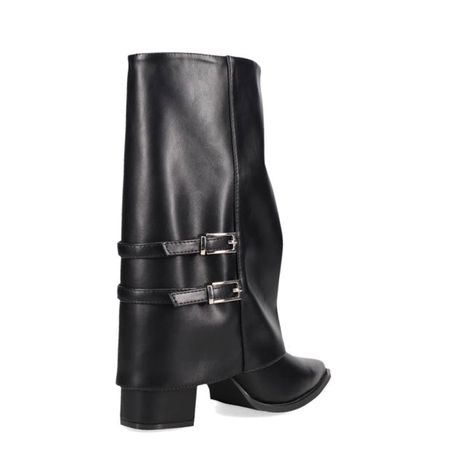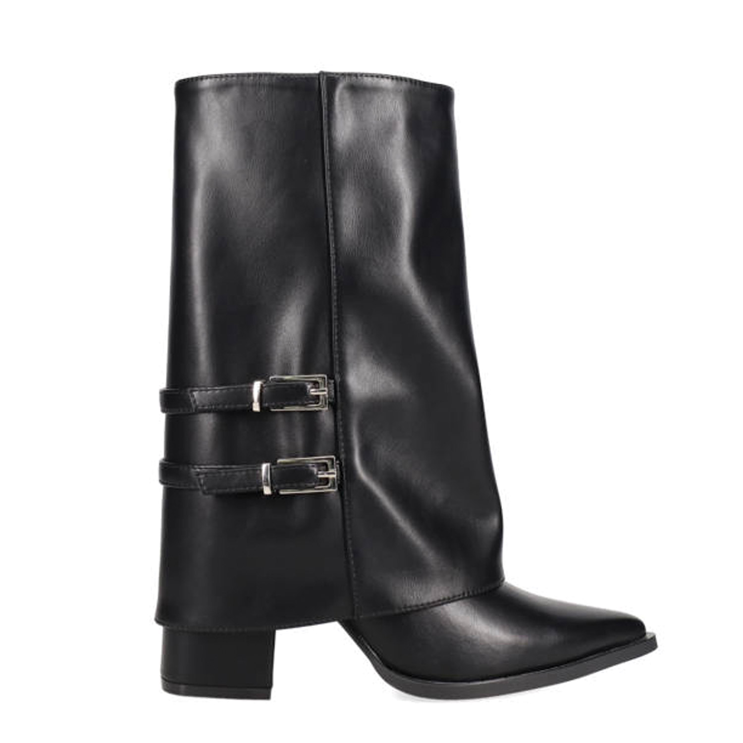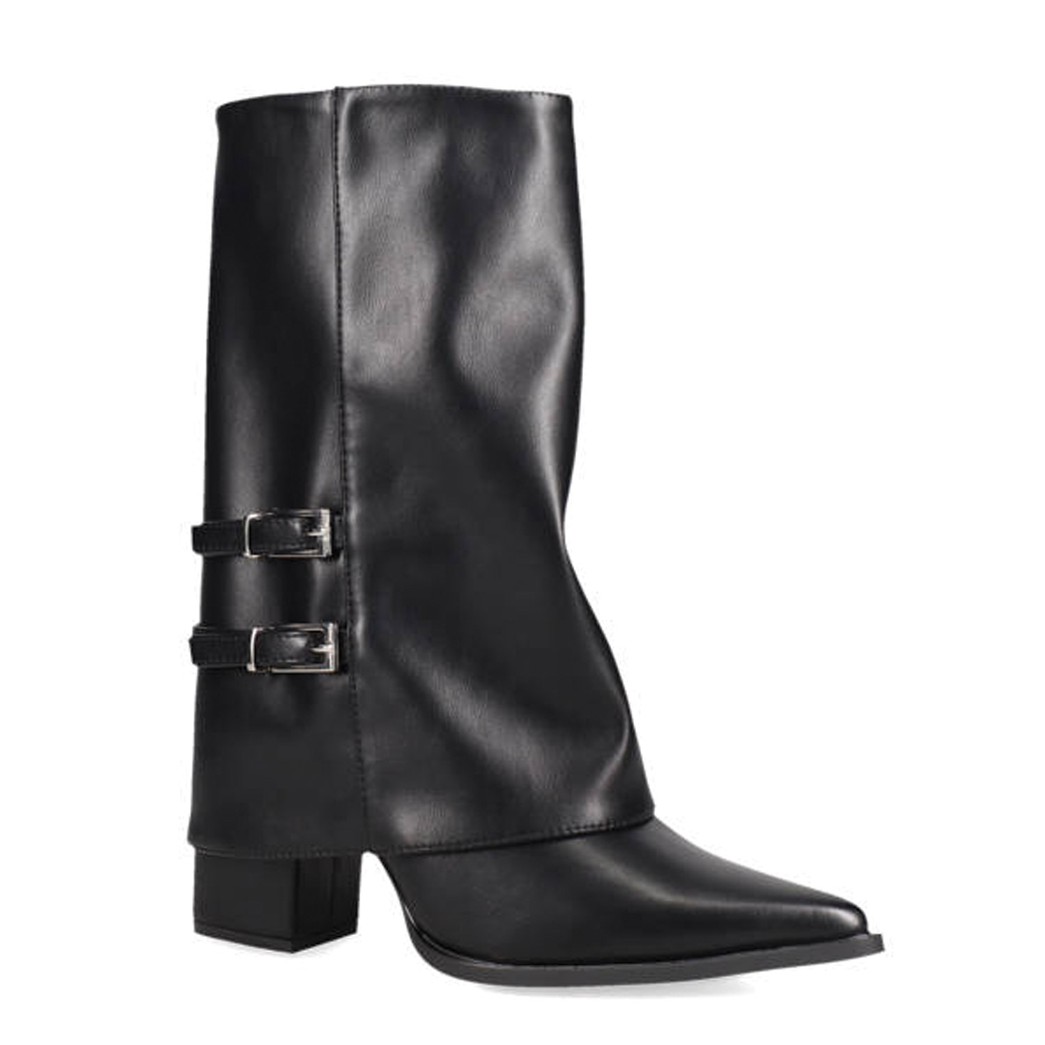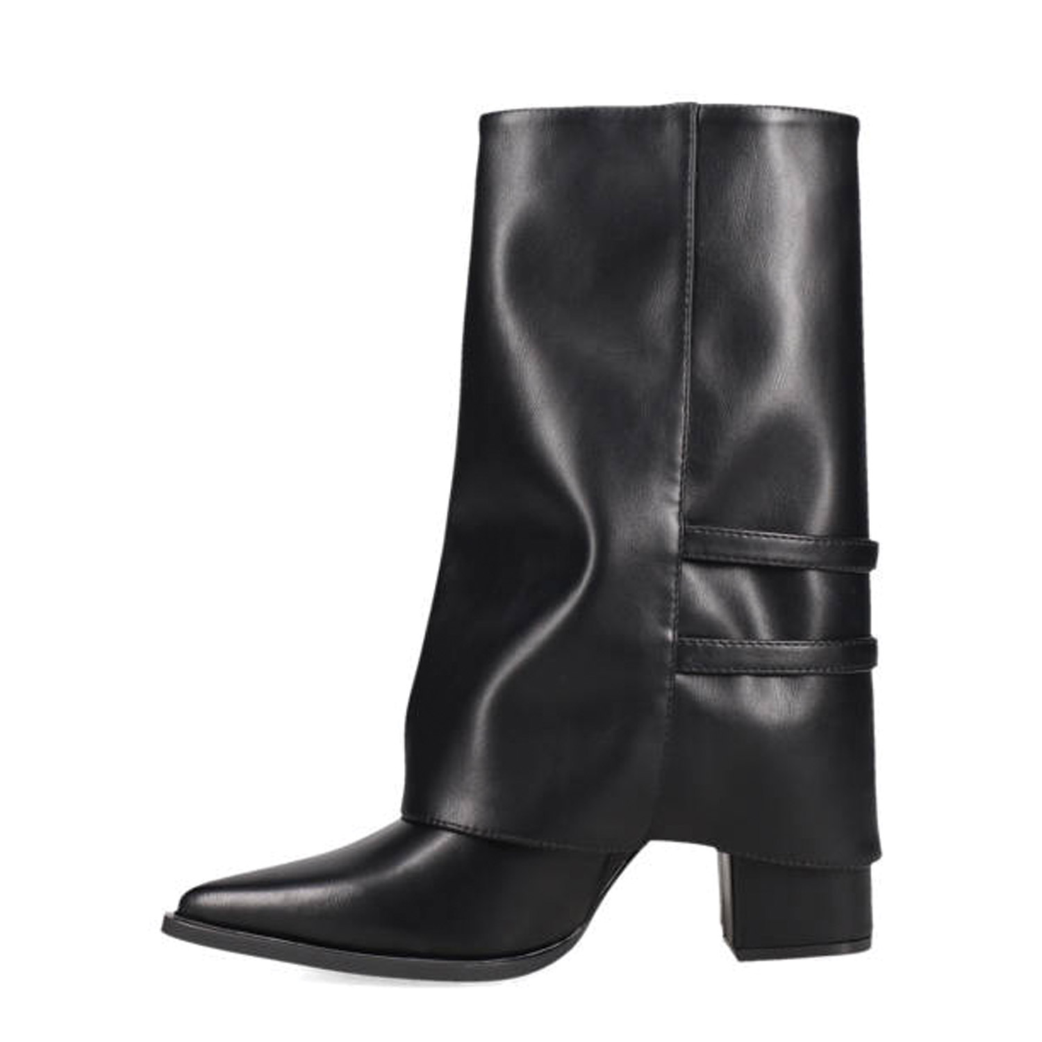 Μαύρη μπότα με γκέτα. Διαθέτει μυτερή φόρμα και ψηλό χοντρό τακούνι.
