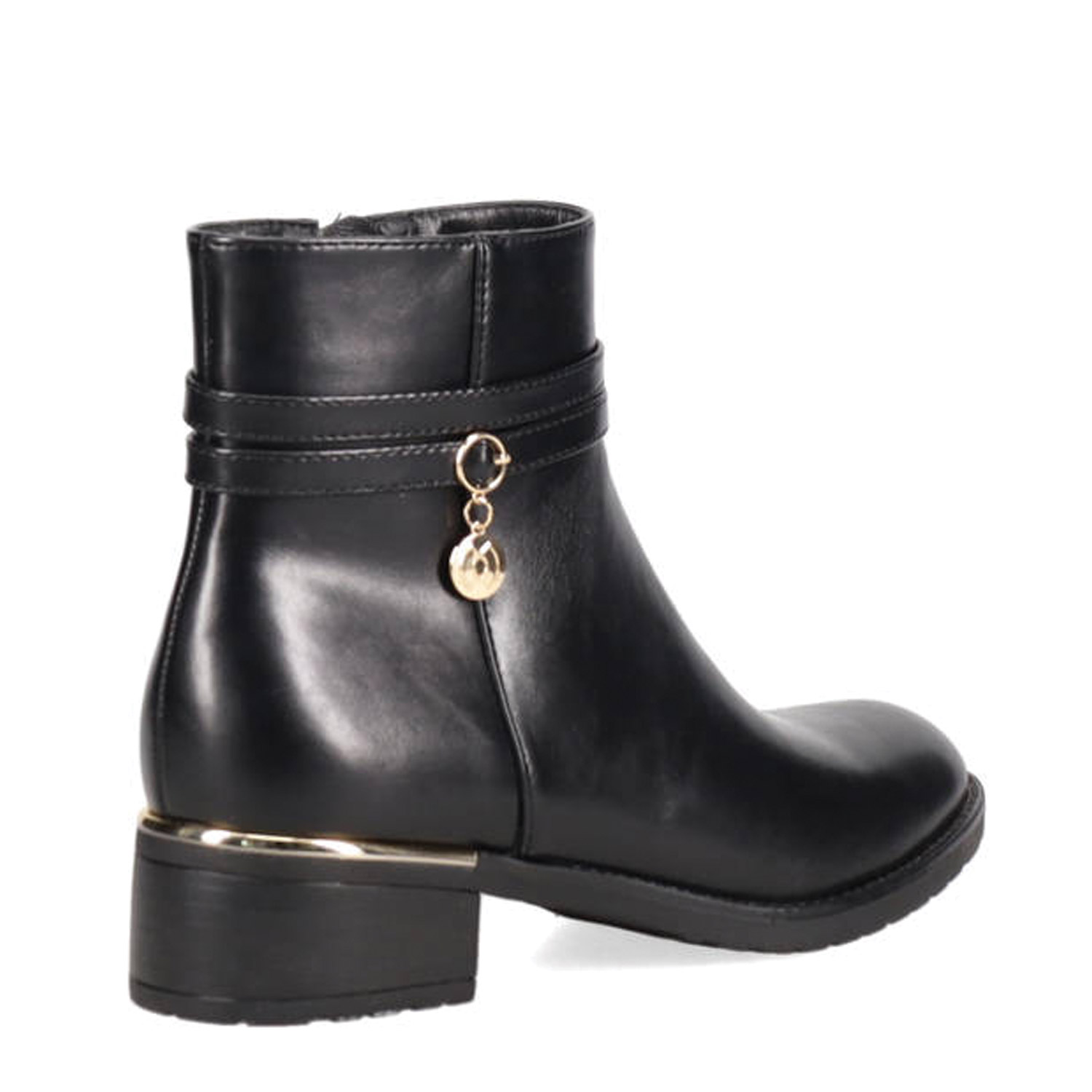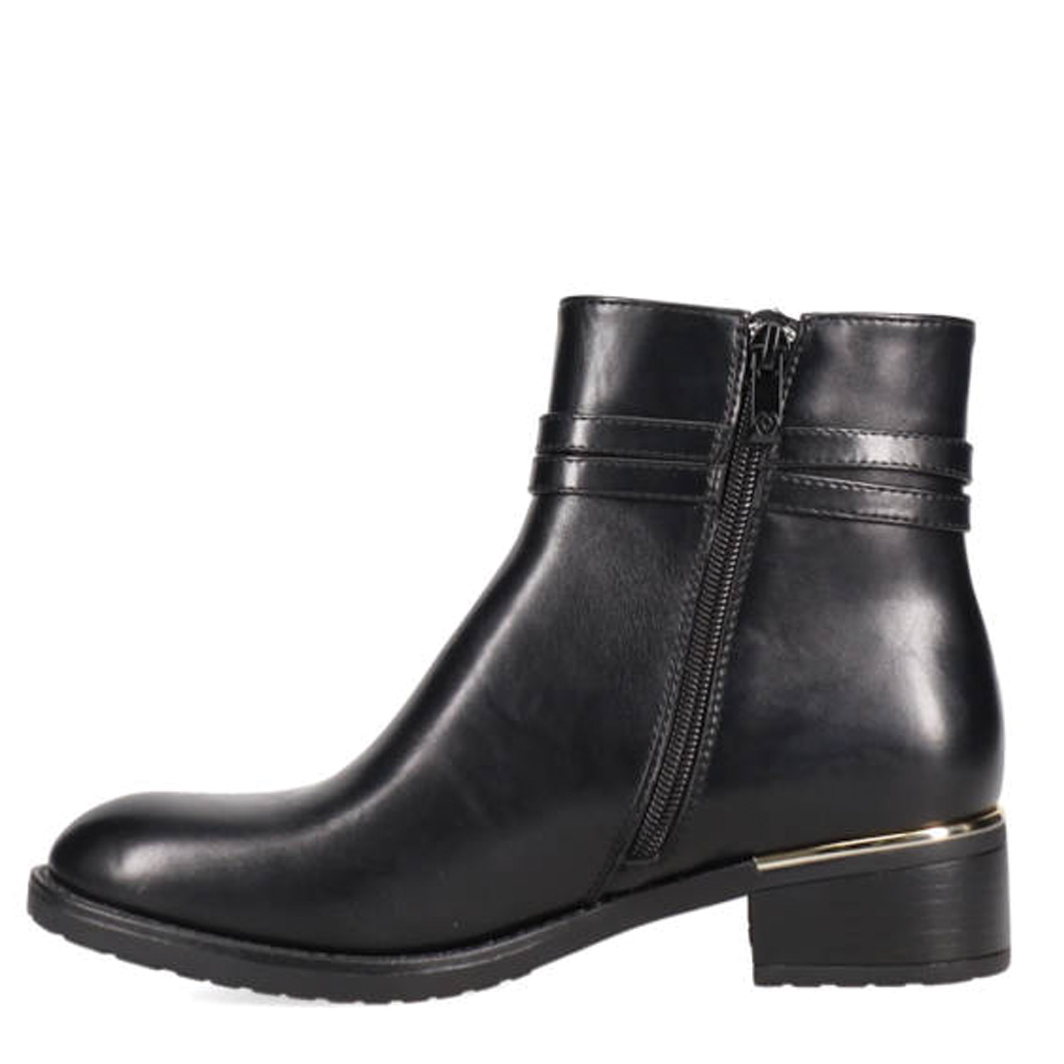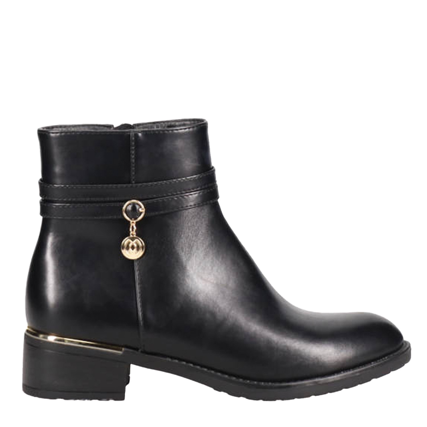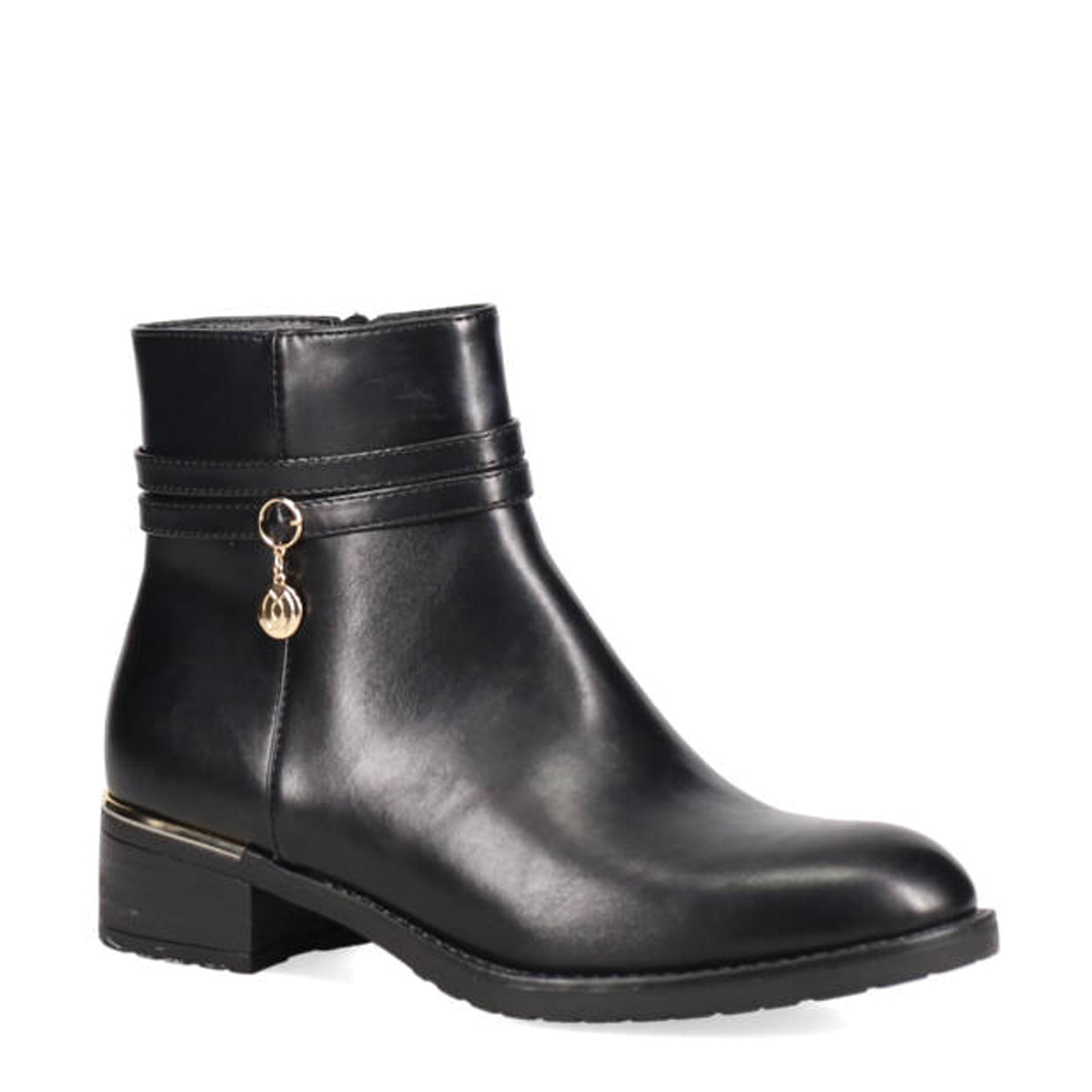 Μαύρο μποτάκι μέχρι πάνω από τον αστράγαλο. Διαθέτει χαμηλό χοντρό τακούνι. Κλείνει με φερμουάρ στο πλάι.