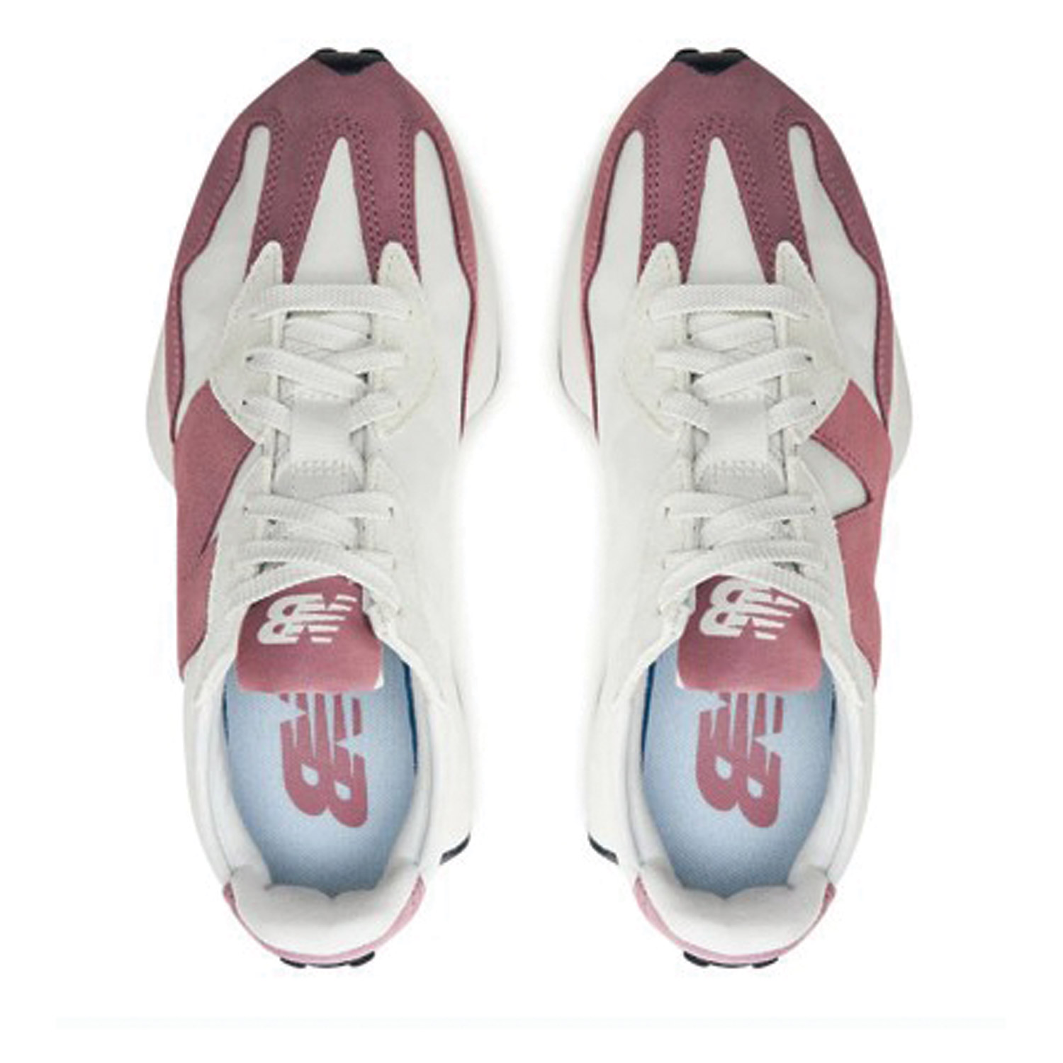 New Balance 327 γυναικείο sneaker, σε λευκό-μωβ χρώμα, κατασκευασμένο από ύφασμα και καστόρι. Ύψος σόλας 3εκ.