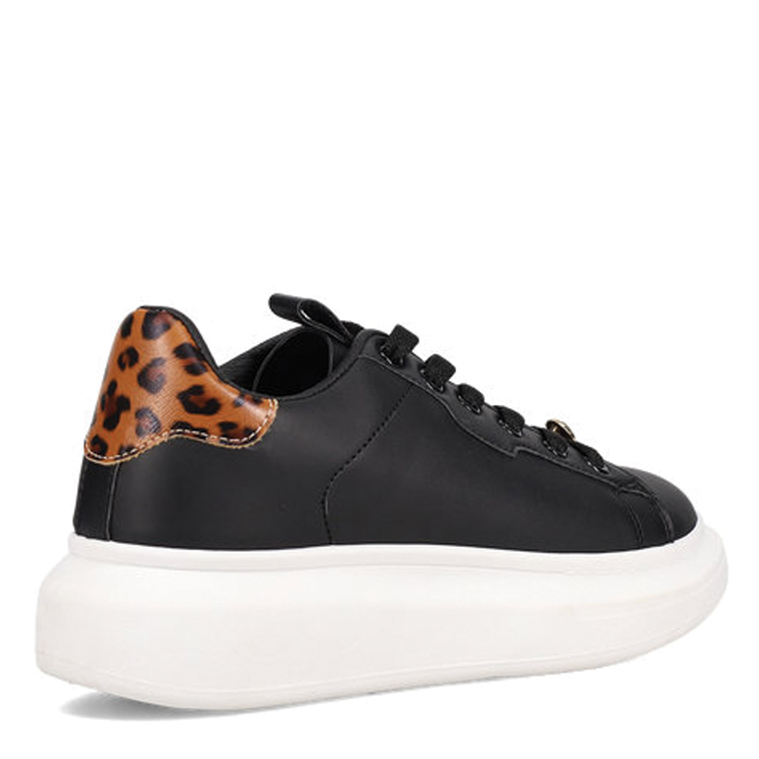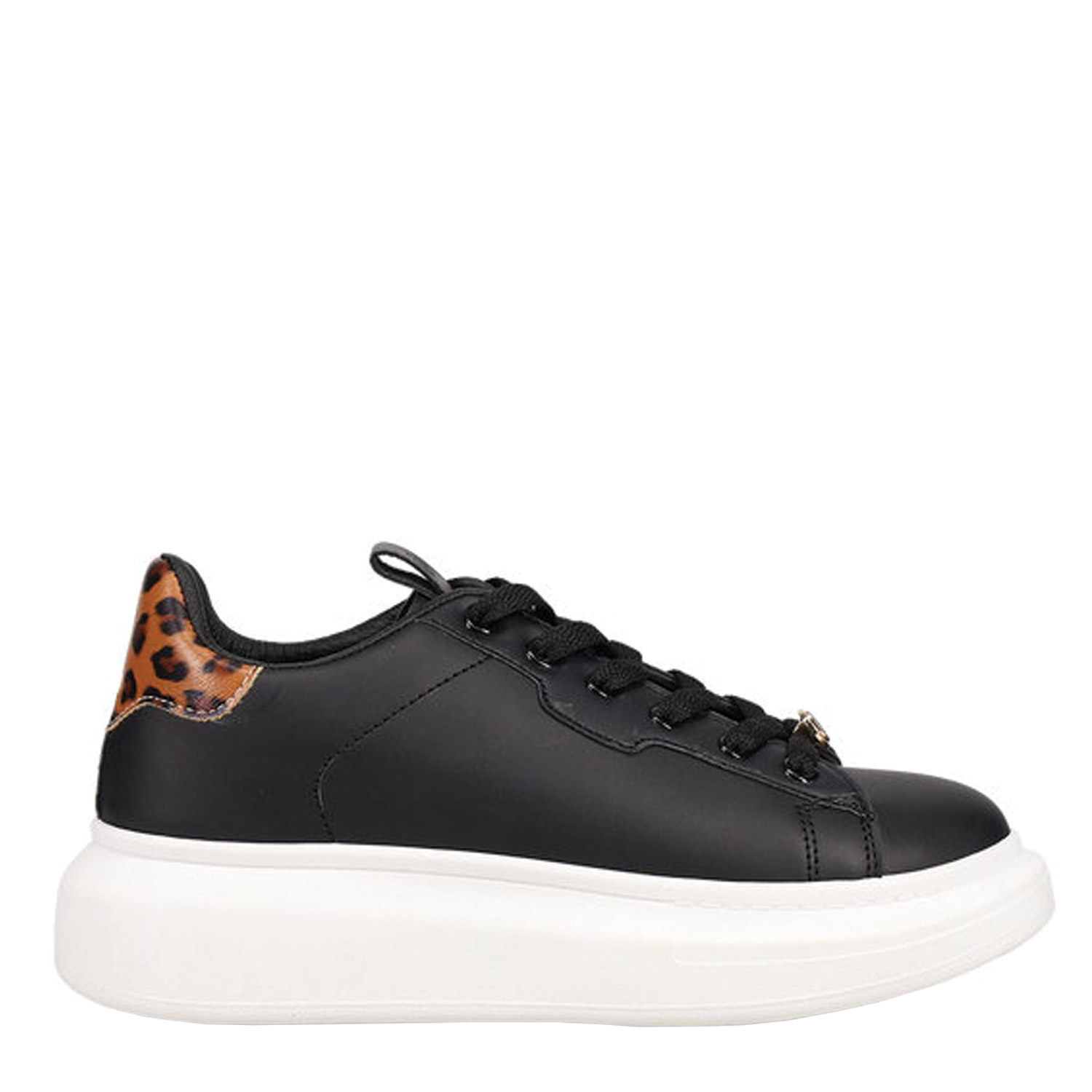 Γυναικείο sneaker σε μαύρο με λεοπάρ λεπτομέρεια στη φτέρνα. Δένει με κορδόνια.