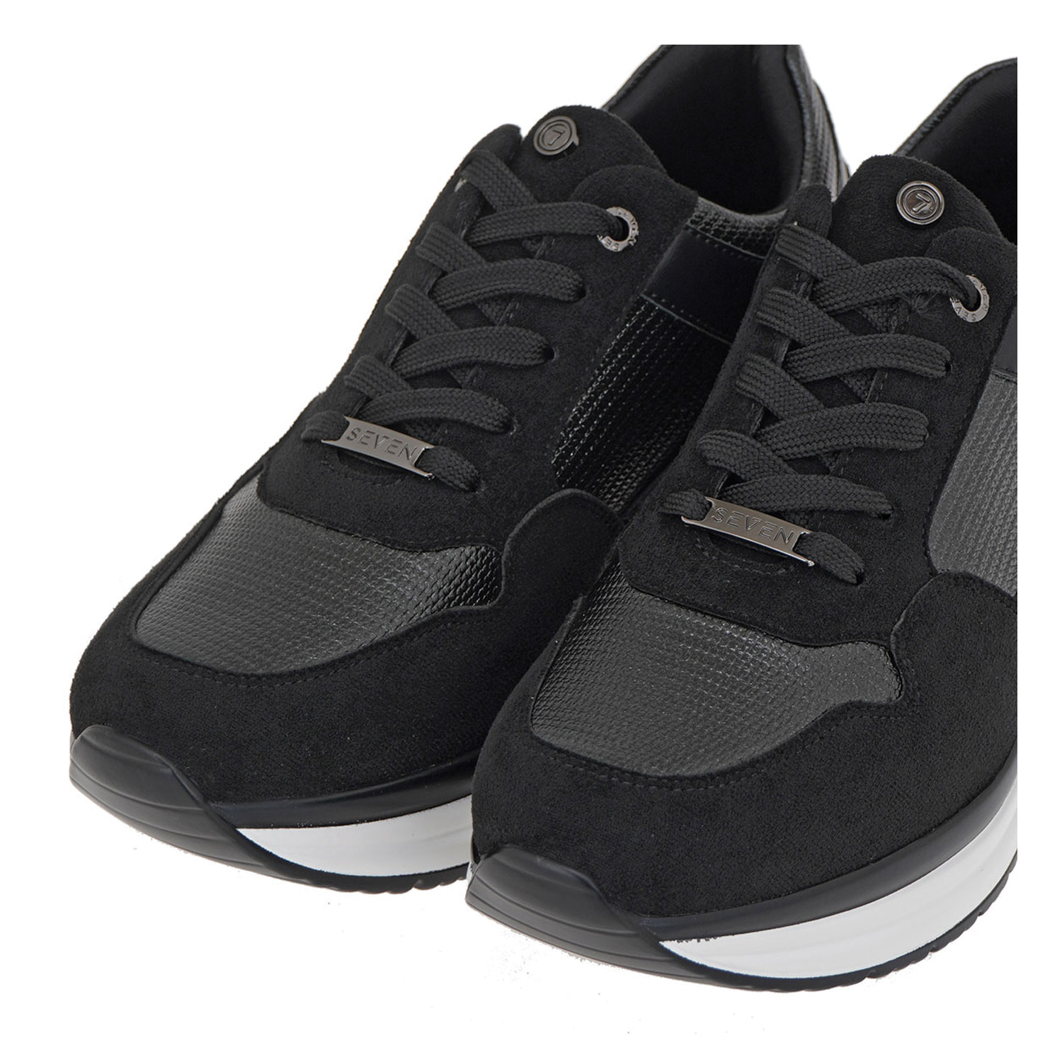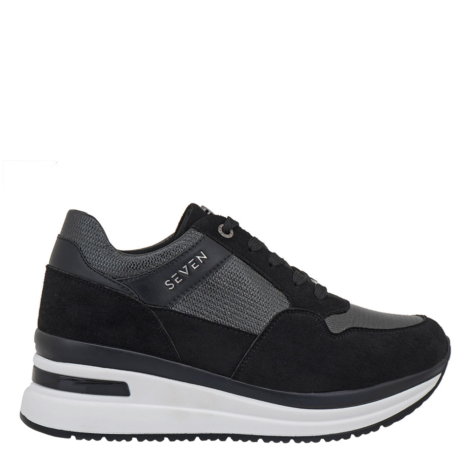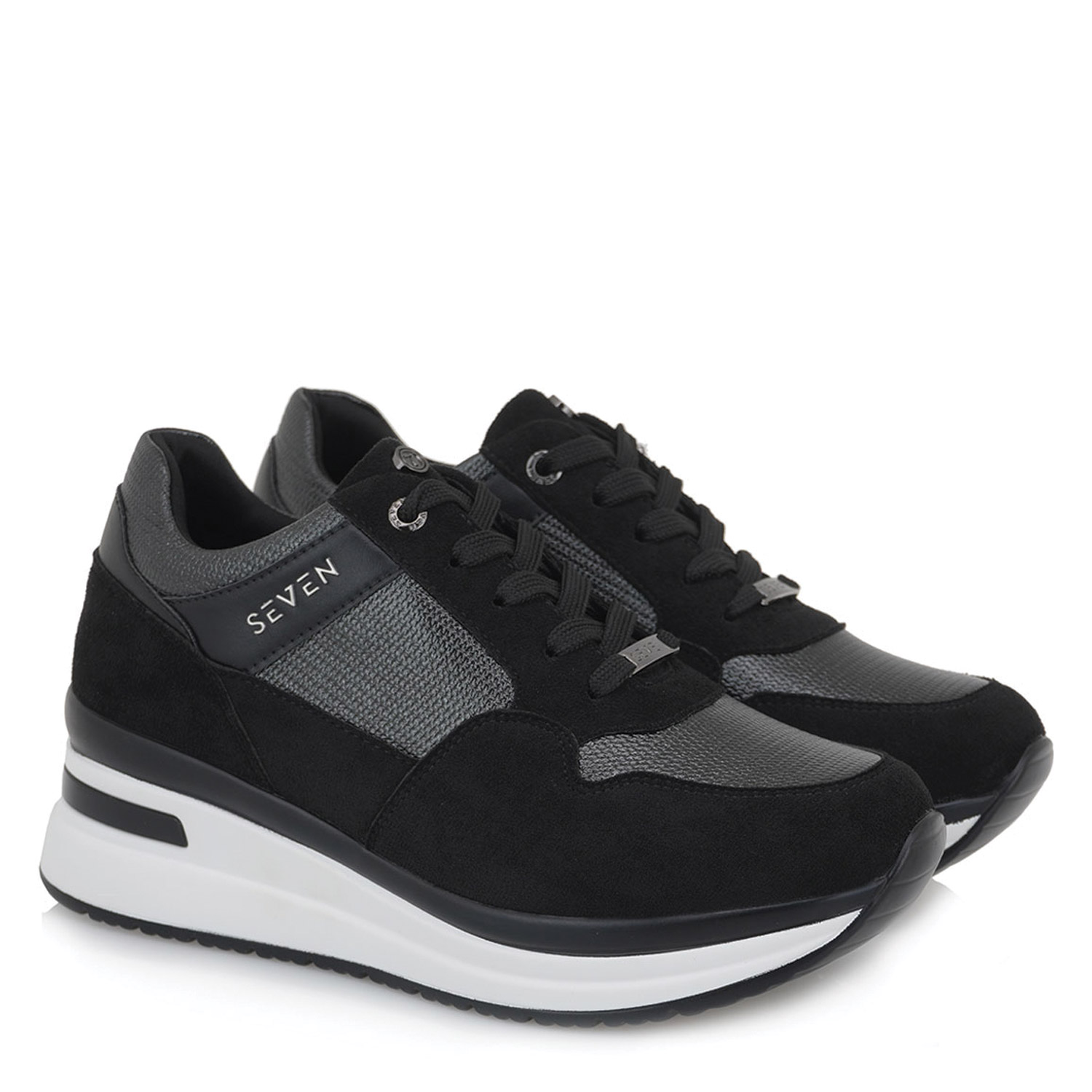 Seven γυναικείο sneaker, σε μαύρο χρώμα, κατασκευασμένο από οικολογικό δέρμα και ύφασμα. Ύψος σόλας 4.5εκ.