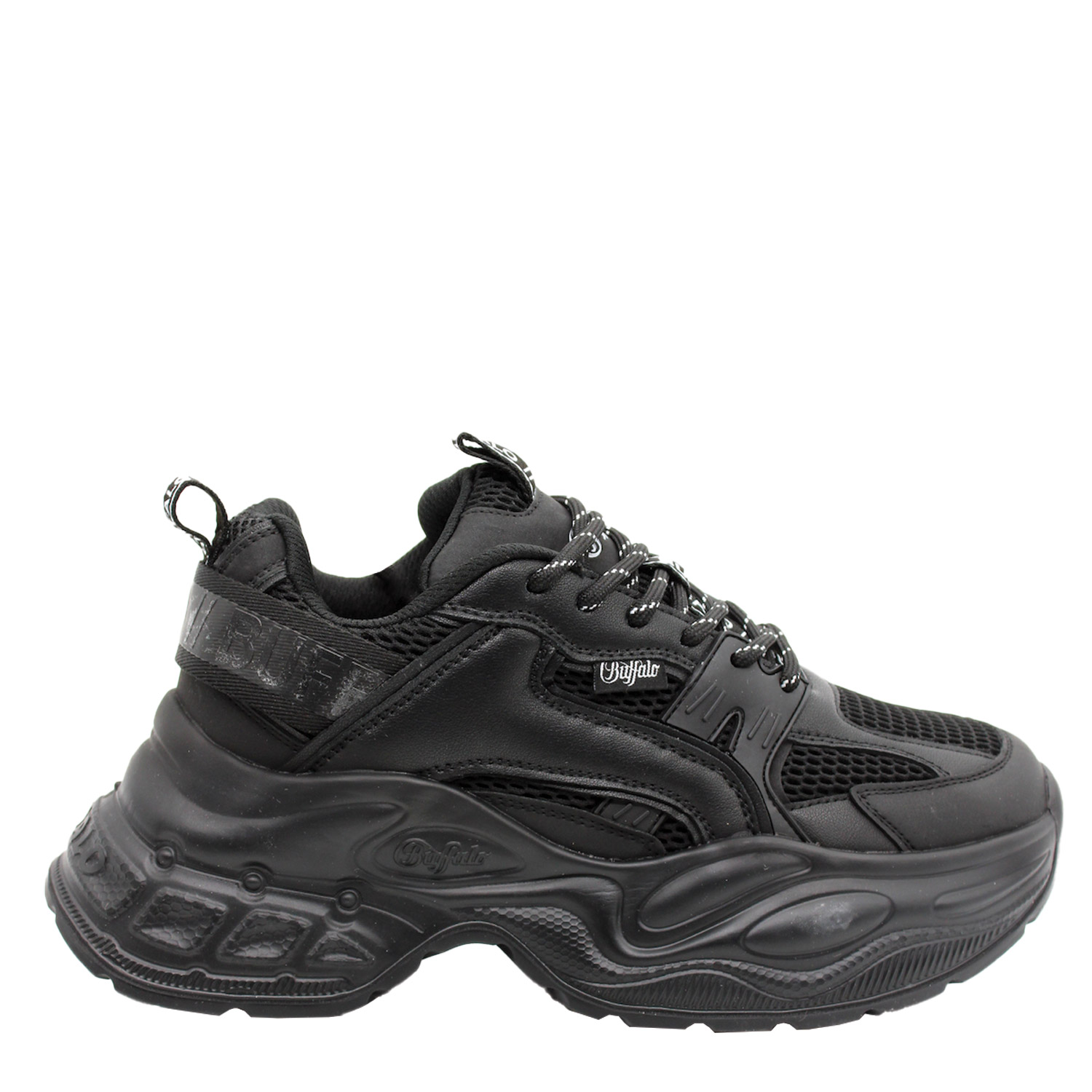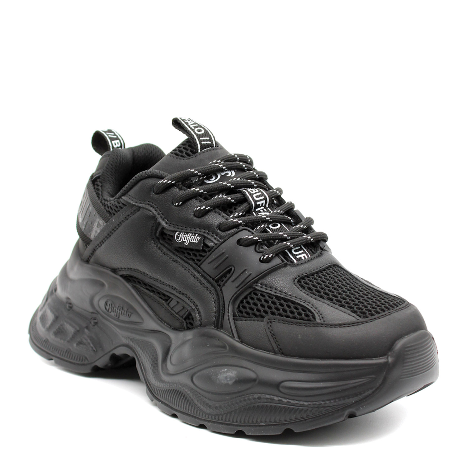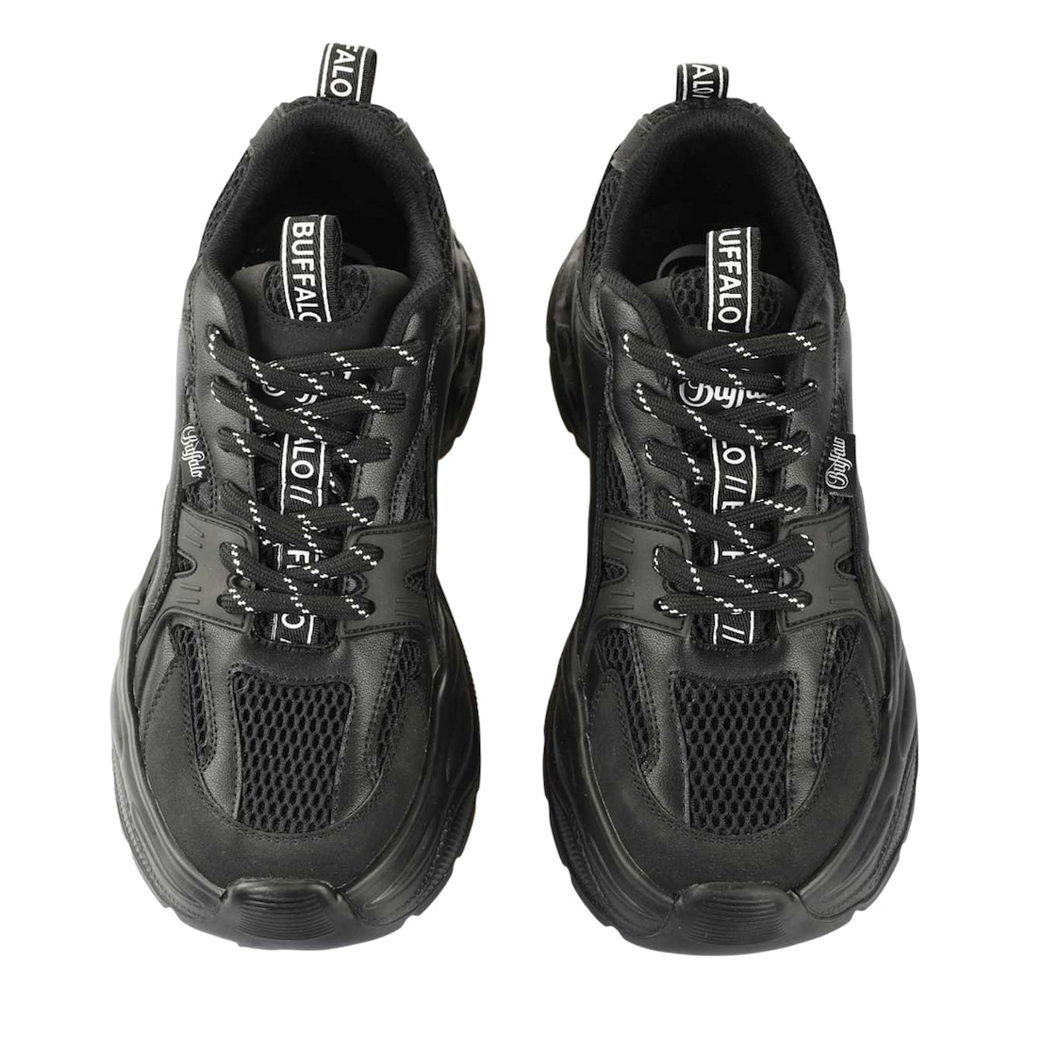 Buffalo γυναικείο sneaker, σε μαύρο χρώμα, κατασκευασμένο από οικολογικό δέρμα, με ανατομικό πάτο, κατασκευασμένο από vegan υλικά. Ύψος τακουνιού 6εκ.