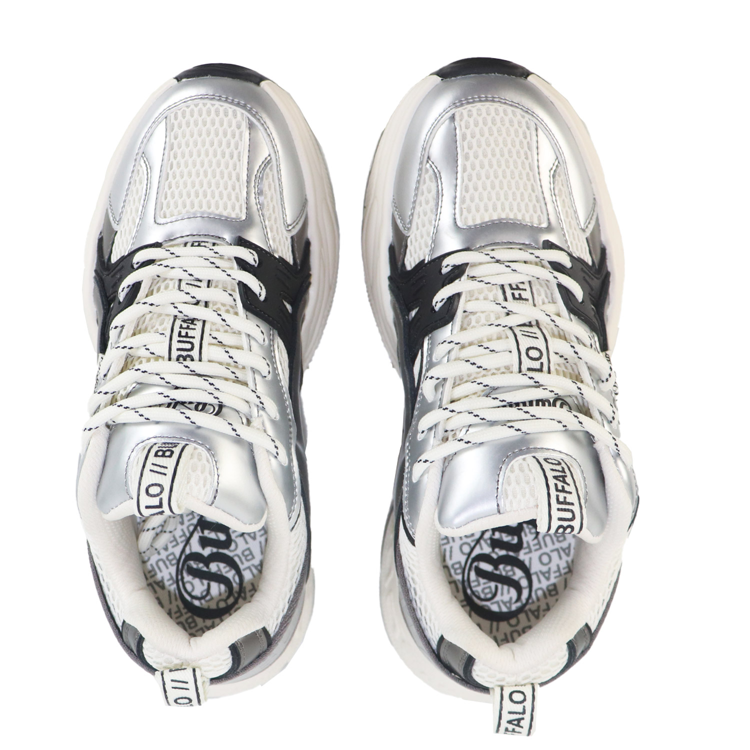 Buffalo γυναικείο sneaker, σε λευκό-ασημί χρώμα, κατασκευασμένο από οικολογικό δέρμα, με ανατομικό πάτο από memory foam. Ύψος τακουνιού 4εκ.