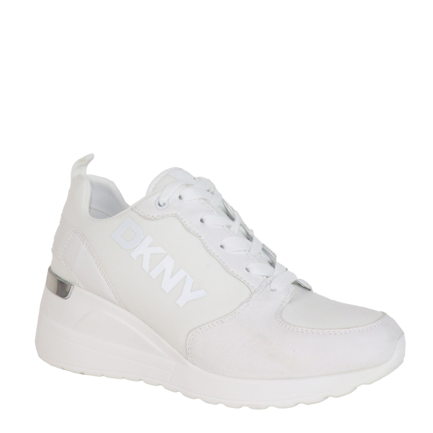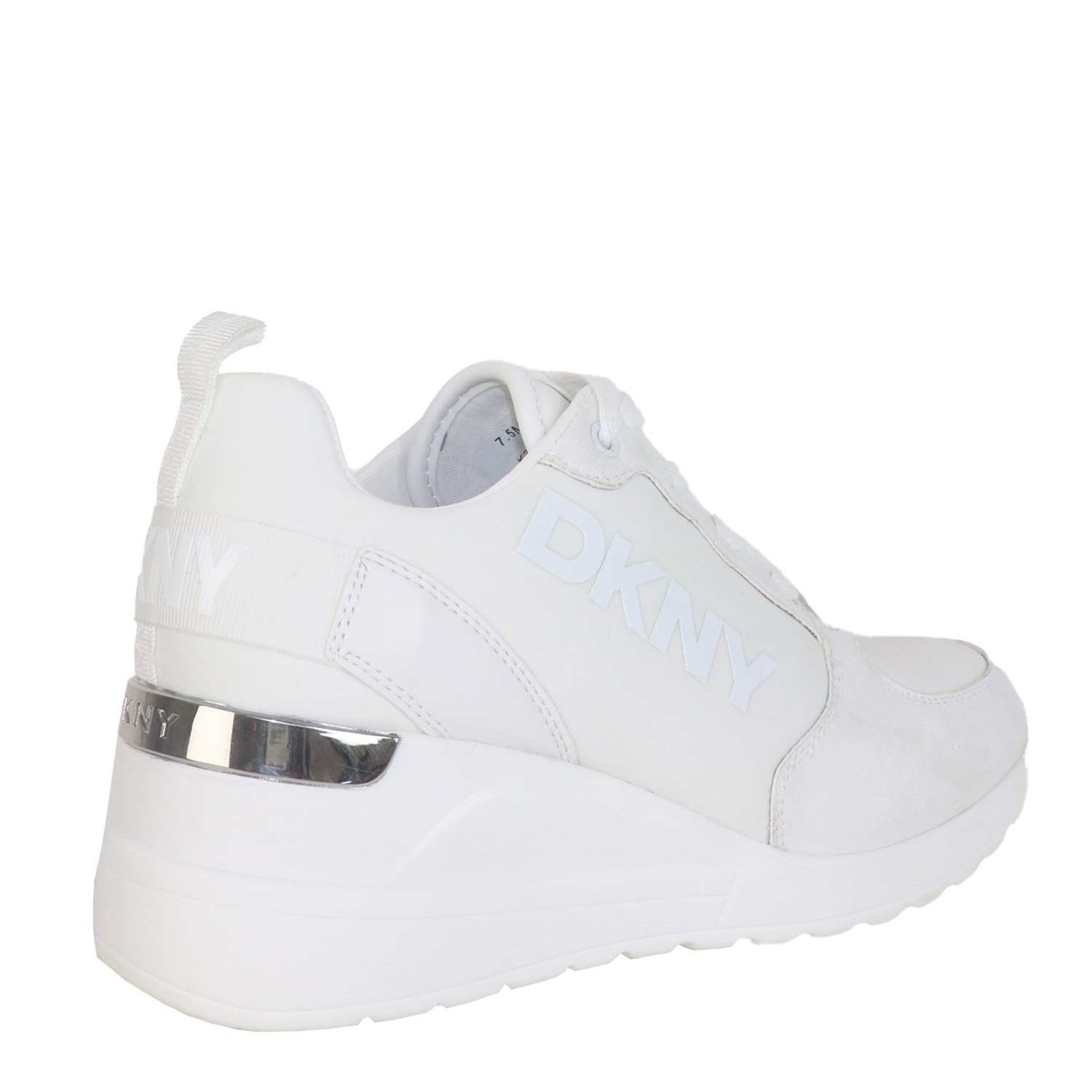 DKNY γυναικείο sneaker, σε λευκό χρώμα, κατασκευασμένο από ύφασμα και οικολογικό δέρμα.