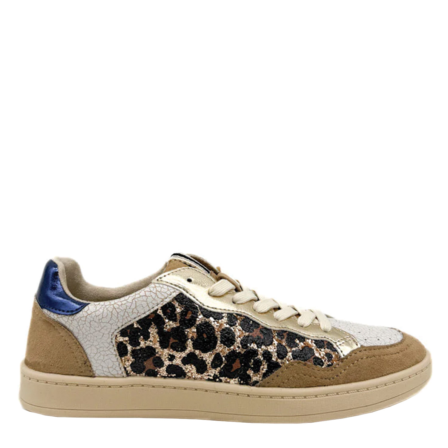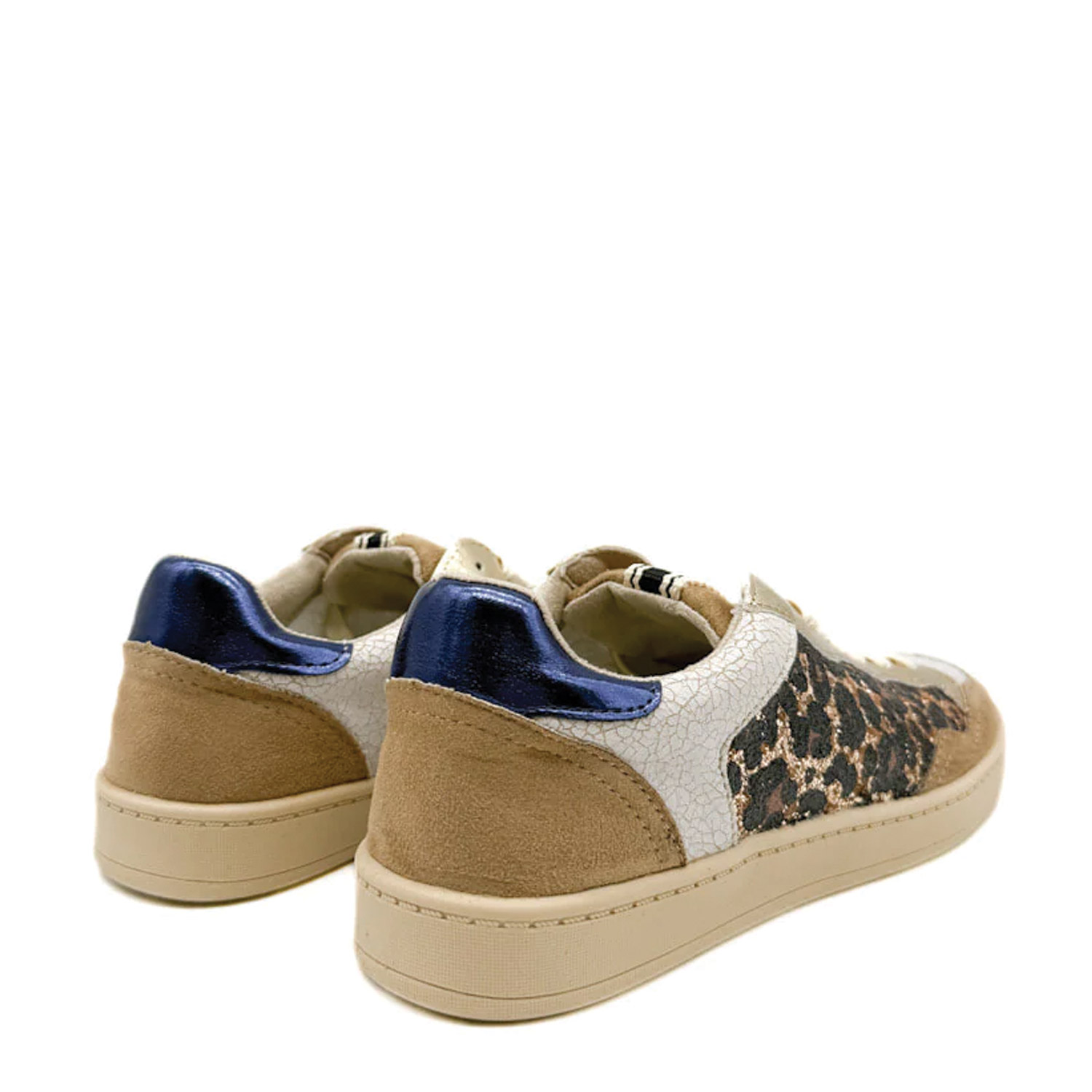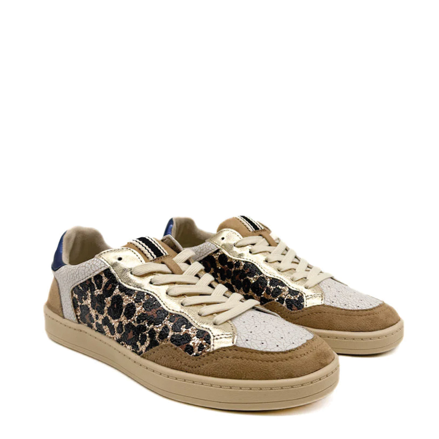 Ένα αθλητικό παπούτσι, casual, με ένα μείγμα υφών και χρωμάτων. Το αθλητικό παπούτσι συνδυάζει suede σε καμηλό χρώμα στη μύτη, λεοπάρ ύφασμα στο πλάι και ανοιχτόχρωμες χρυσές δερμάτινες λεπτομέρειες στο μπροστινό μέρος και στην περιοχή των δαντελλών. Το πίσω μέρος της φτέρνας είναι σε εντυπωσιακό μεταλλικό μπλε κοβαλτίου. Η ανοιχτόχρωμη μπεζ σόλα πλατφόρμας και τα υπόλευκα κορδόνια συμπληρώνουν την παλέτα χρωμάτων. Ύψος σόλας 2.5εκ.