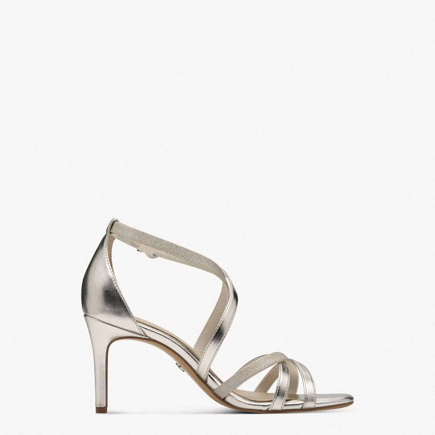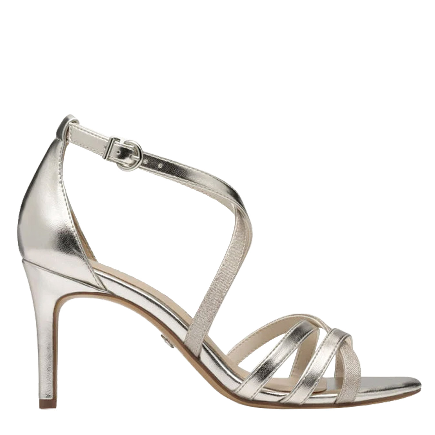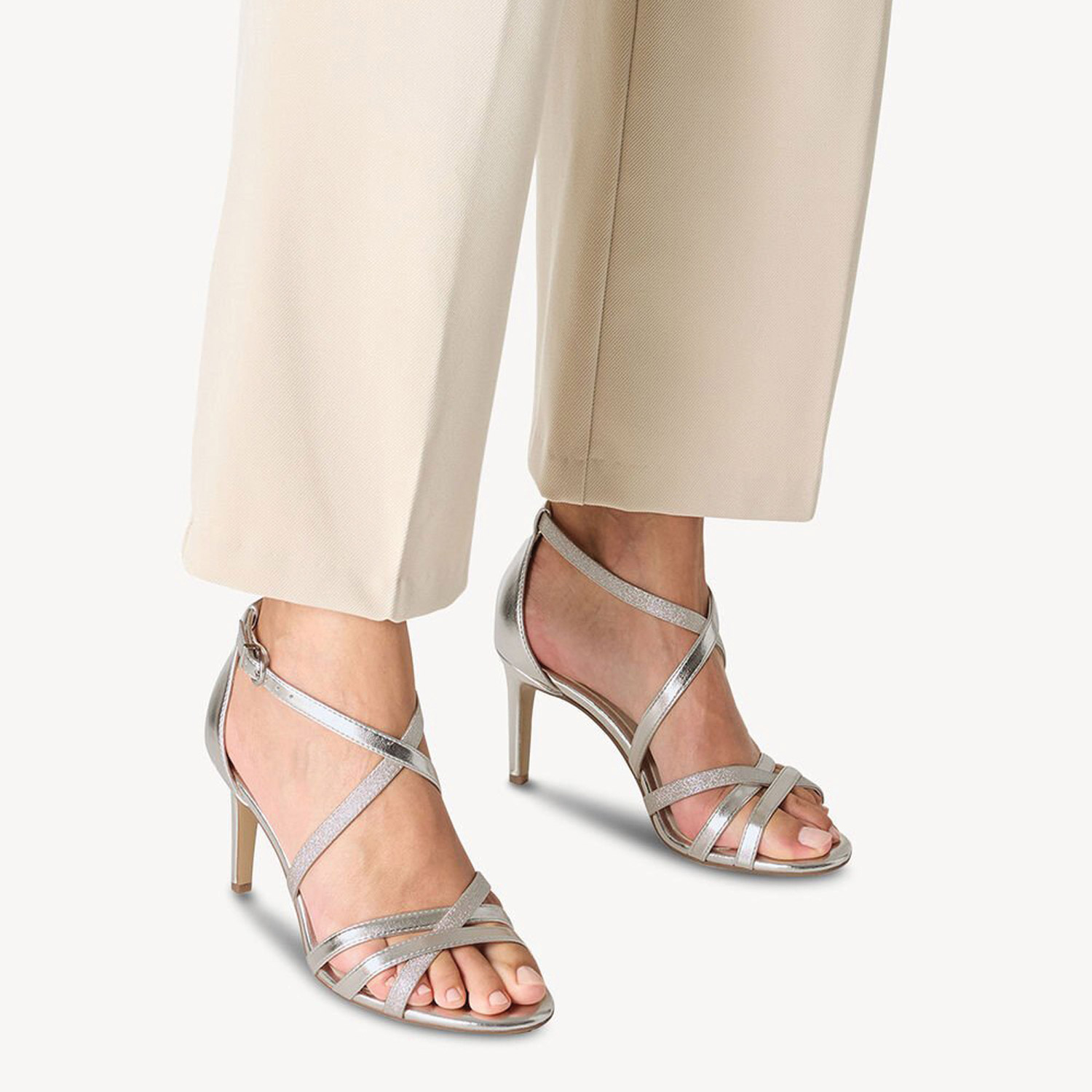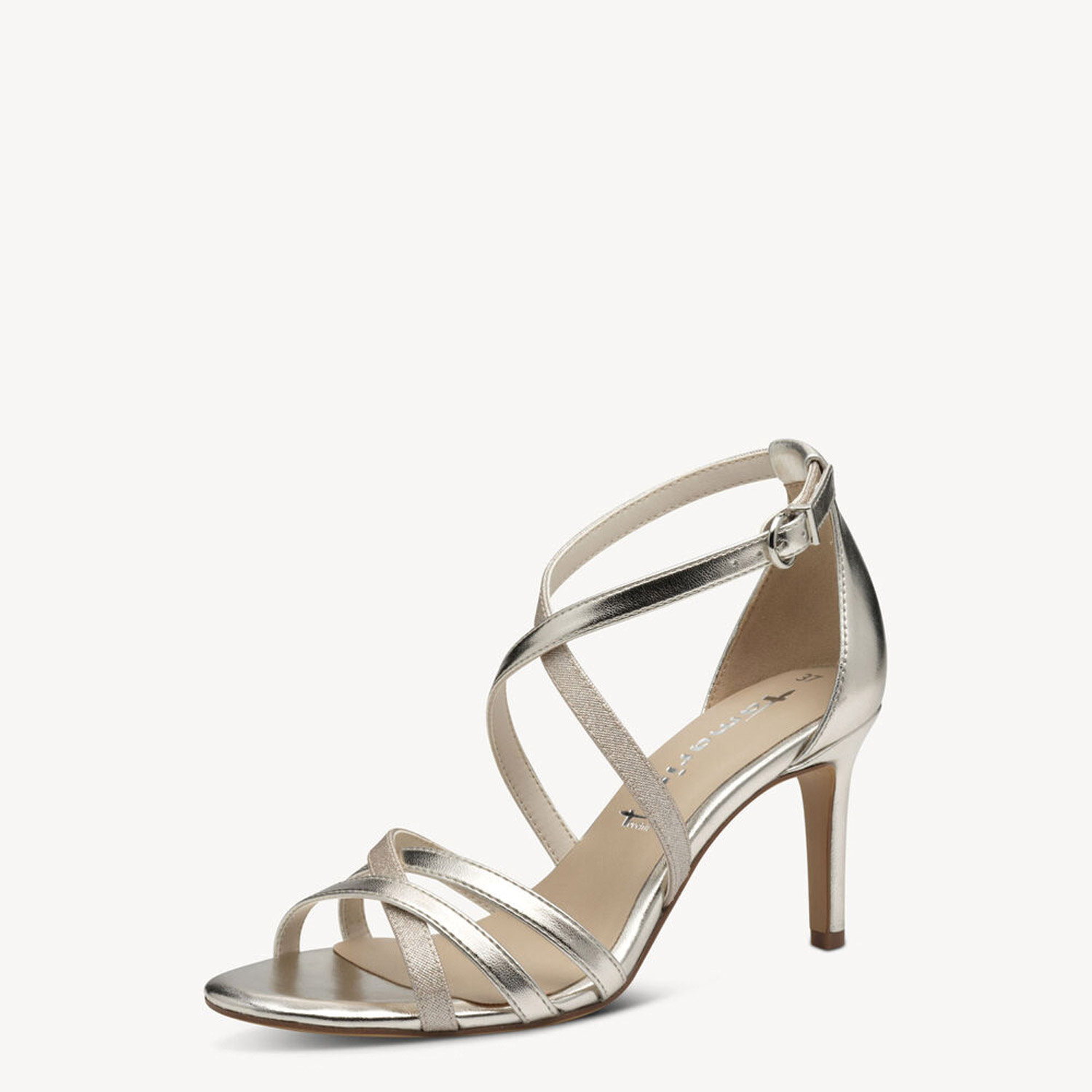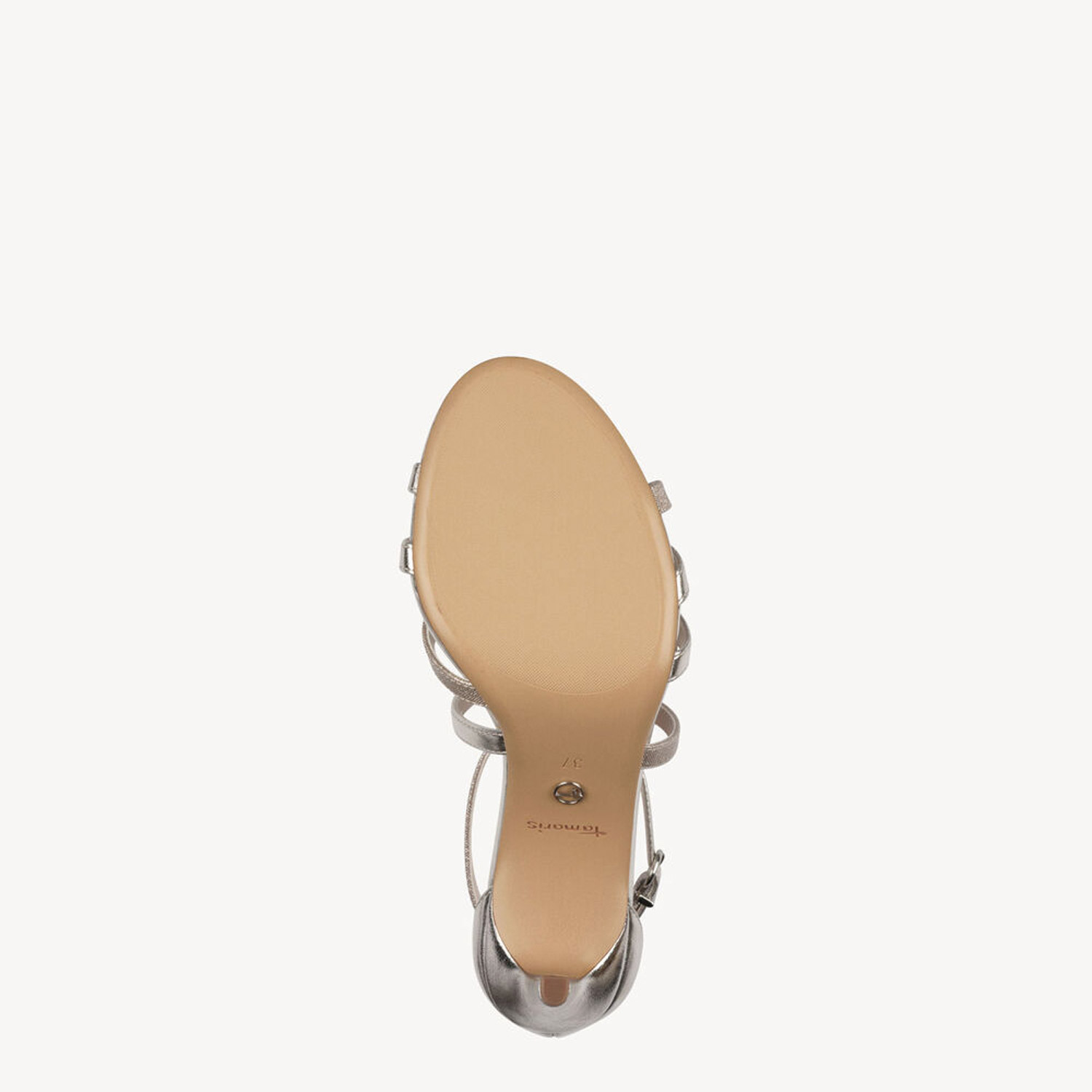 Tamaris γυναικείο πέδιλο σε ασημί χρώμα κατασκευασμένο από ύφασμα και οικολογικό δέρμα. Ύψος τακουνιού 8εκ.