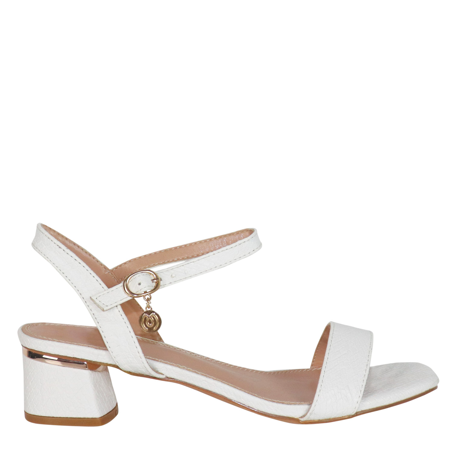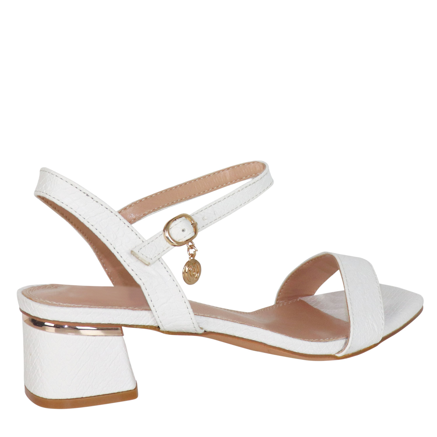 Λευκό πέδιλο με snakeskin υφή. Διαθέτει φάσα και χαμηλό χοντρό τακούνι. Δένει με ρυθμιζόμενο λουράκι αστραγάλου με αγκράφα.