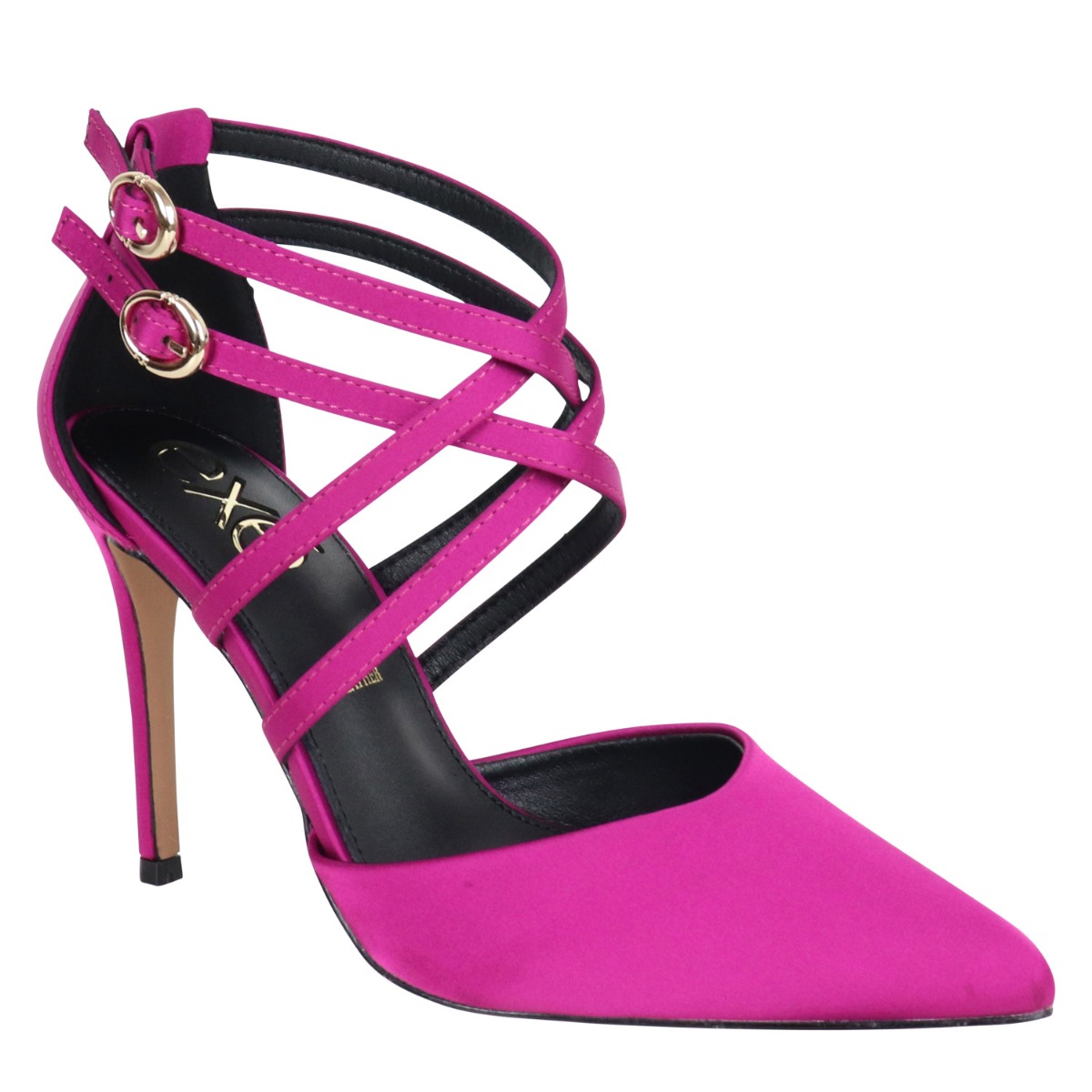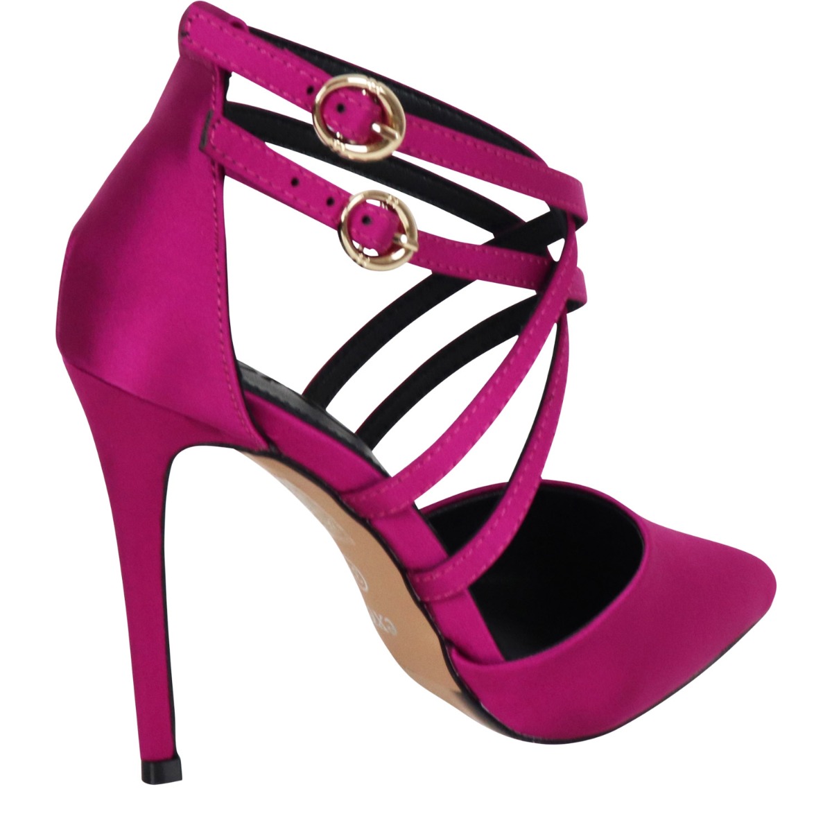 Exe γυναικεία γόβα σε φούξια χρώμα κατασκευασμένη από ύφασμα σατέν, με δερμάτινο πατάκι. Ύψος τακουνιού 10εκ.