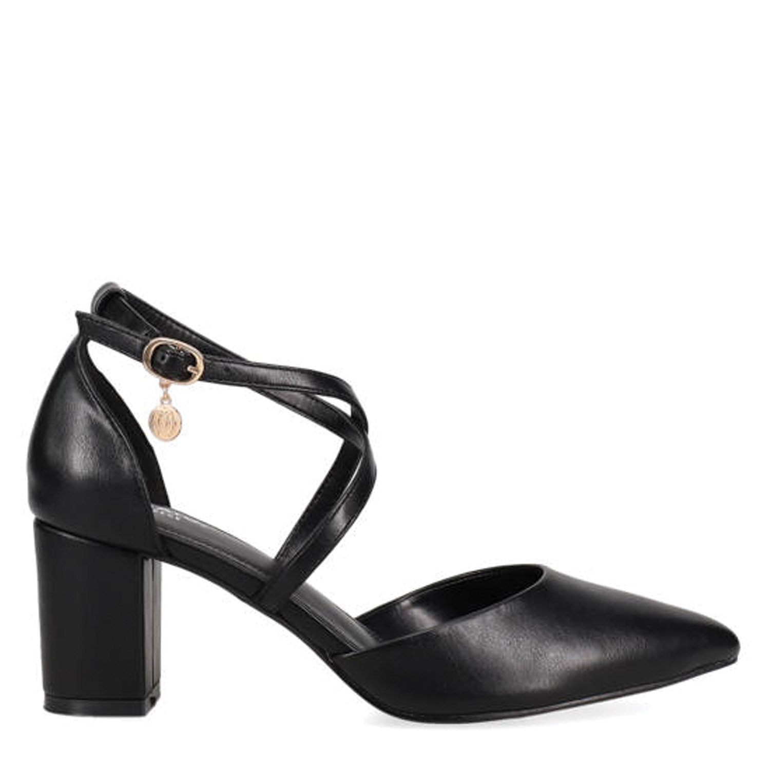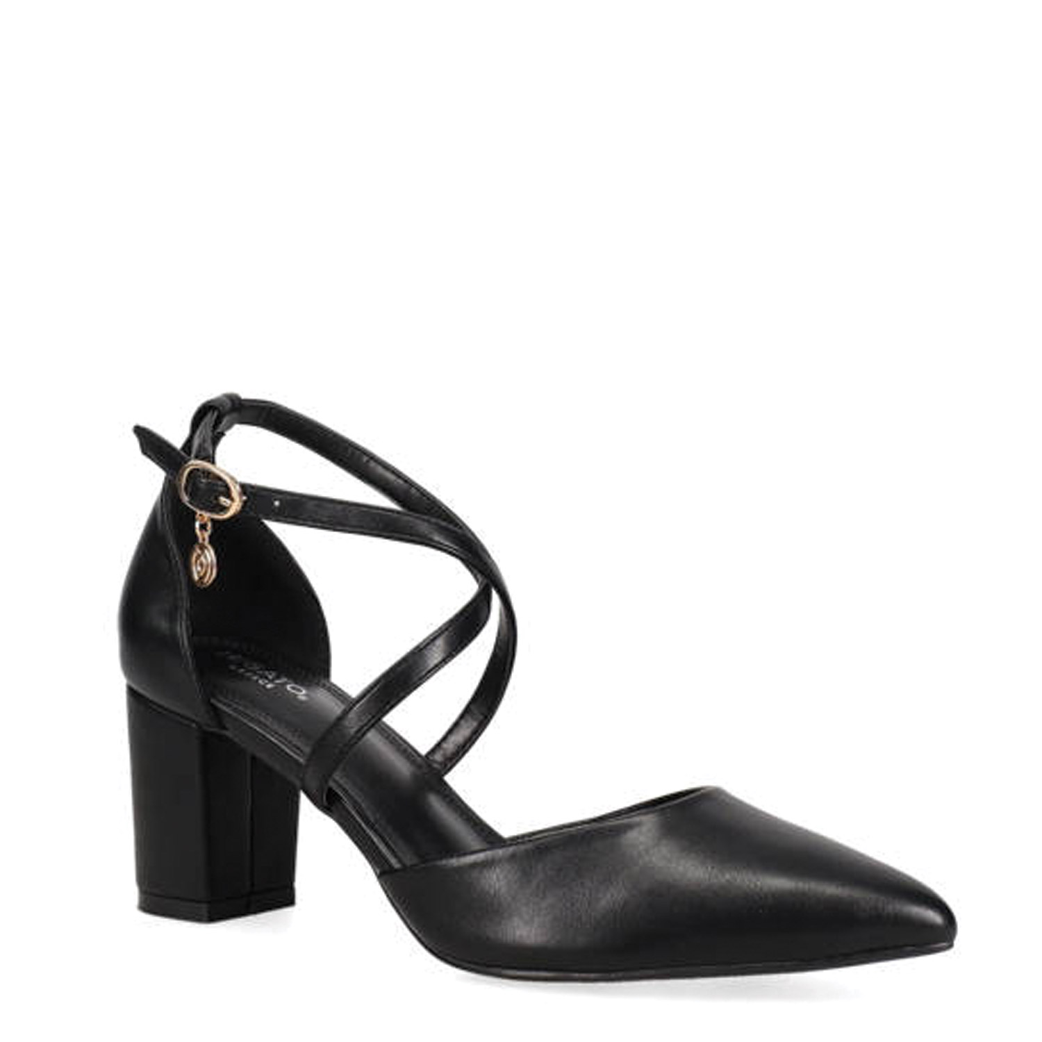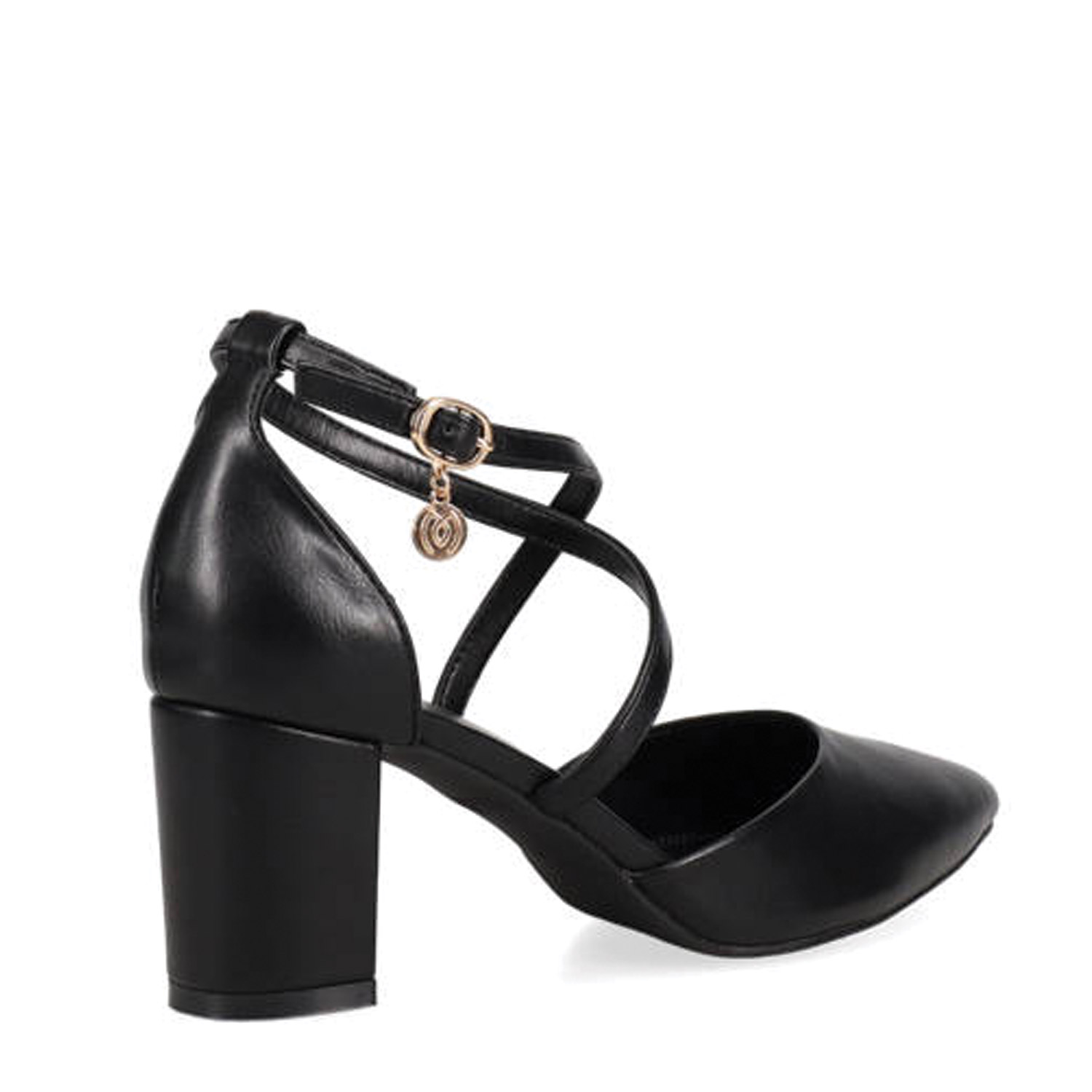 Μαύρη γόβα. Διαθέτει ψηλό χοντρό τακούνι. Δένει με χιαστί ρυθμιζόμενα λουράκια στον αστράγαλο.