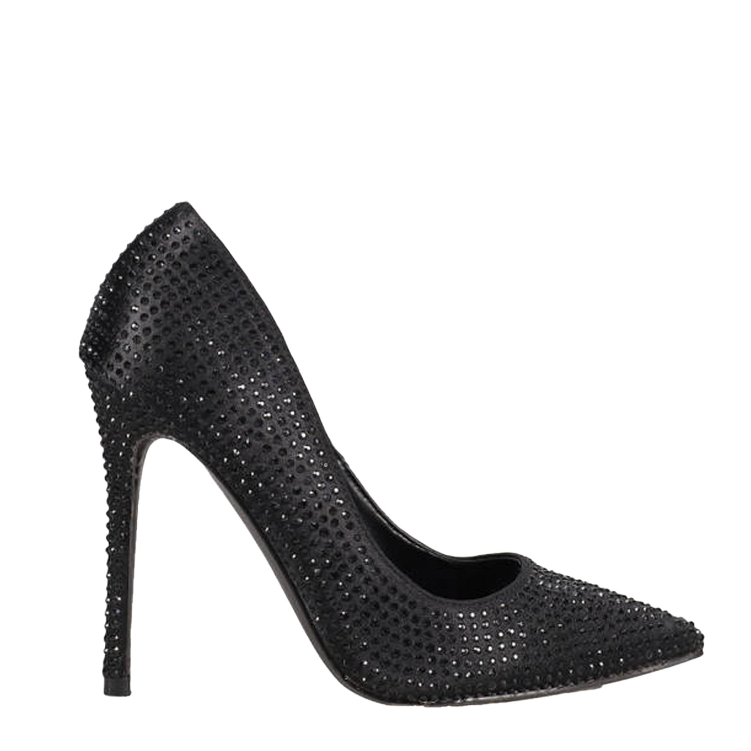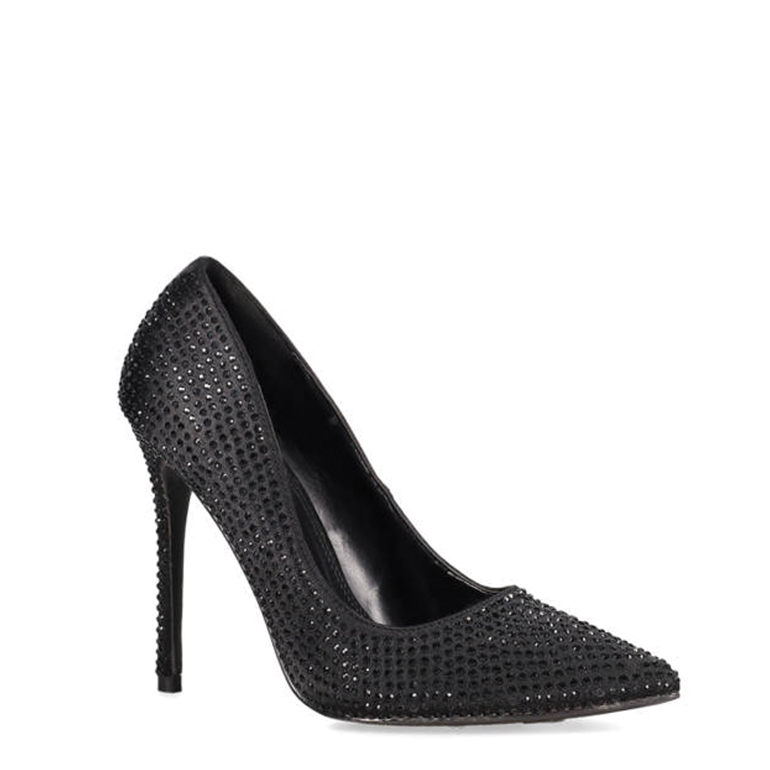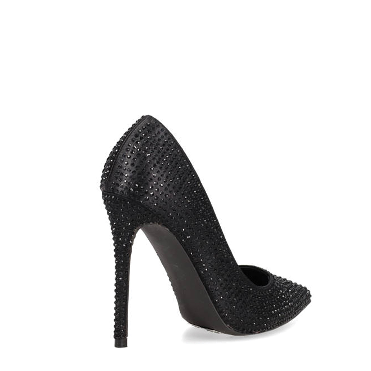Μαύρη γόβα. Διαθέτει μυτερή φόρμα, διακοσμητικά στρας και ψηλό λεπτό τακούνι στιλέτο.