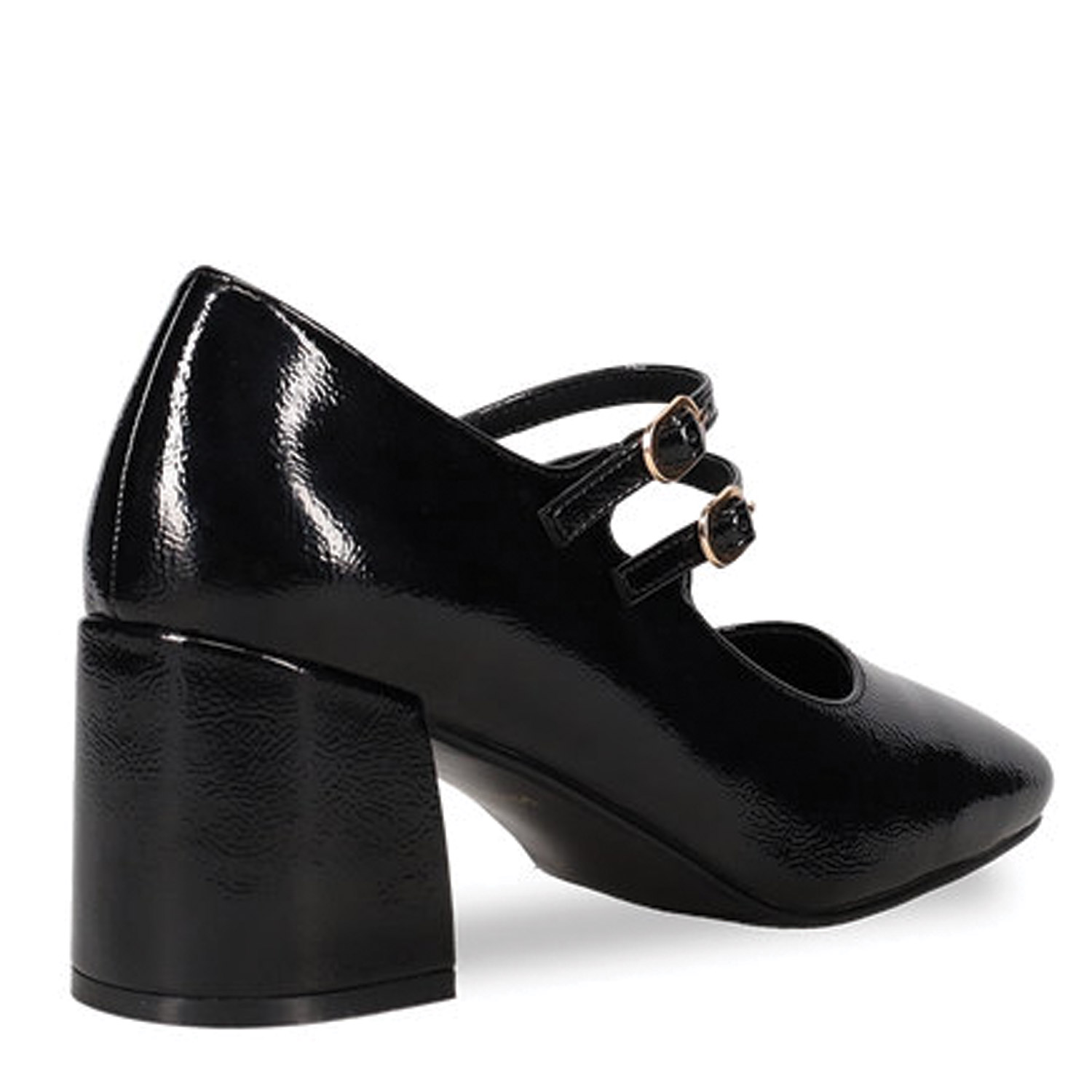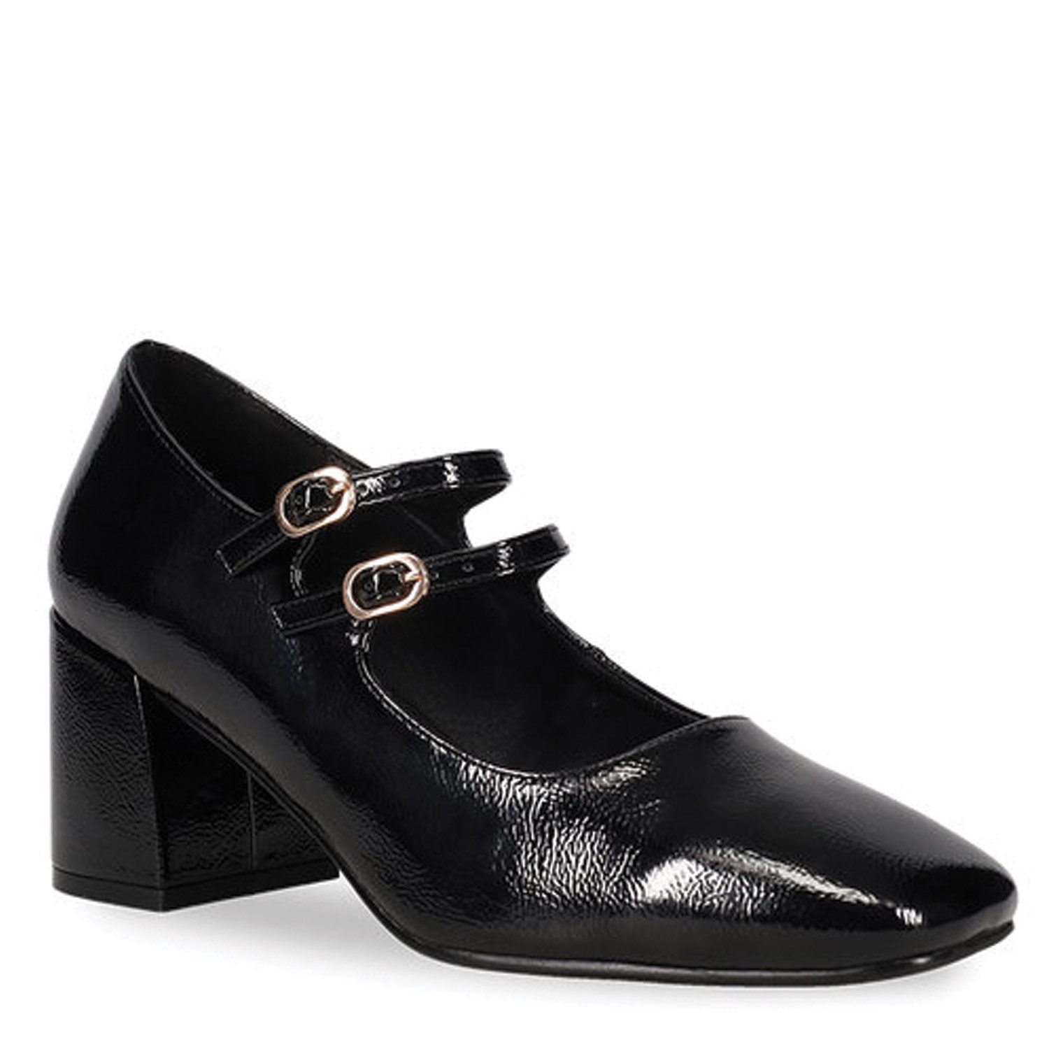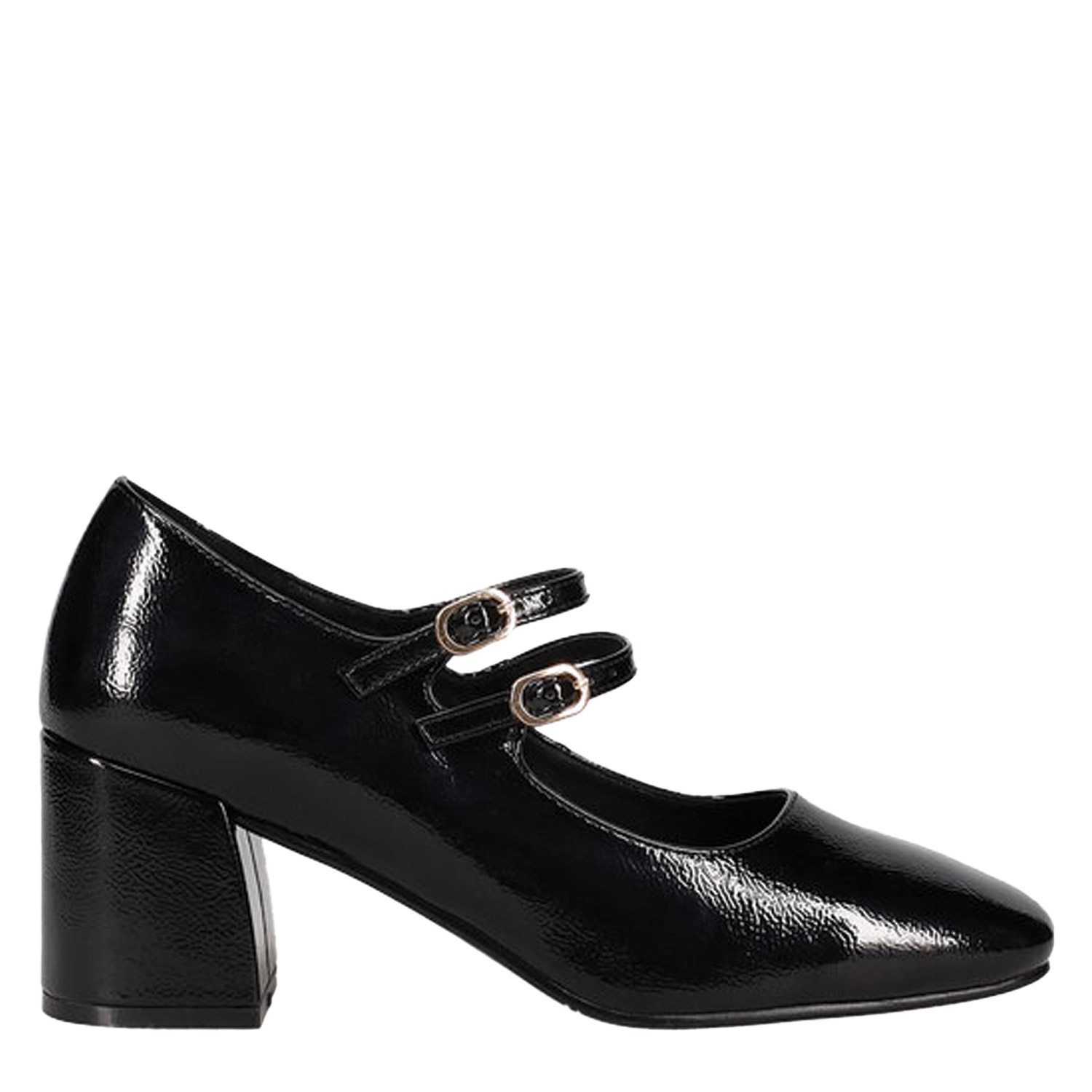 Μαύρη γόβα λουστρίνι με μπαρέτες τύπου Mary Jane. Με τετράγωνη φόρμα, χαμηλό χοντρό τακούνι και δύο λουράκια στο κουντεπιέ που ρυθμίζονται με αγκράφα.