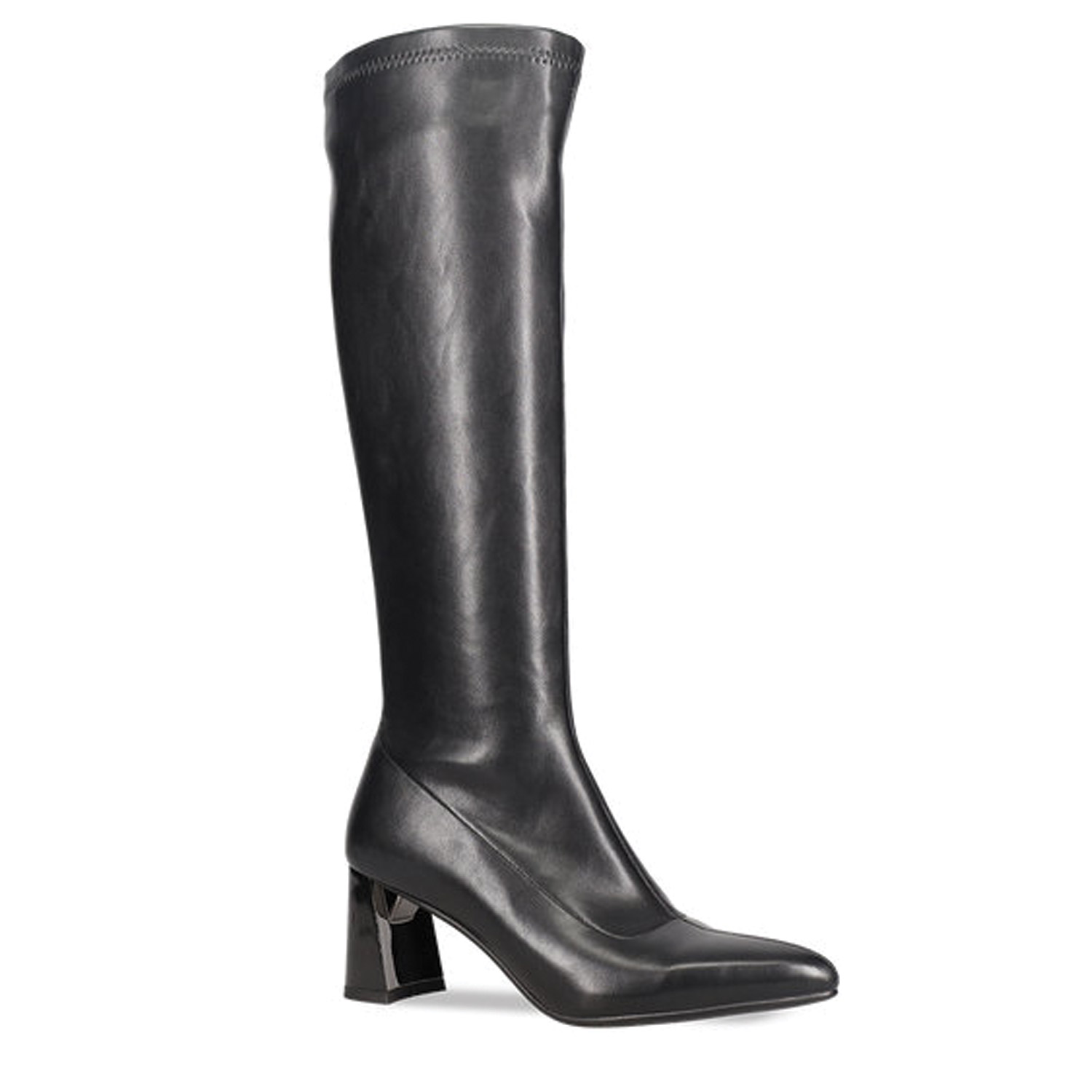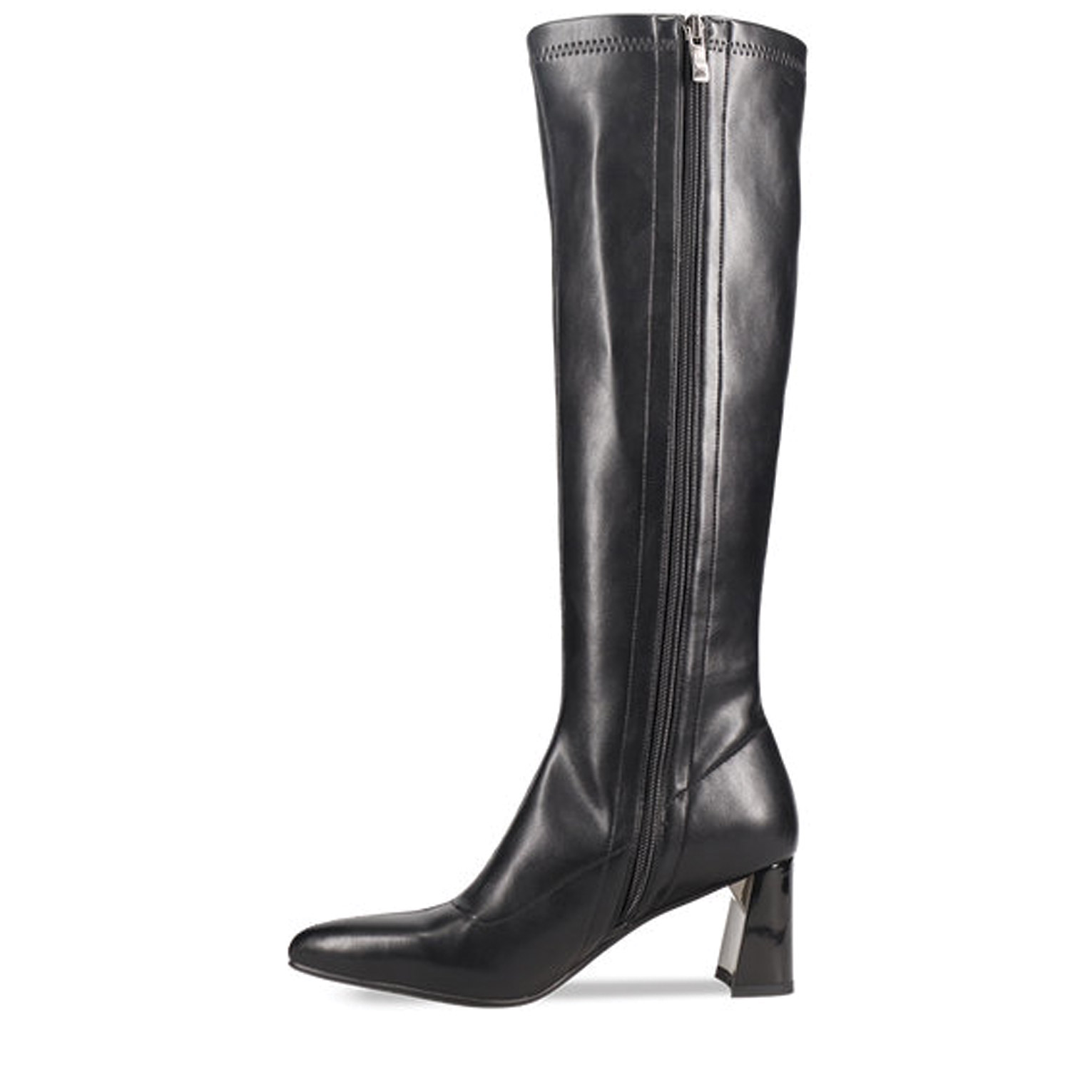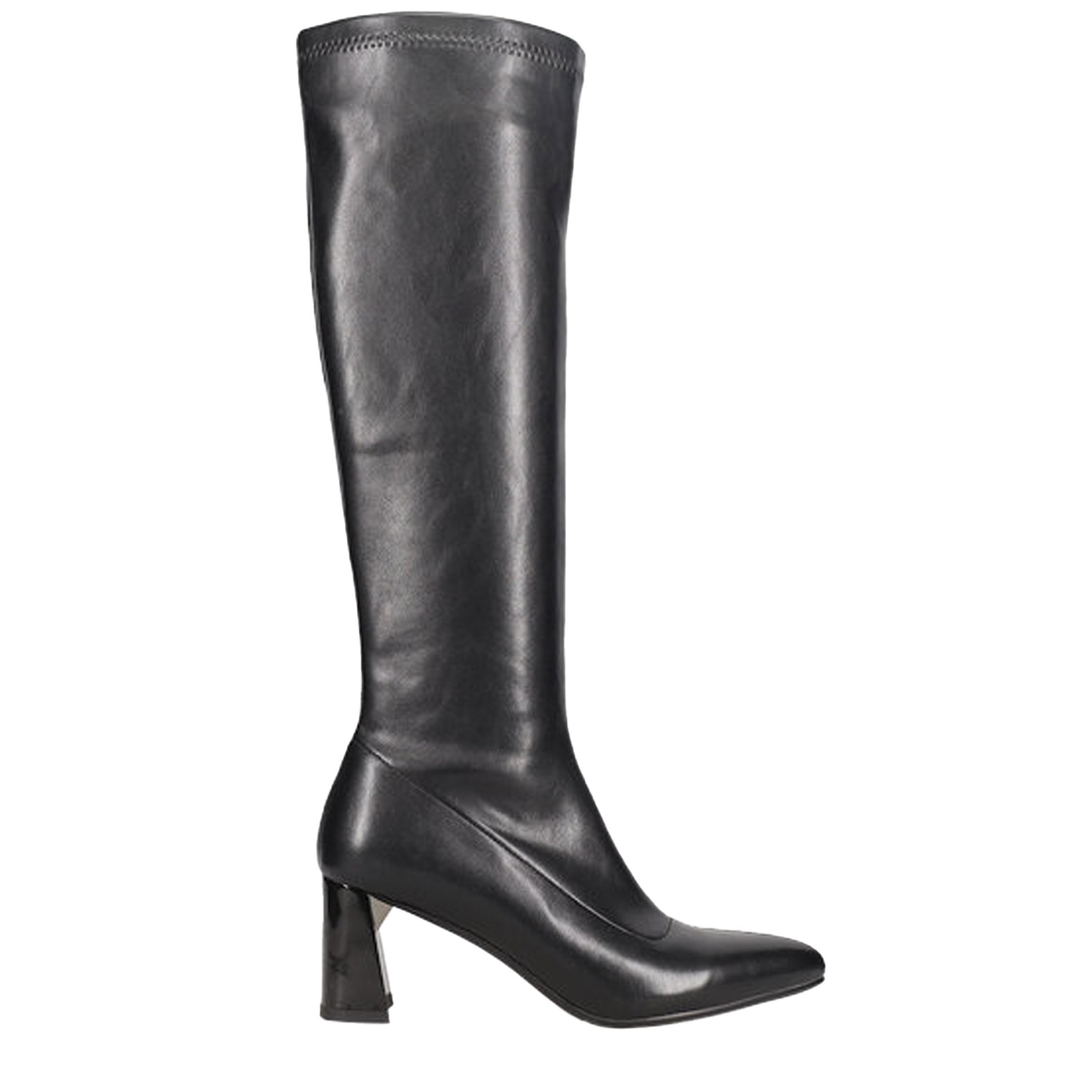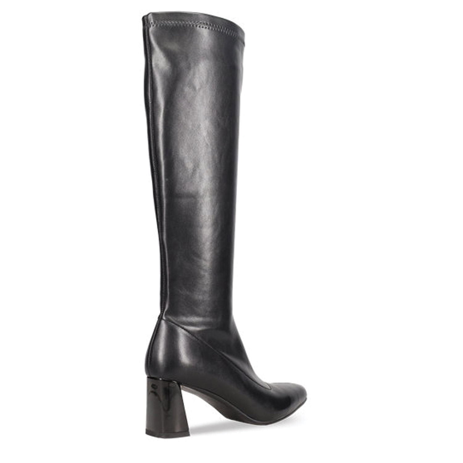 Μαύρη μπότα μέχρι το γόνατο. Διαθέτει χοντρό τακούνι μεσαίου ύψους με μεταλλική λεπτομέρεια. Κλείνει με φερμουάρ στο πλάι.