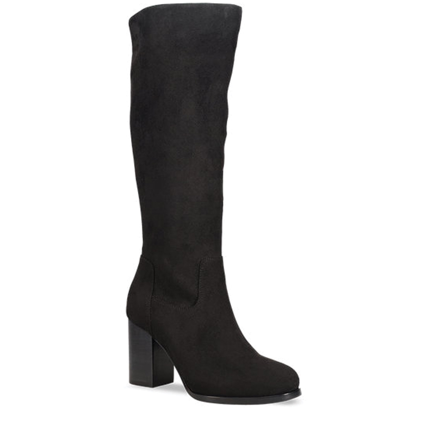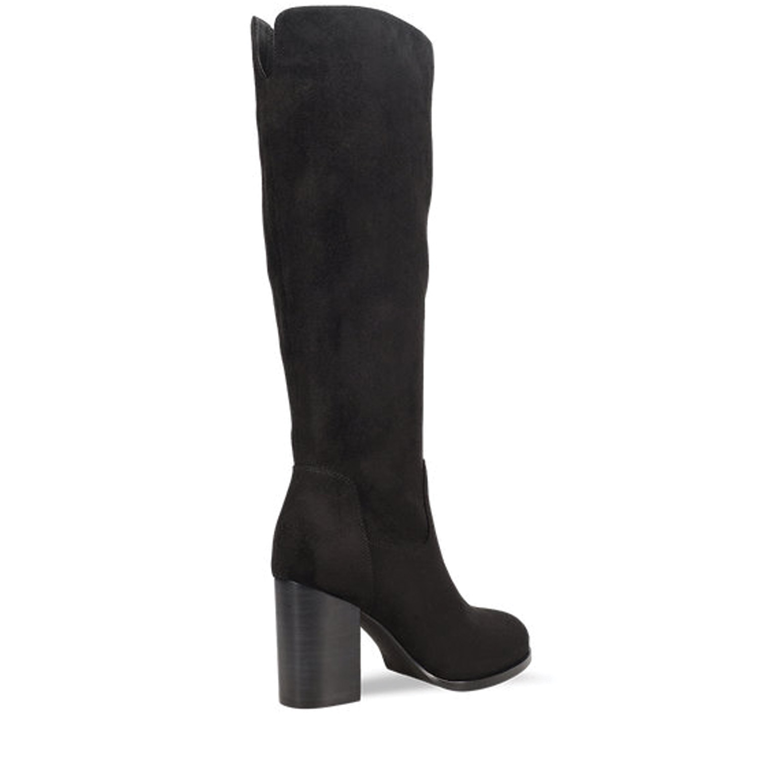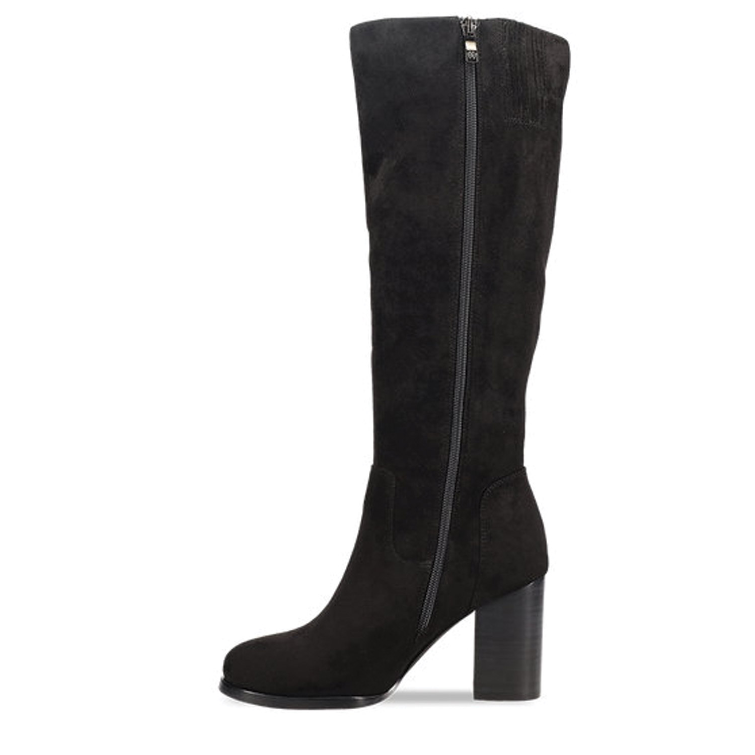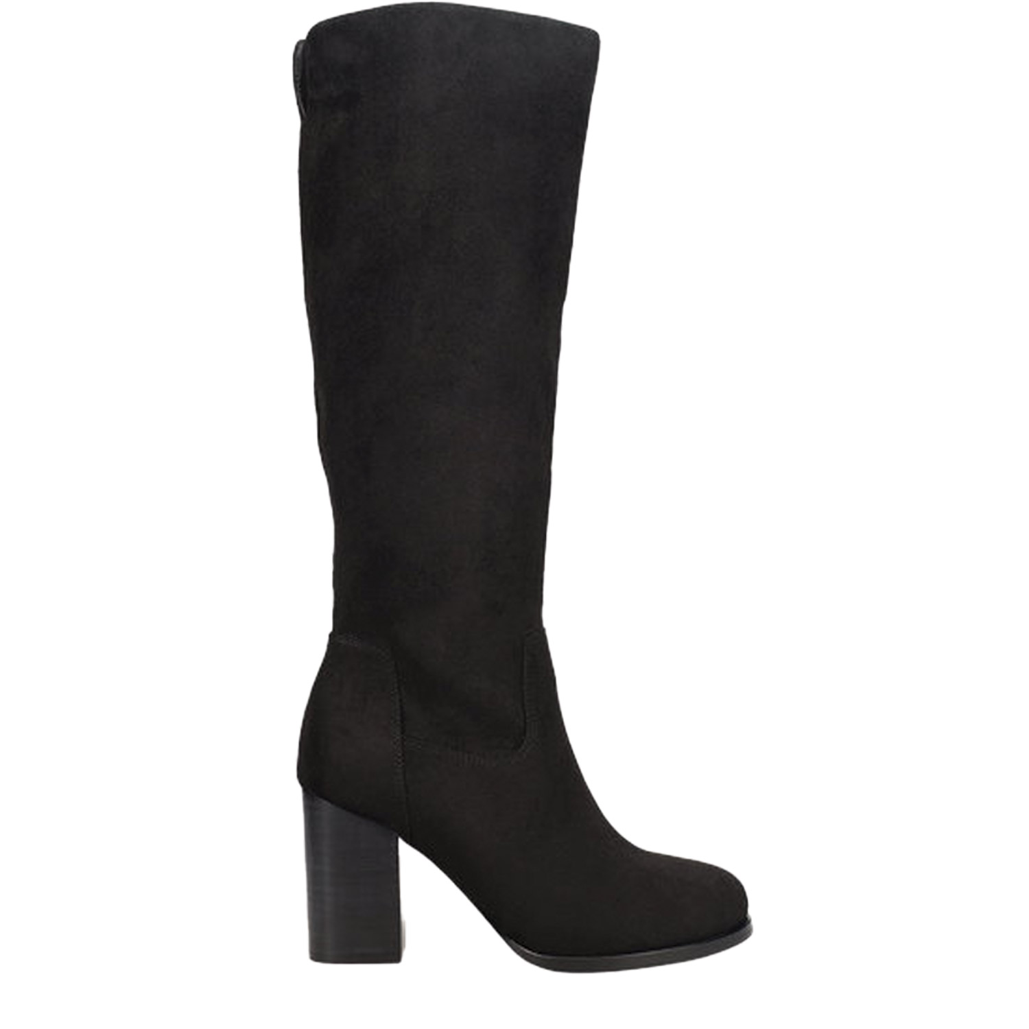 Μαύρη μπότα μέχρι το γόνατο.. Διαθέτει σουέντ υφή και ψηλό χοντρό τακούνι. Κλείνει με φερμουάρ στο πλάι.