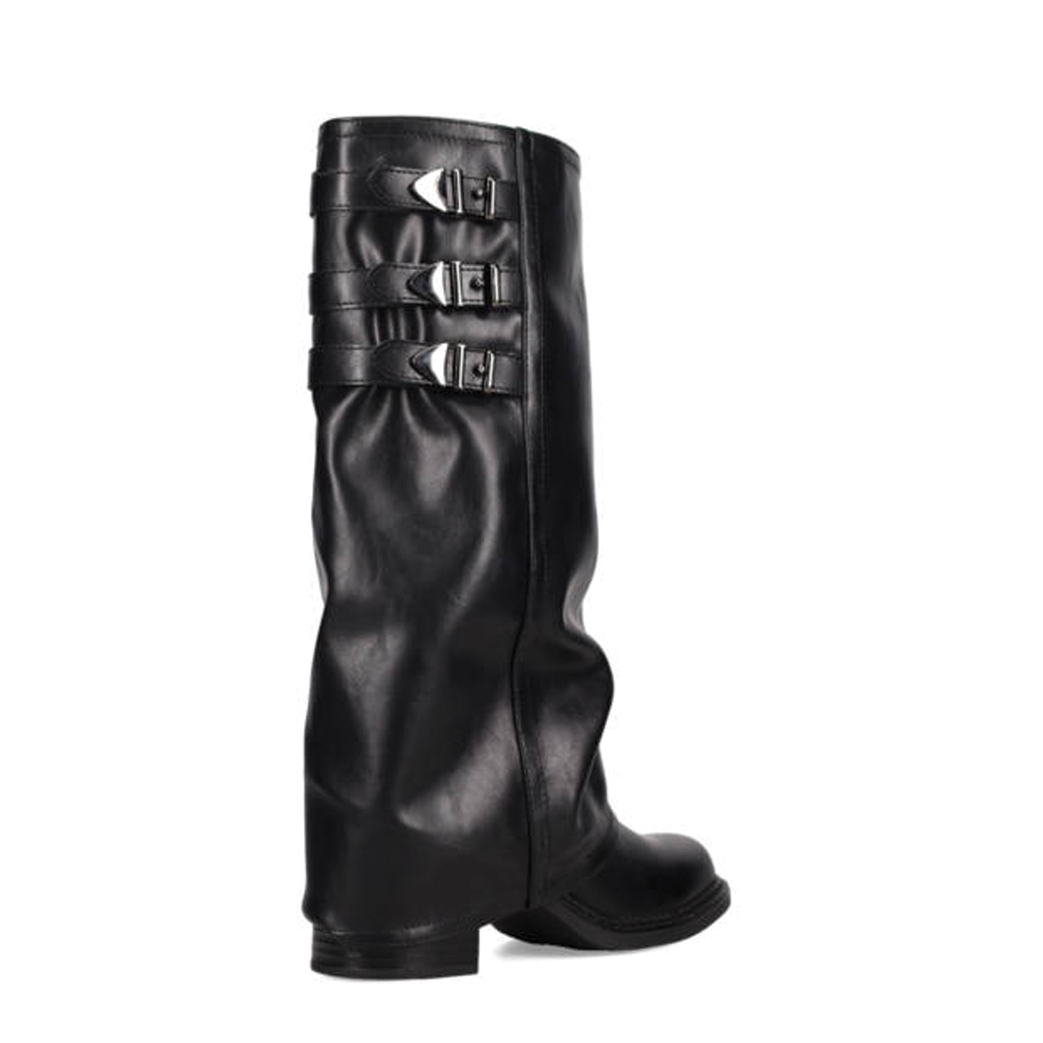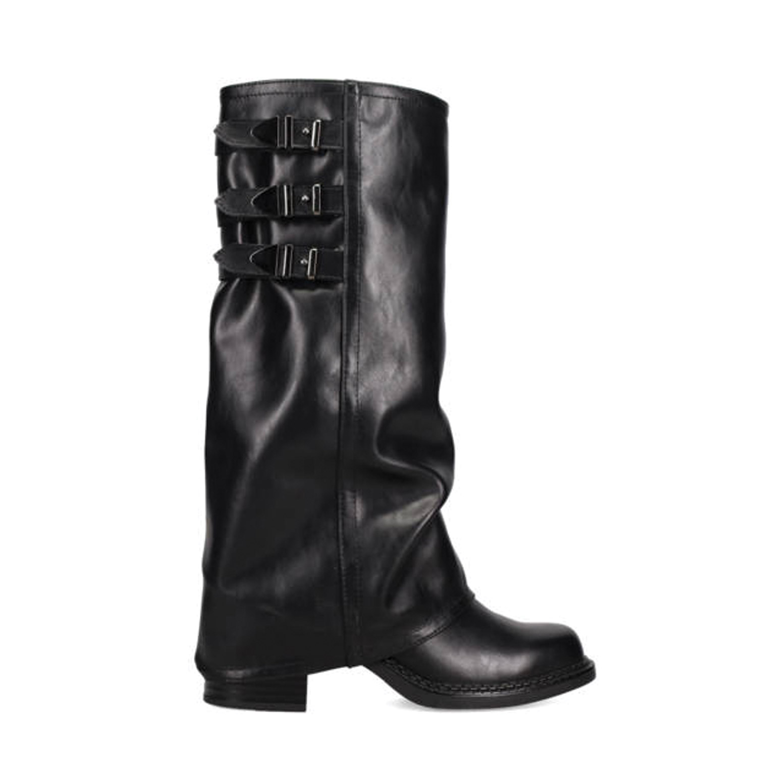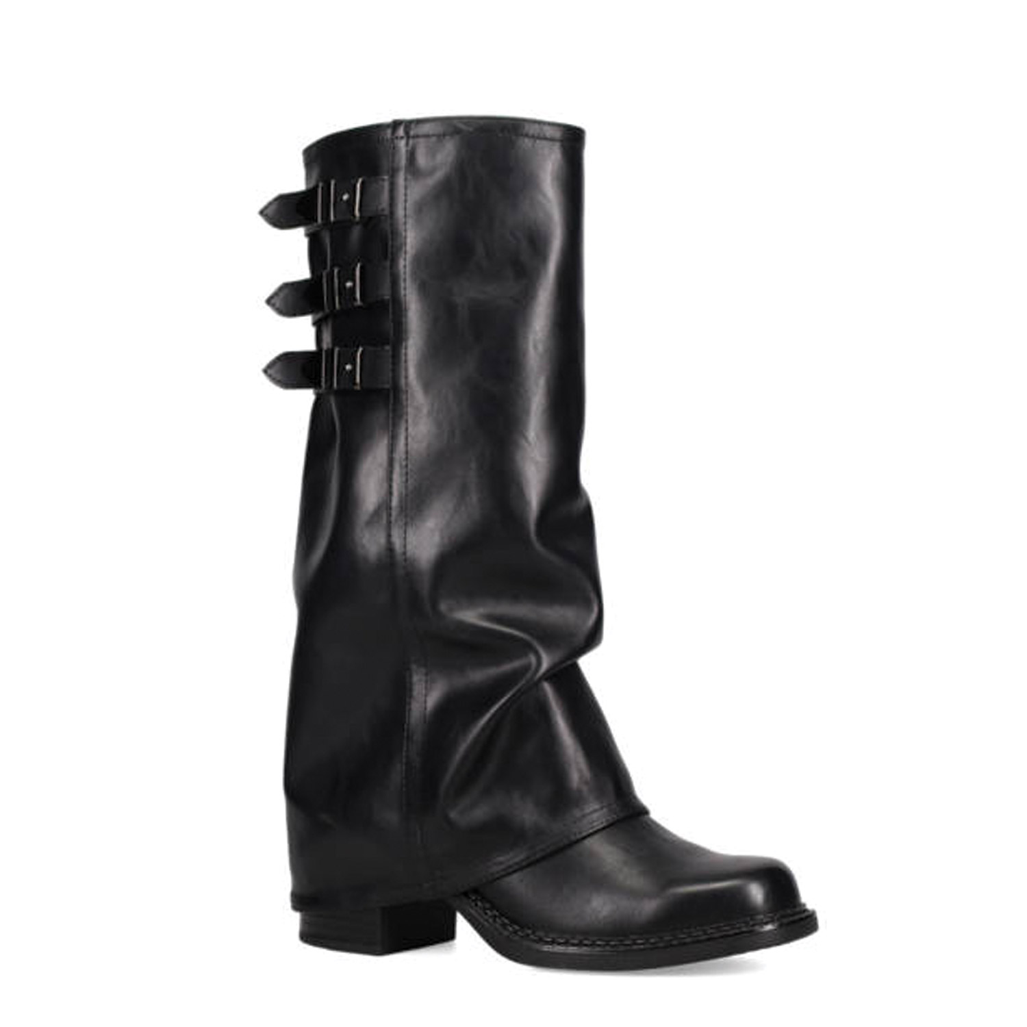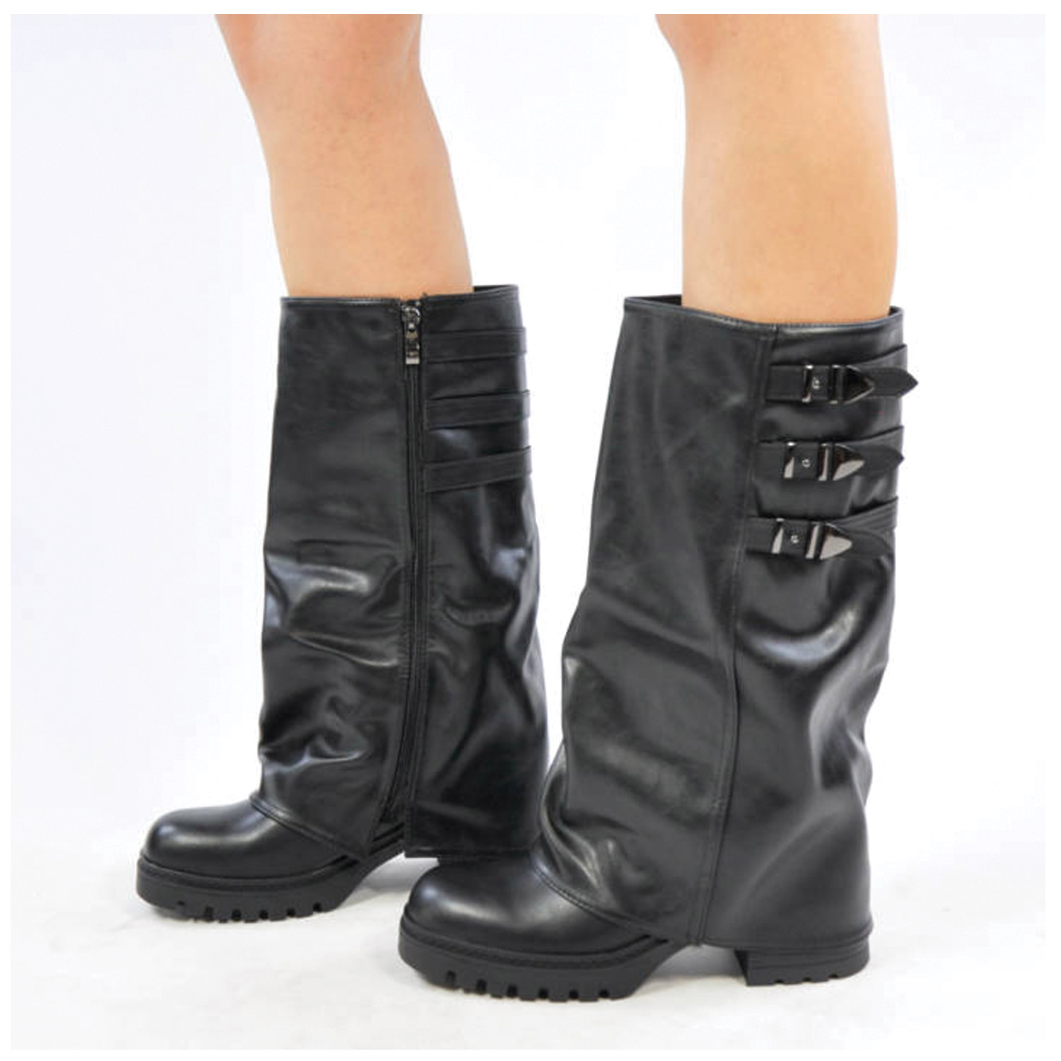 Μαύρη μπότα μέχρι τη μέση της γάμπας. Διαθέτει μεσαίο χοντρό τακούνι.