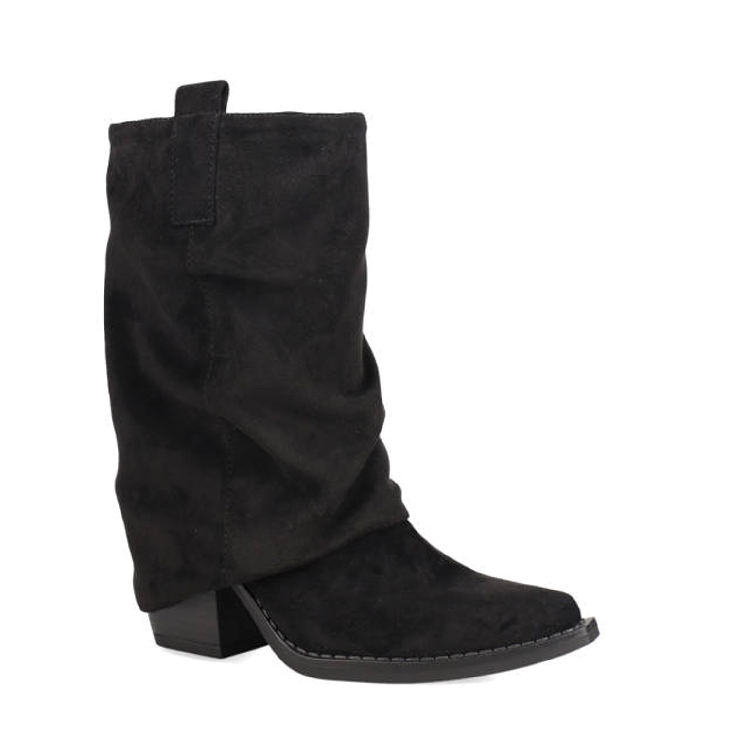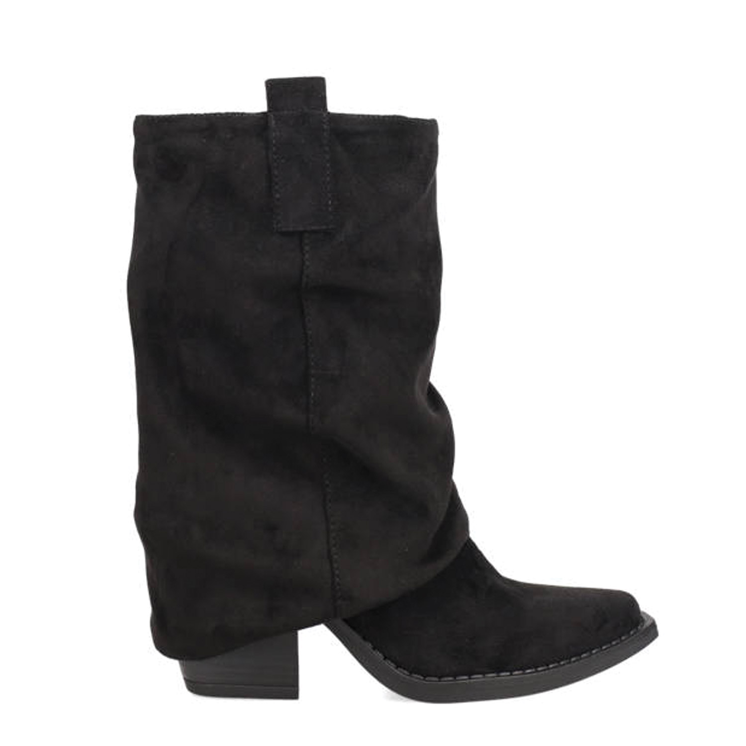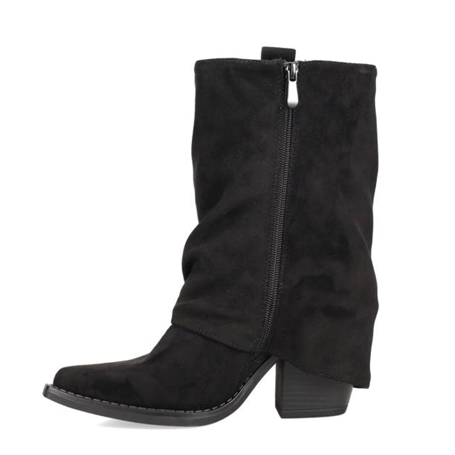Μαύρο μποτάκι με γκέτα. Διαθέτει σουέντ υφή και μεσαίο χοντρό τακούνι. Κλείνει με φερμουάρ.