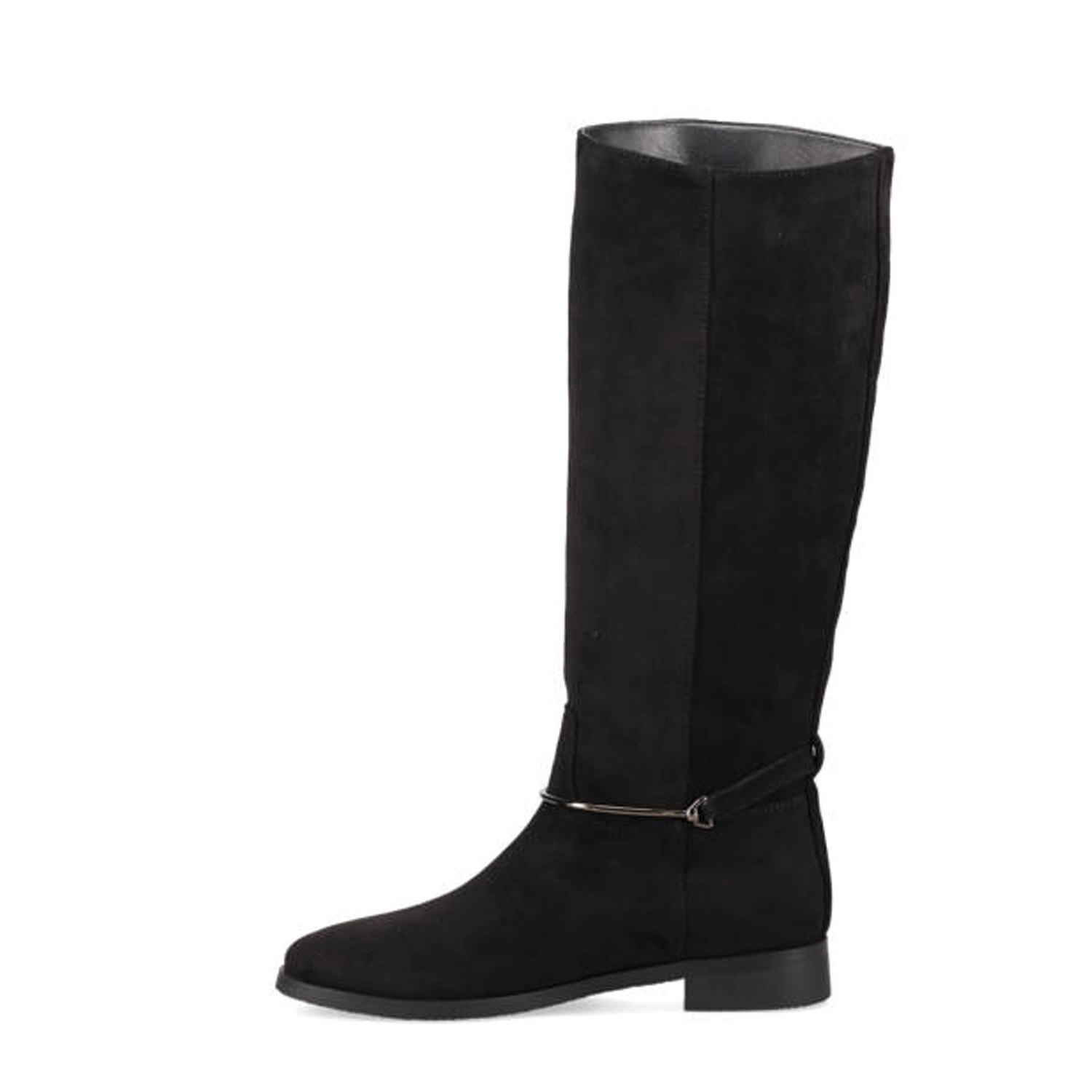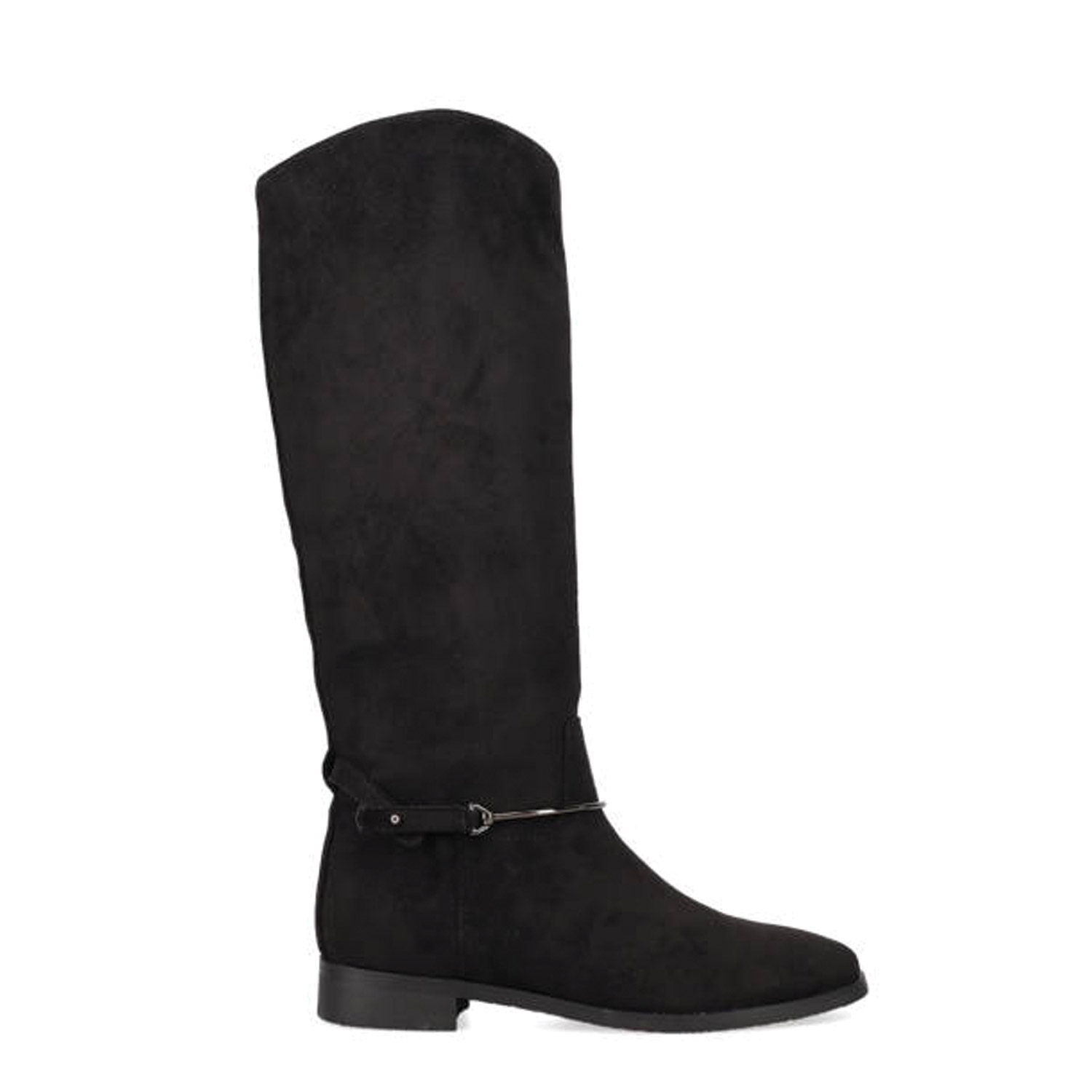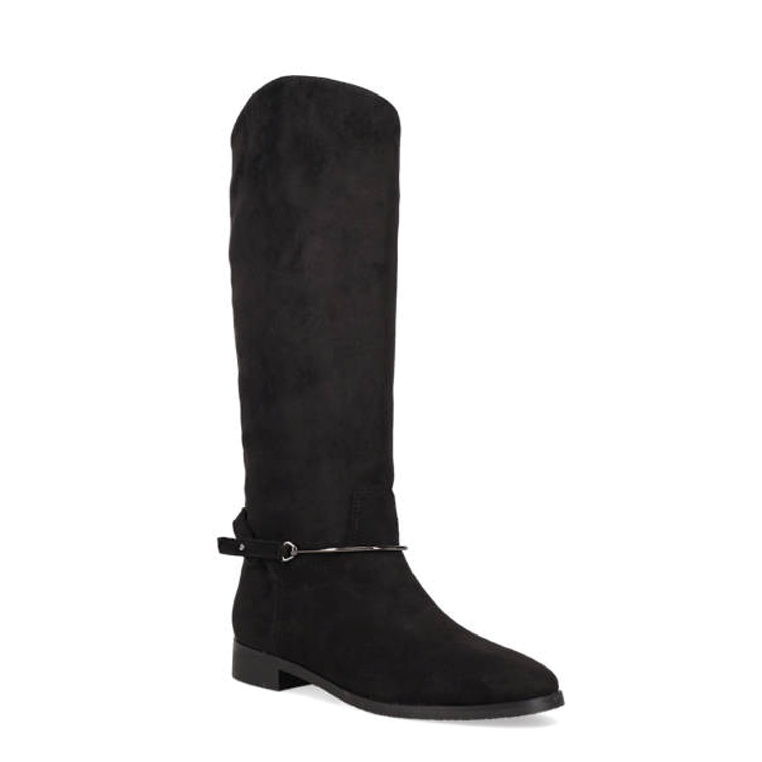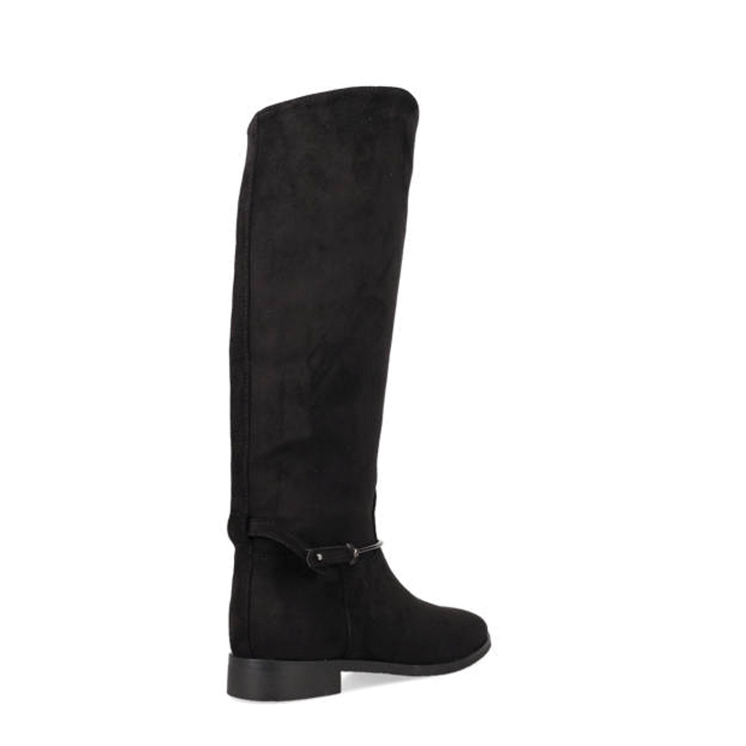 Μαύρη μπότα μέχρι το γόνατο. Διαθέτει σουέντ υφή και χαμηλό τετράγωνο τακούνι.