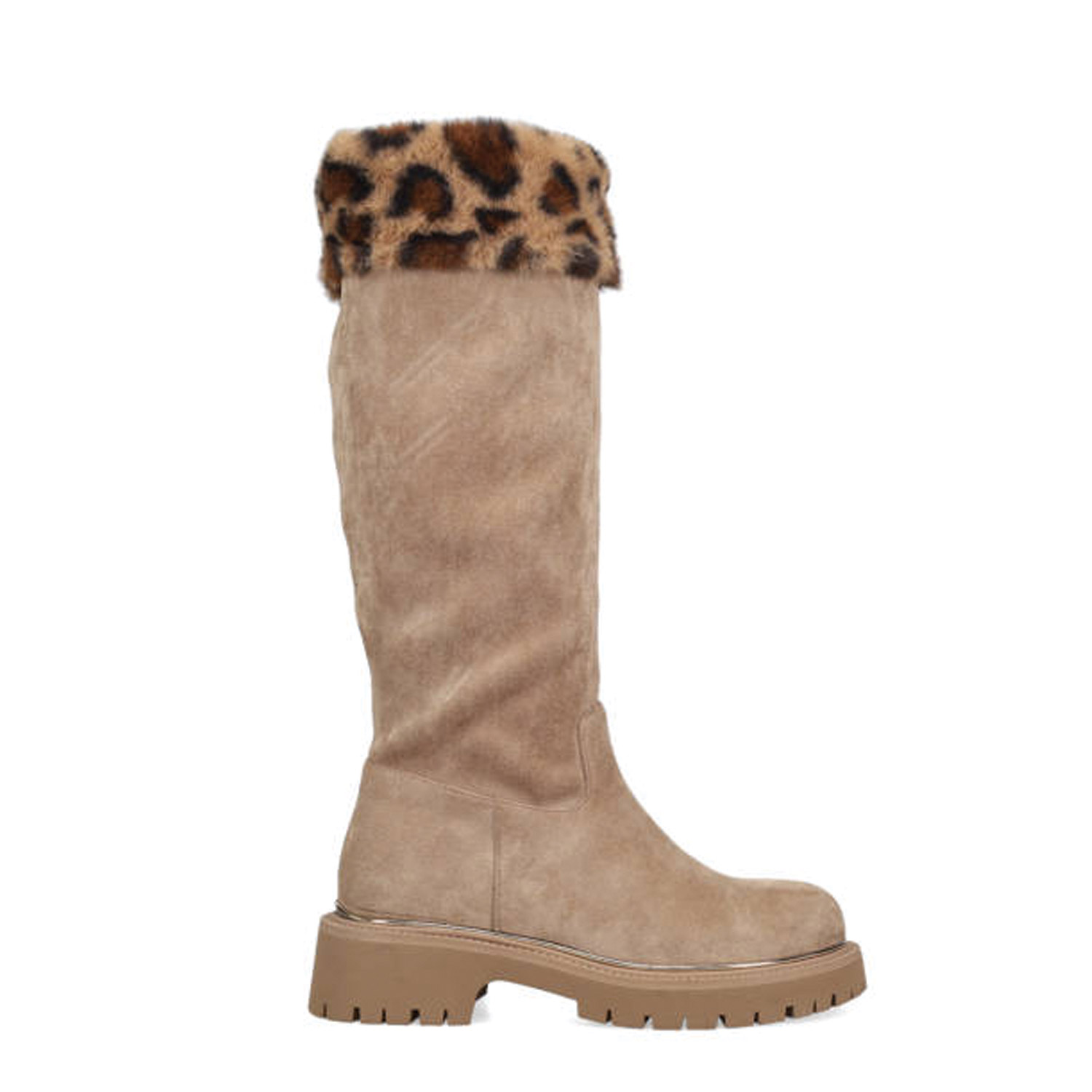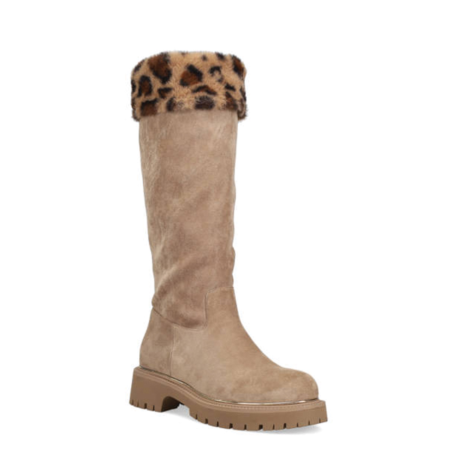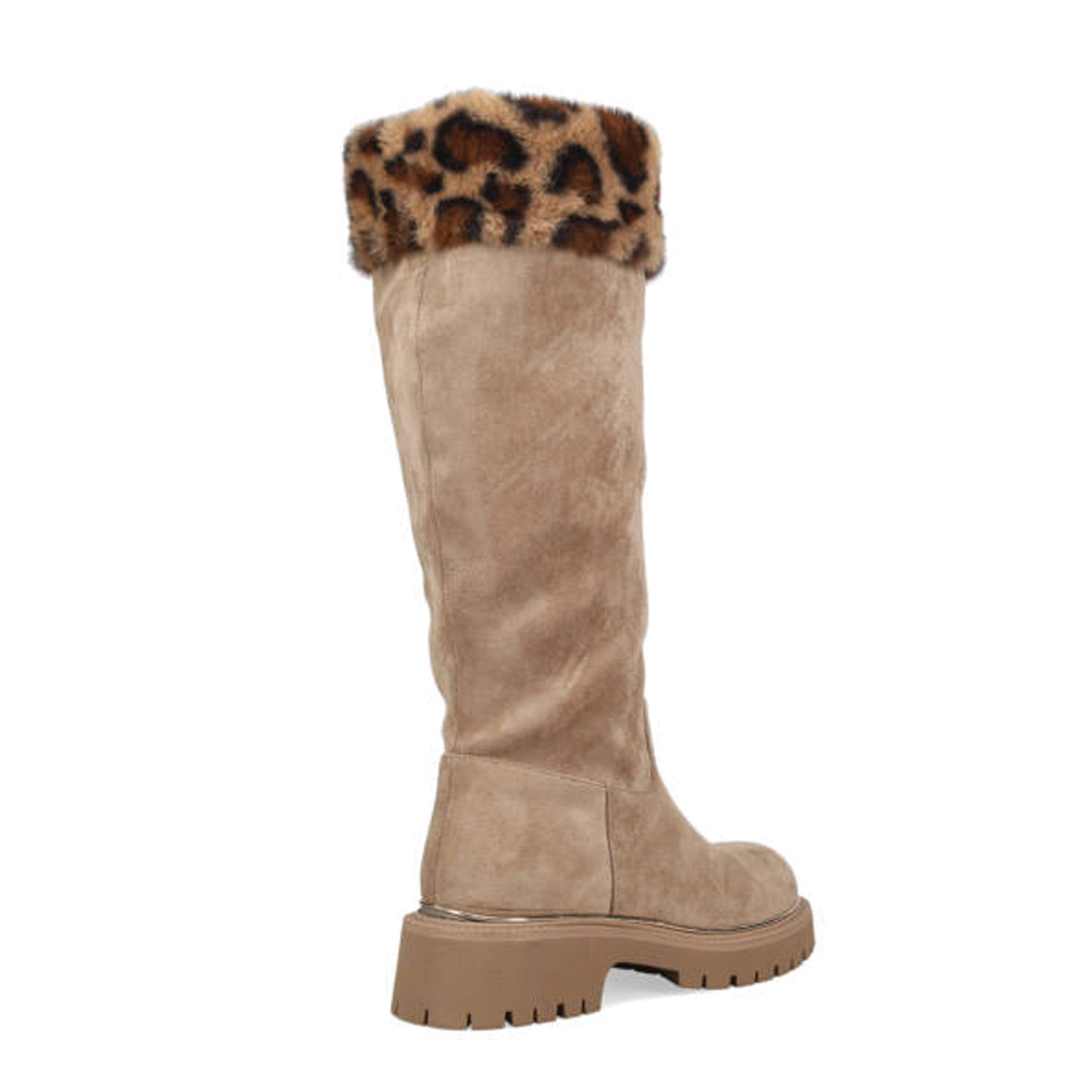Μπεζ μπότα. Διαθέτει σουέντ υφή, λεοπάρ λεπτομέρεια από συνθετική γούνα και τρακτερωτή σόλα. Κλείνει με φερμουάρ.