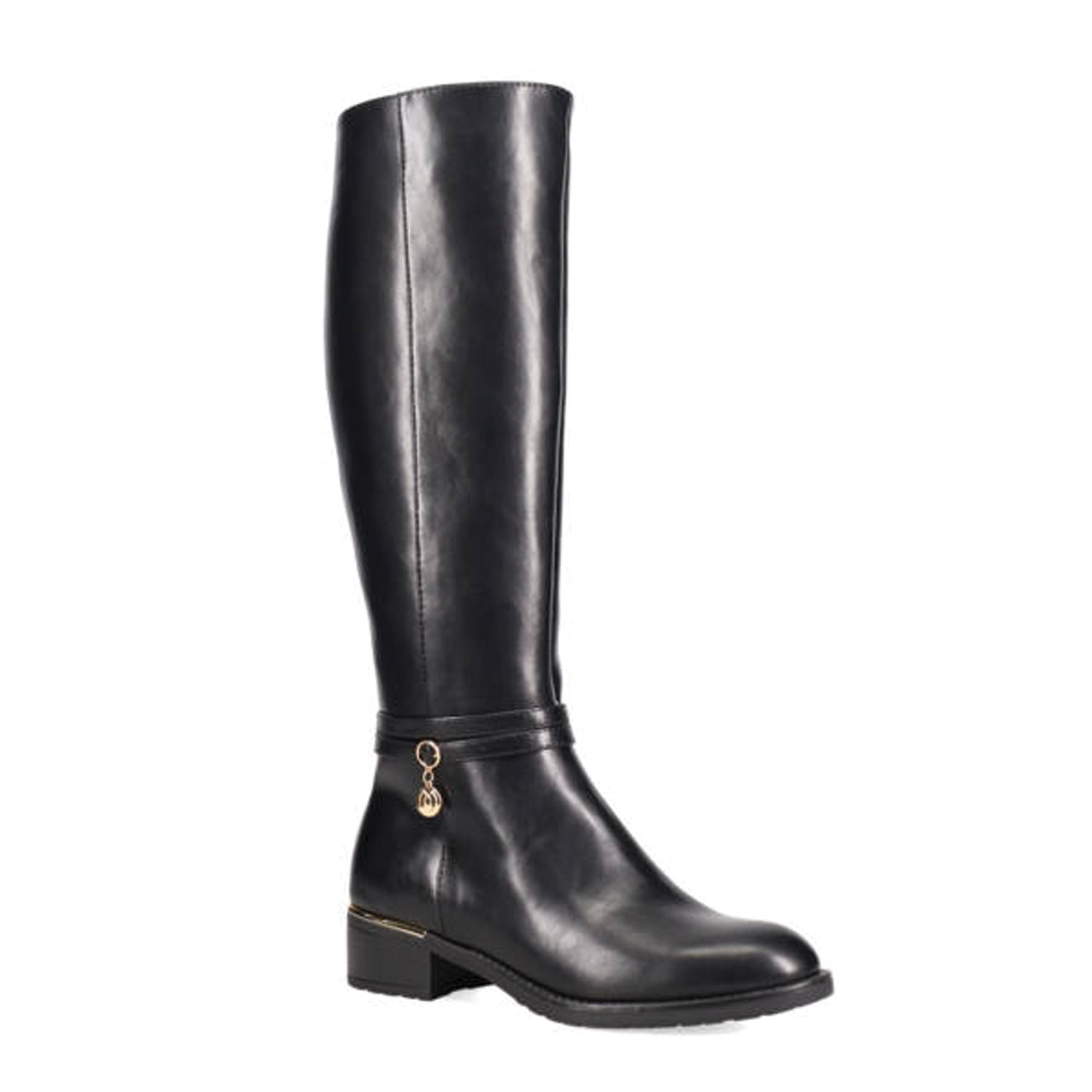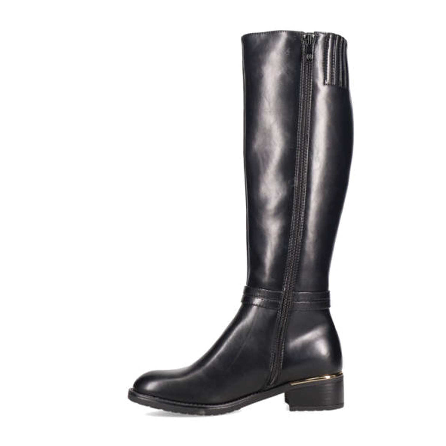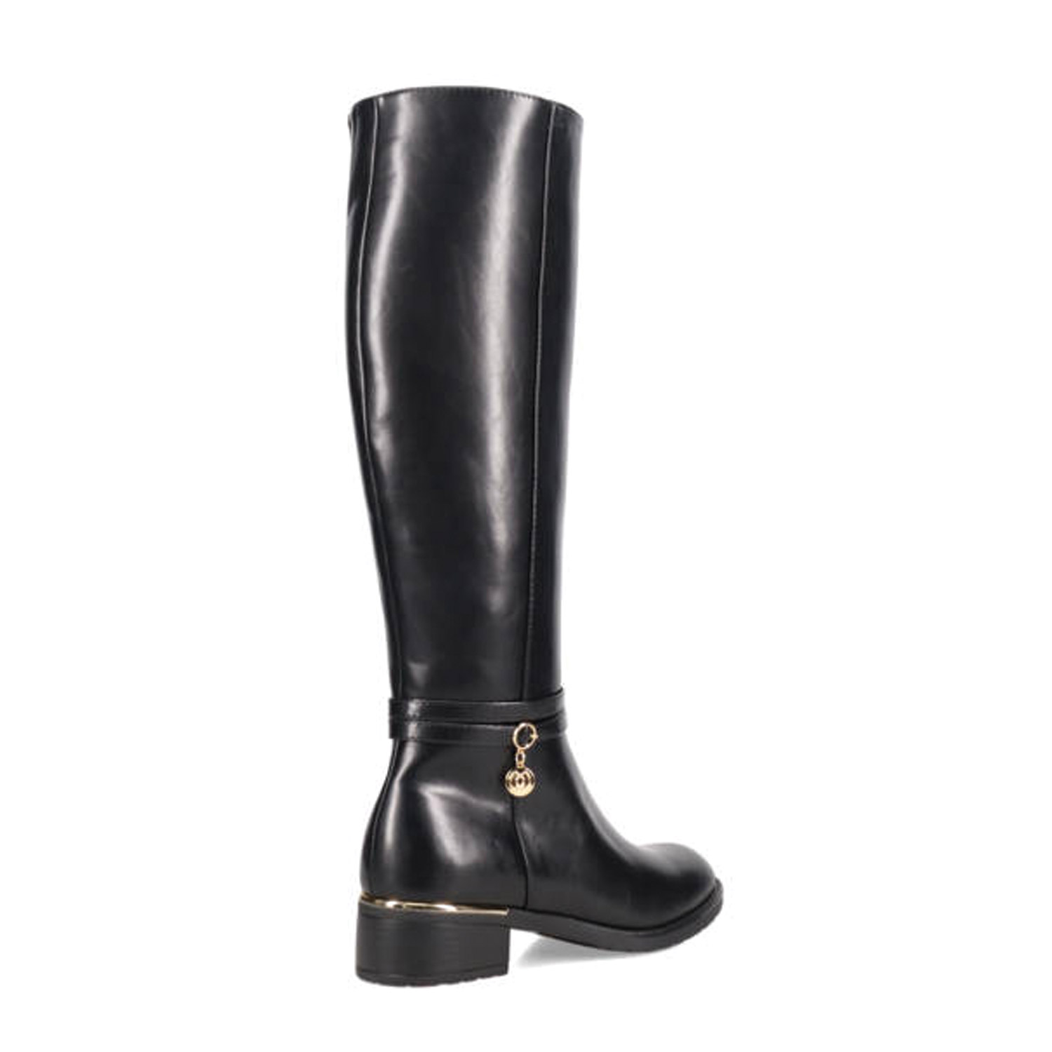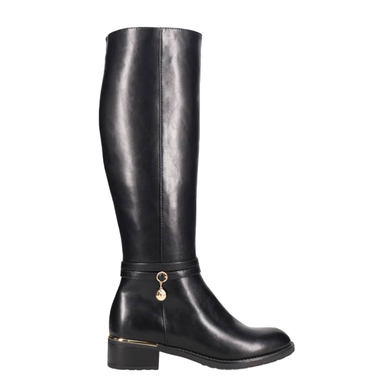 Μαύρη μπότα μέχρι το γόνατο. Διαθέτει χαμηλό χοντρό τακούνι. Κλείνει με φερμουάρ.
