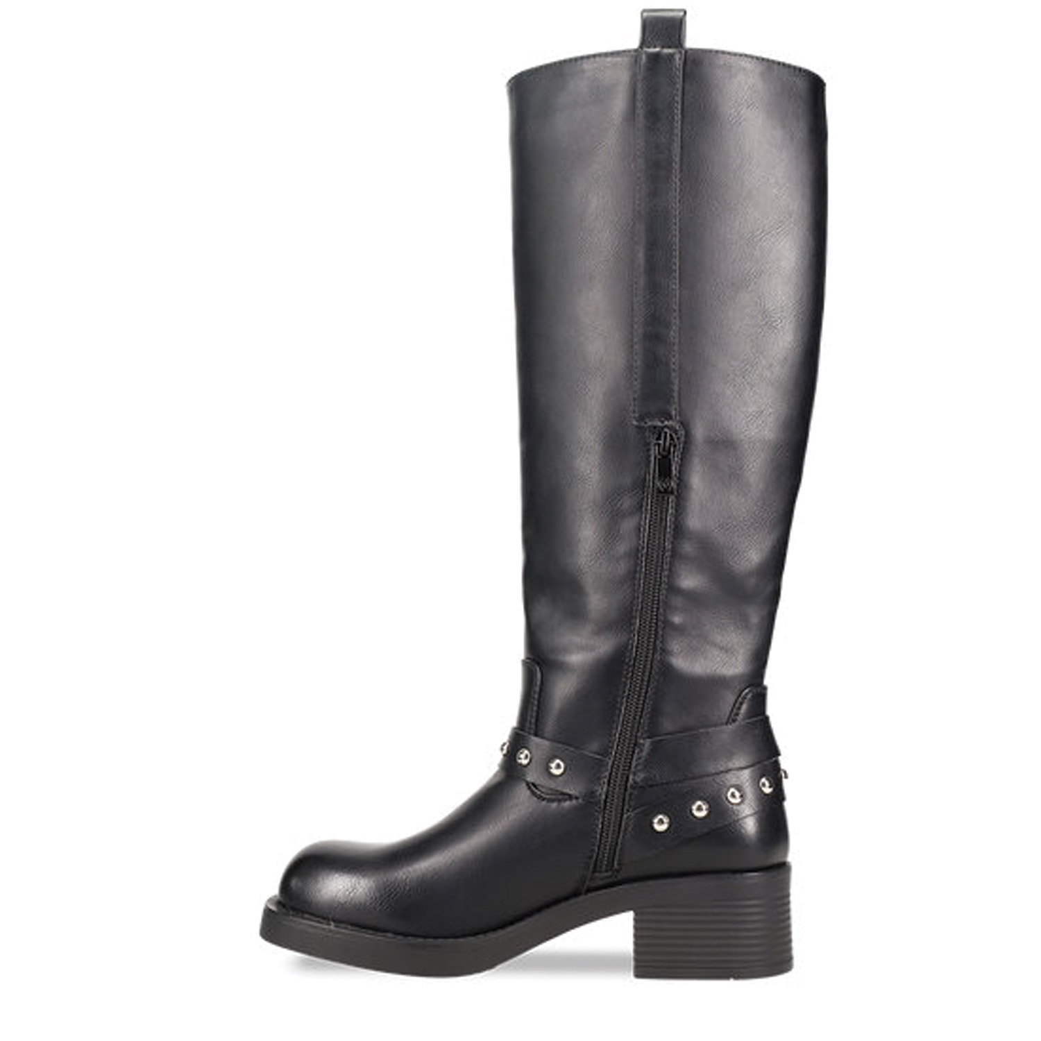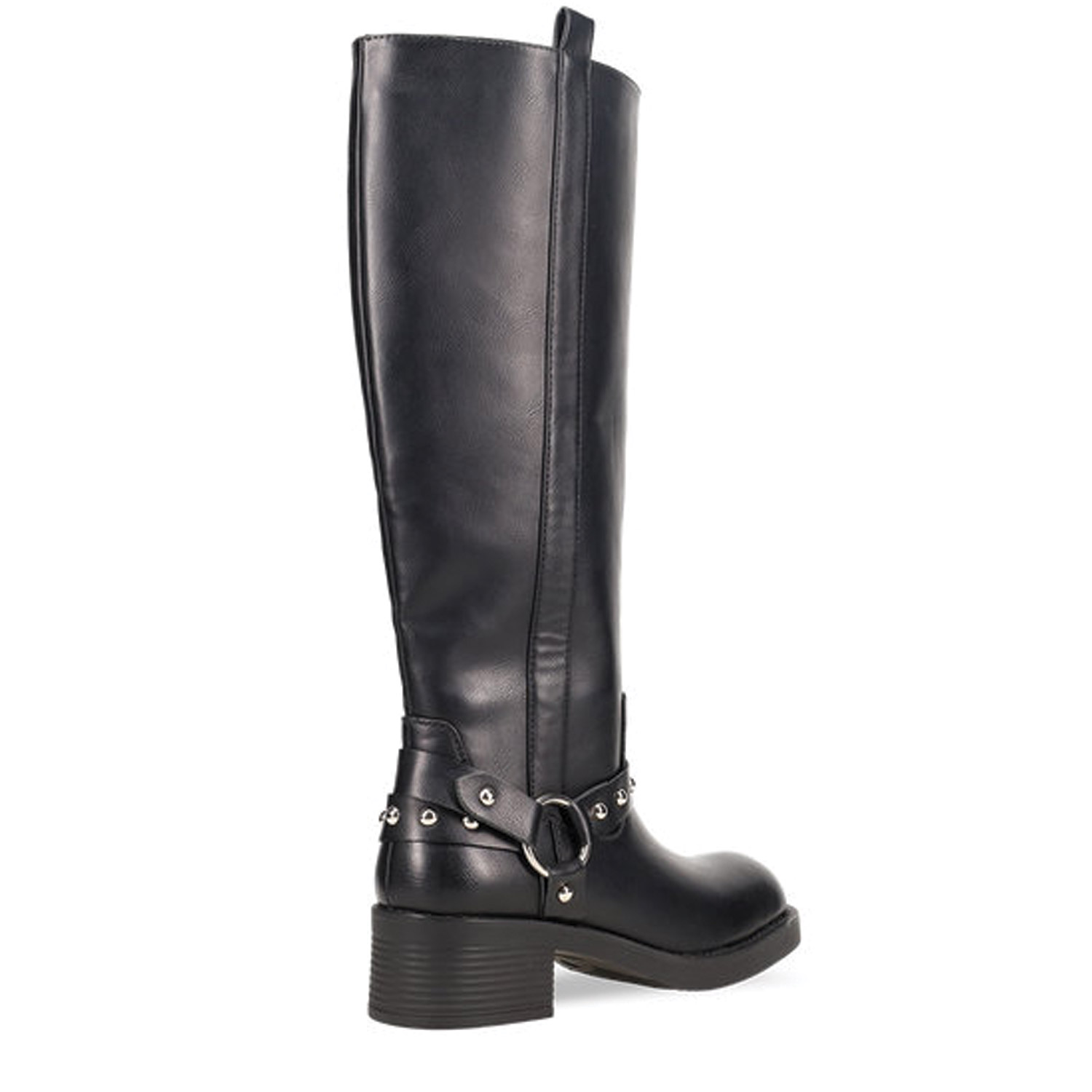 Μαύρη μπότα biker μέχρι το γόνατο. Διαθέτει διακοσμητικά λουράκια στον αστράγαλο. Κλείνει με φερμουάρ στο πλάι.