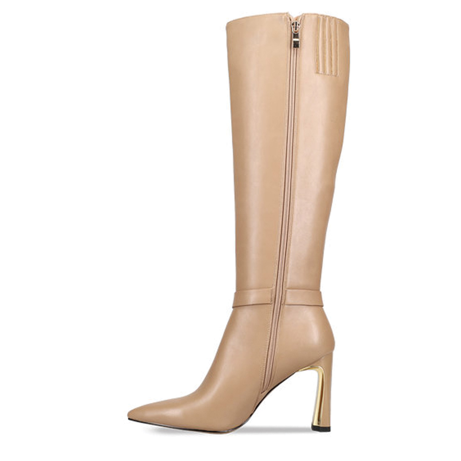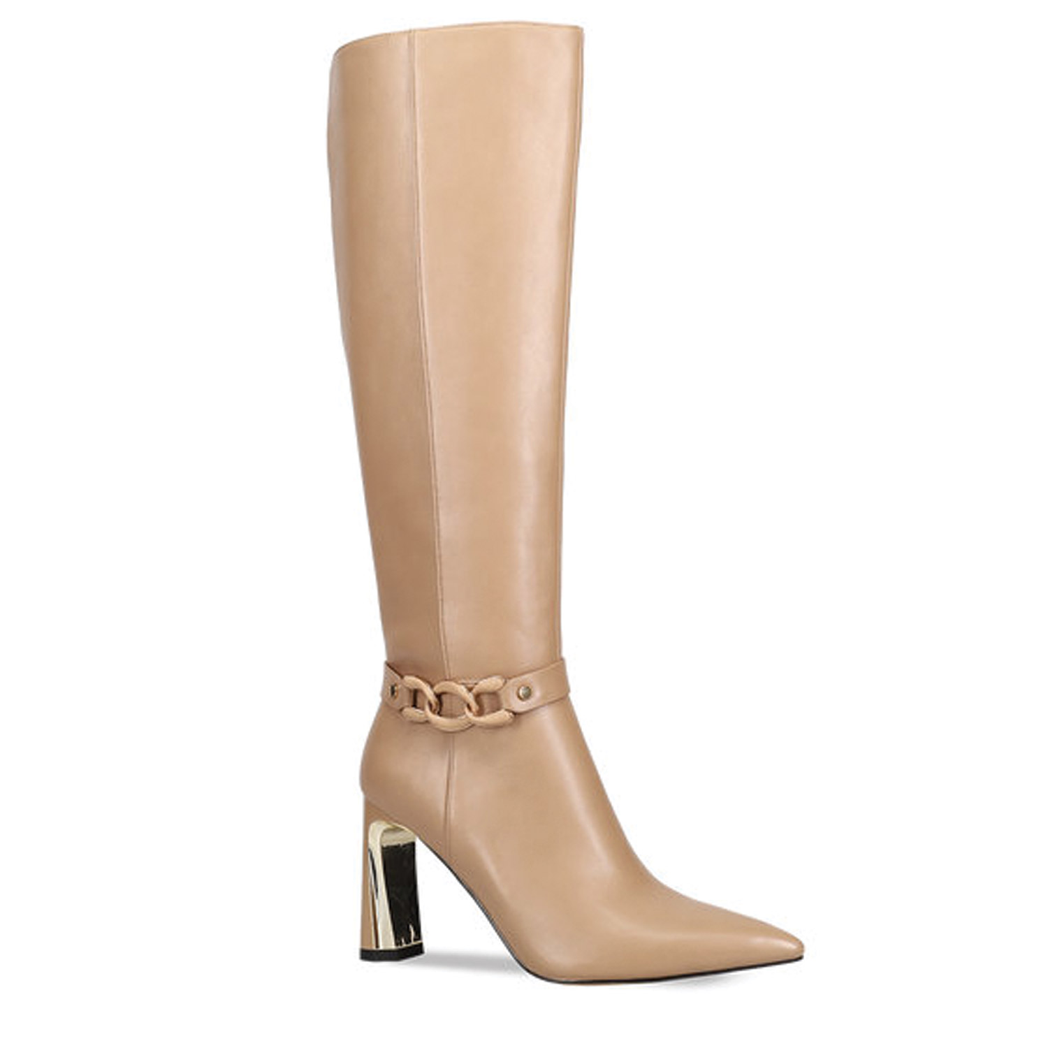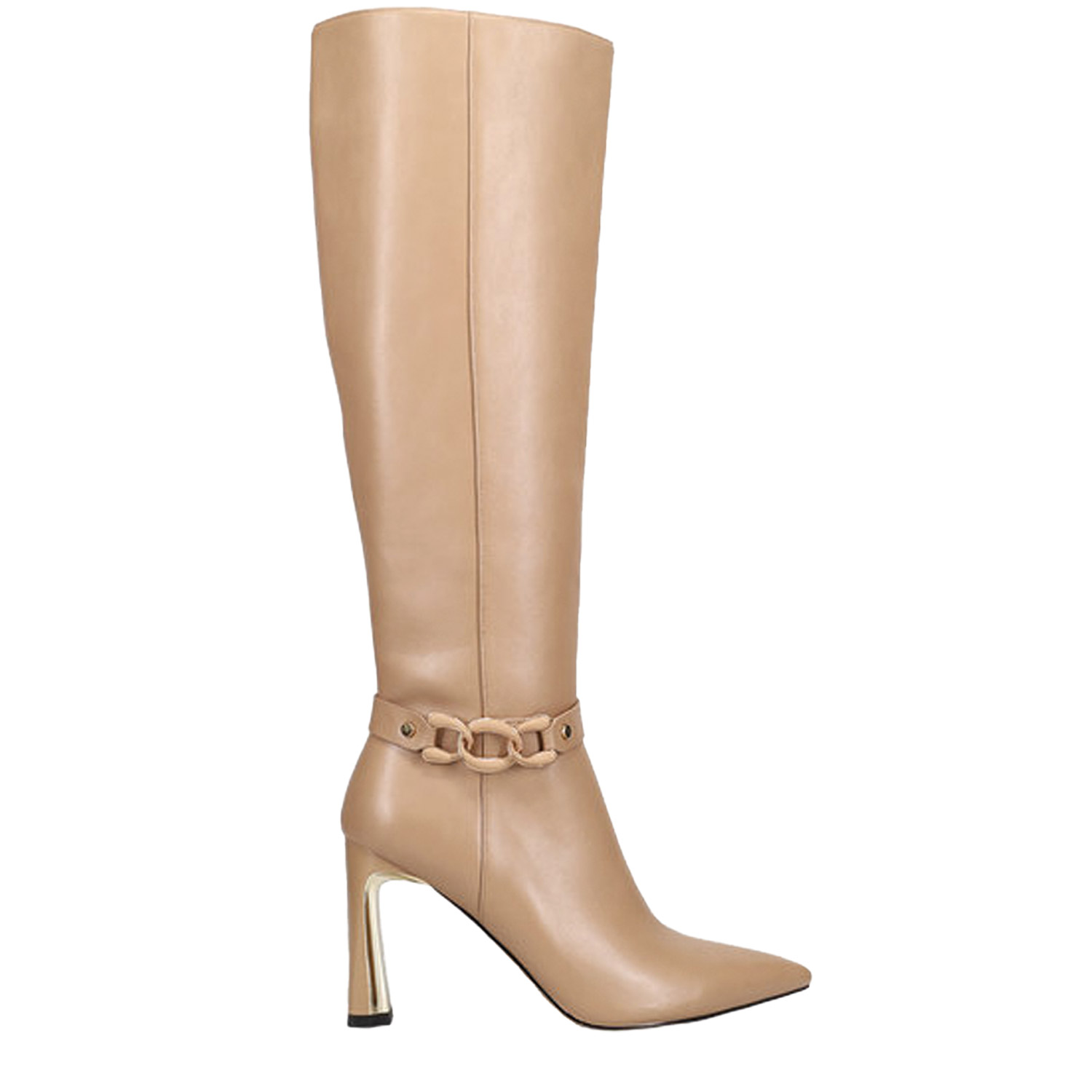 Μπεζ μπότα μέχρι το γόνατο. Διαθέτει χοντρό ψηλό τακούνι με χρυσή λεπτομέρεια και χρυσή διακοσμητική αλυσίδα αστραγάλου. Κλείνει με φερμουάρ στο πλάι.