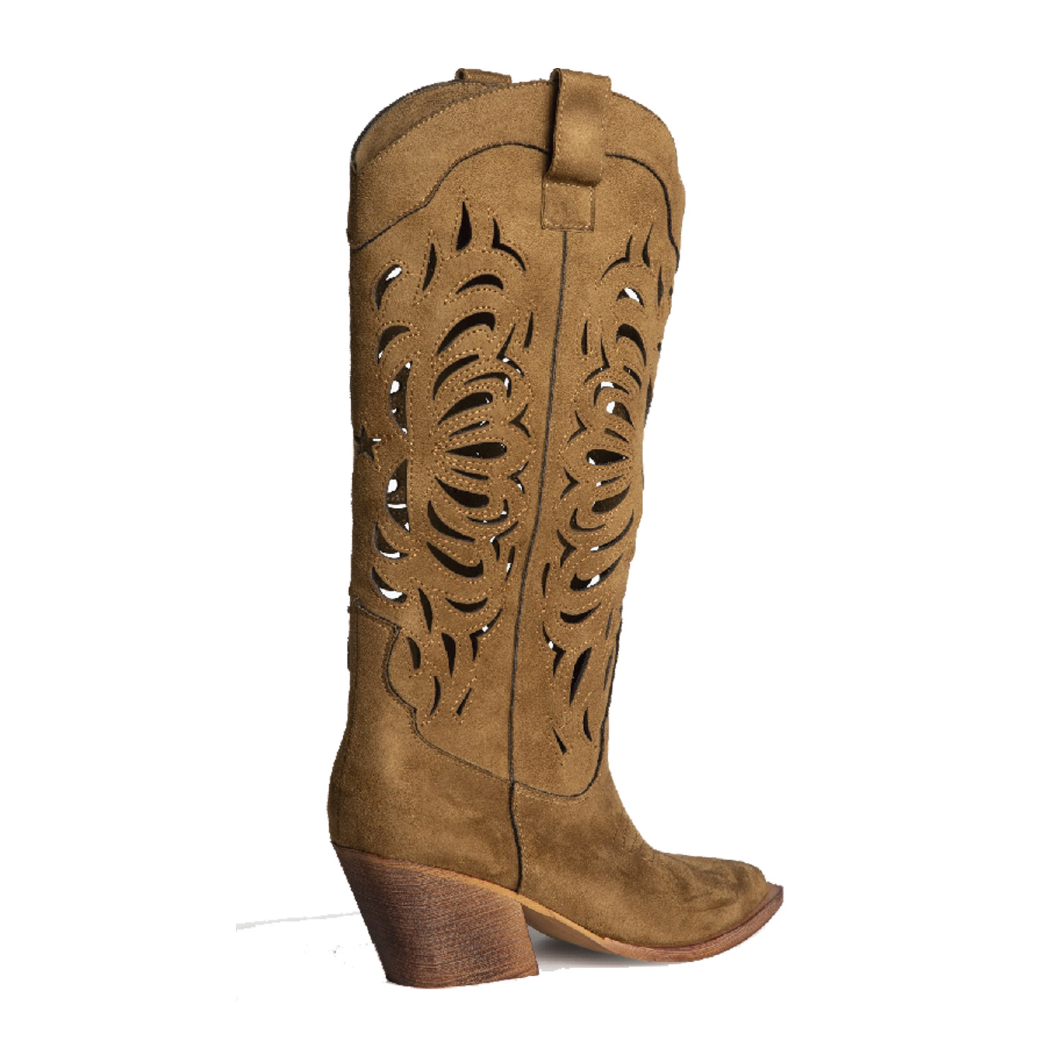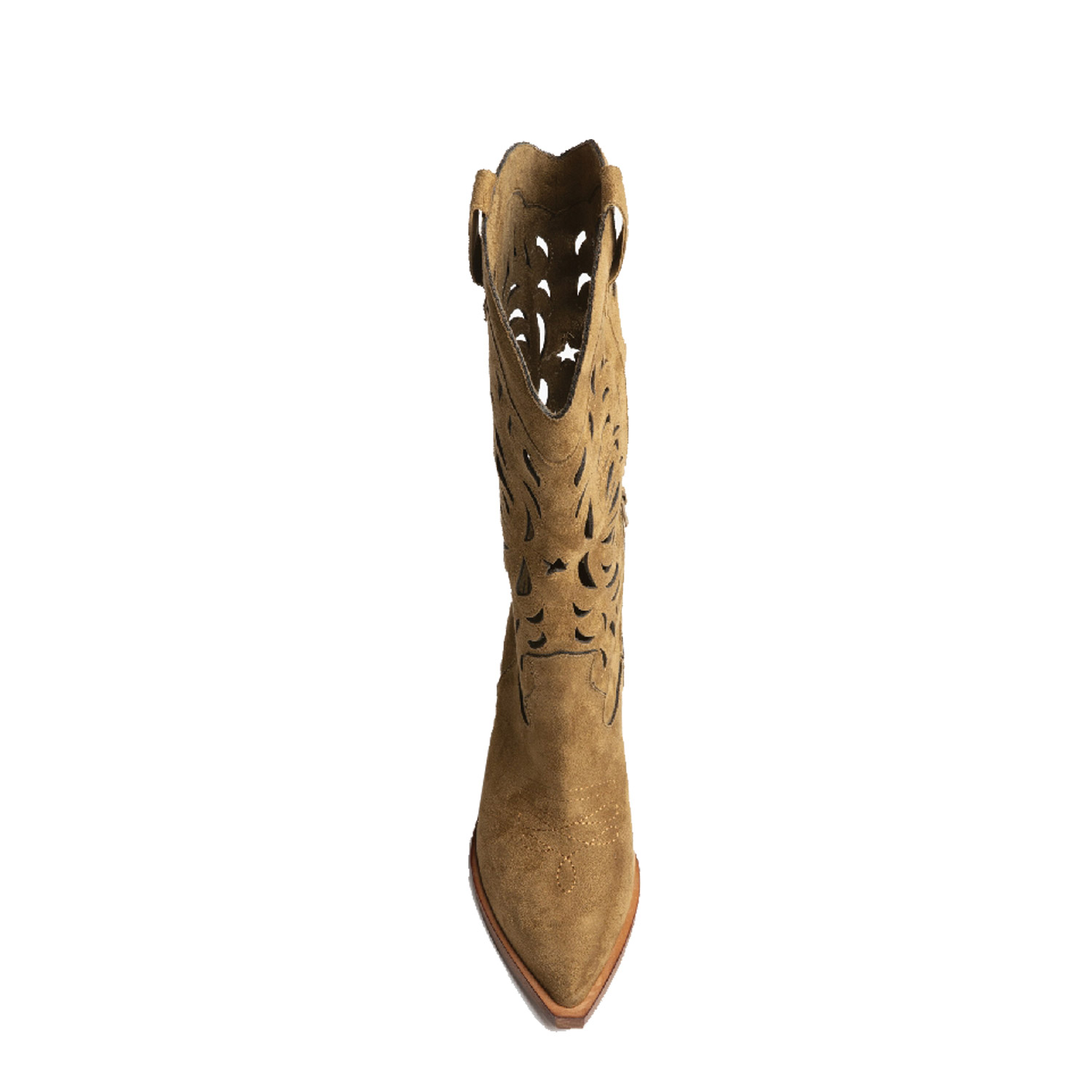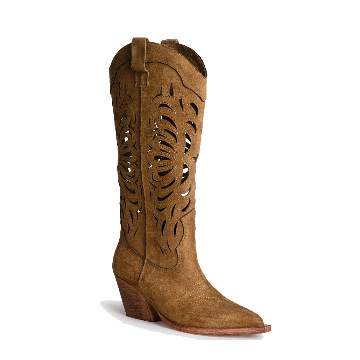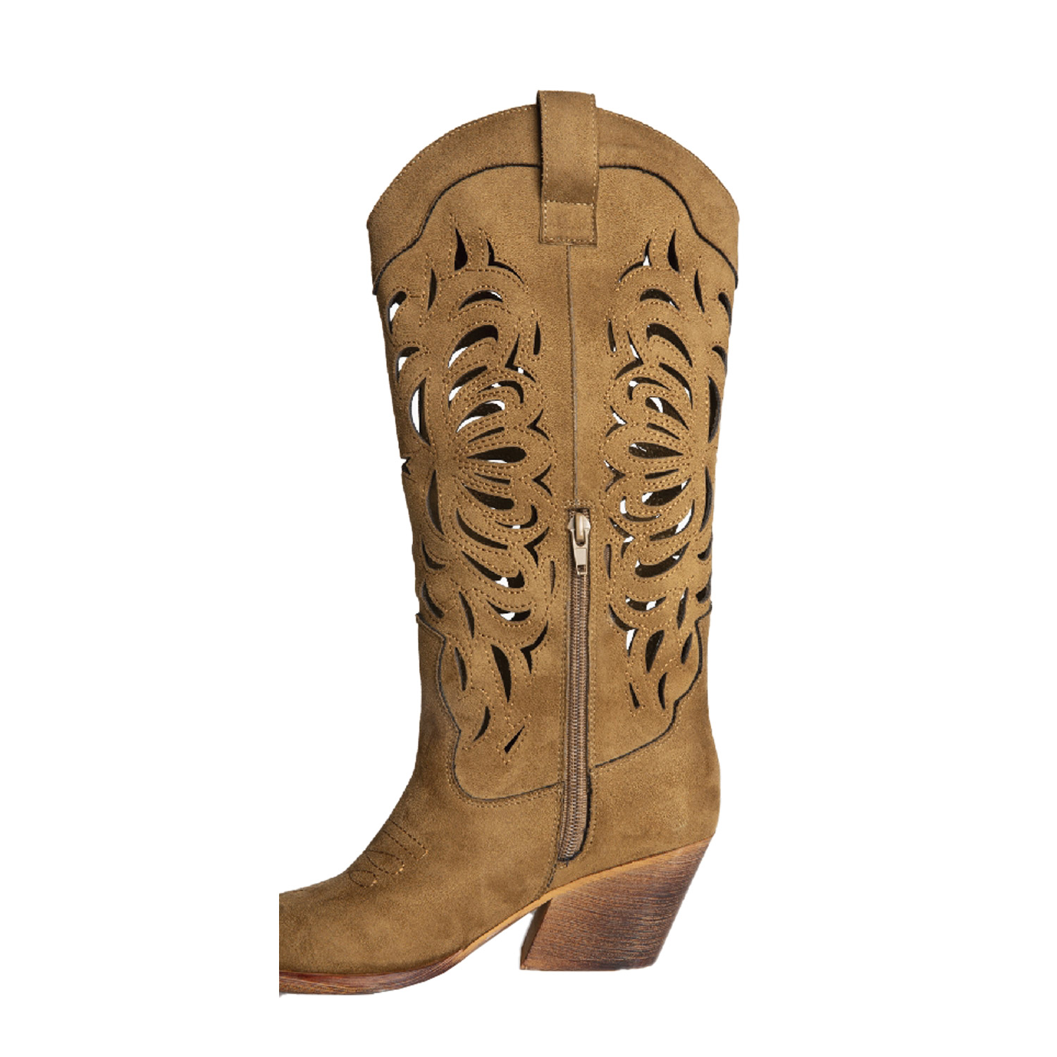 Μπότα σε western γραμμή που αποπνέει δυναμισμό και θηλυκότητα, ιδανική για εμφανίσεις που ξεχωρίζουν. Το χαρακτηριστικό καουμπόικο κόψιμο αγκαλιάζει όμορφα το πόδι, ενώ το τακούνι ύψους 6,5 εκ. προσφέρει κομψότητα και σταθερότητα σε κάθε βήμα. Ένα διαχρονικό σχέδιο που συνδυάζεται εύκολα με jeans, φορέματα ή φούστες, από το πρωί έως το βράδυ.