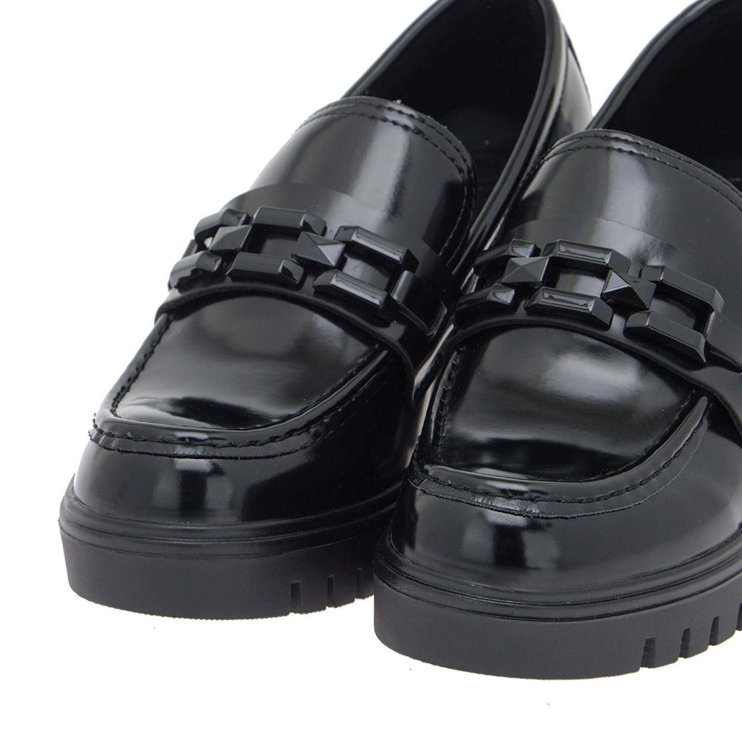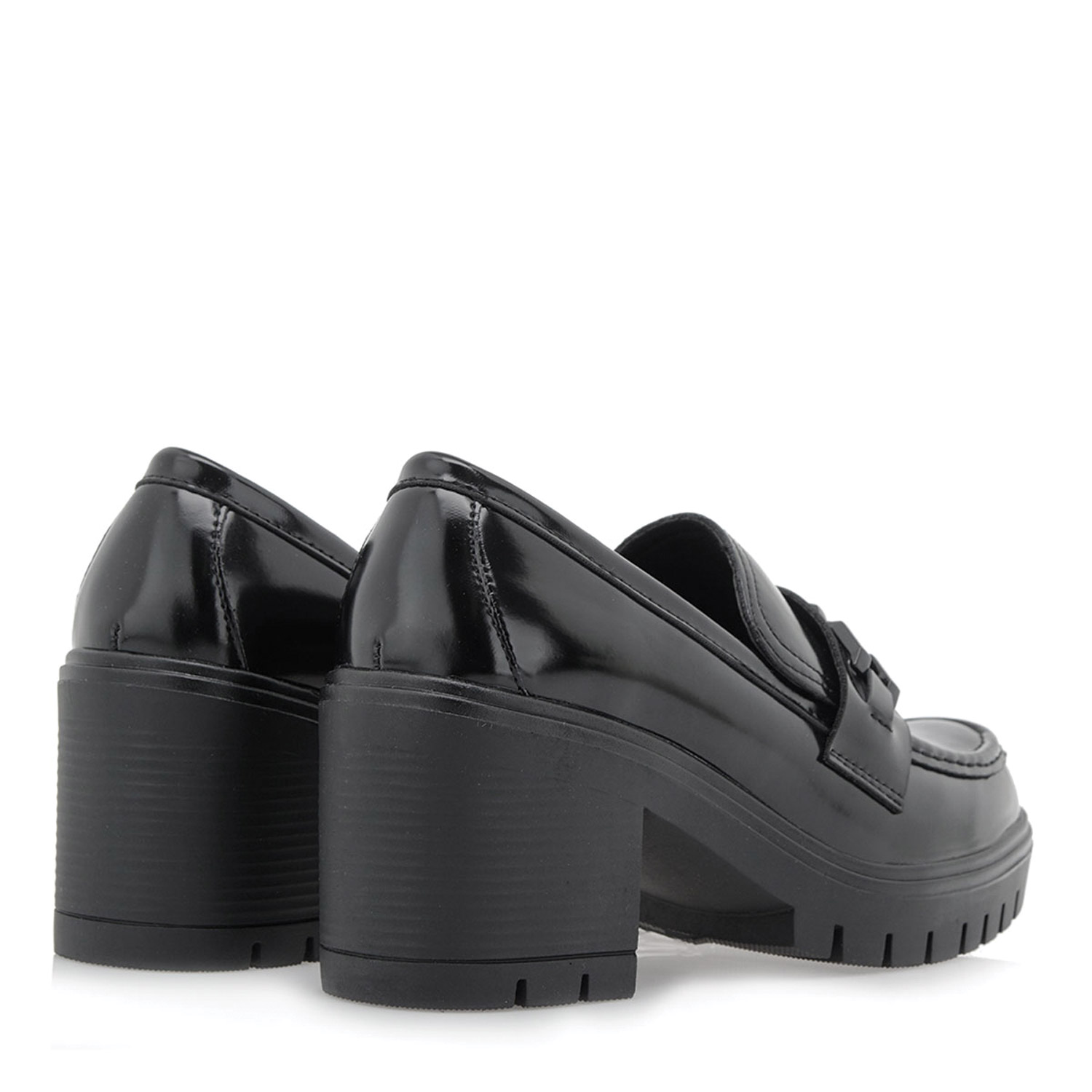 Exe γυναικείο loafer, σε μαύρο φλορεντίκ χρώμα, κατασκευασμένο από οικολογικό δέρμα. Ύψος τακουνιού 8εκ.