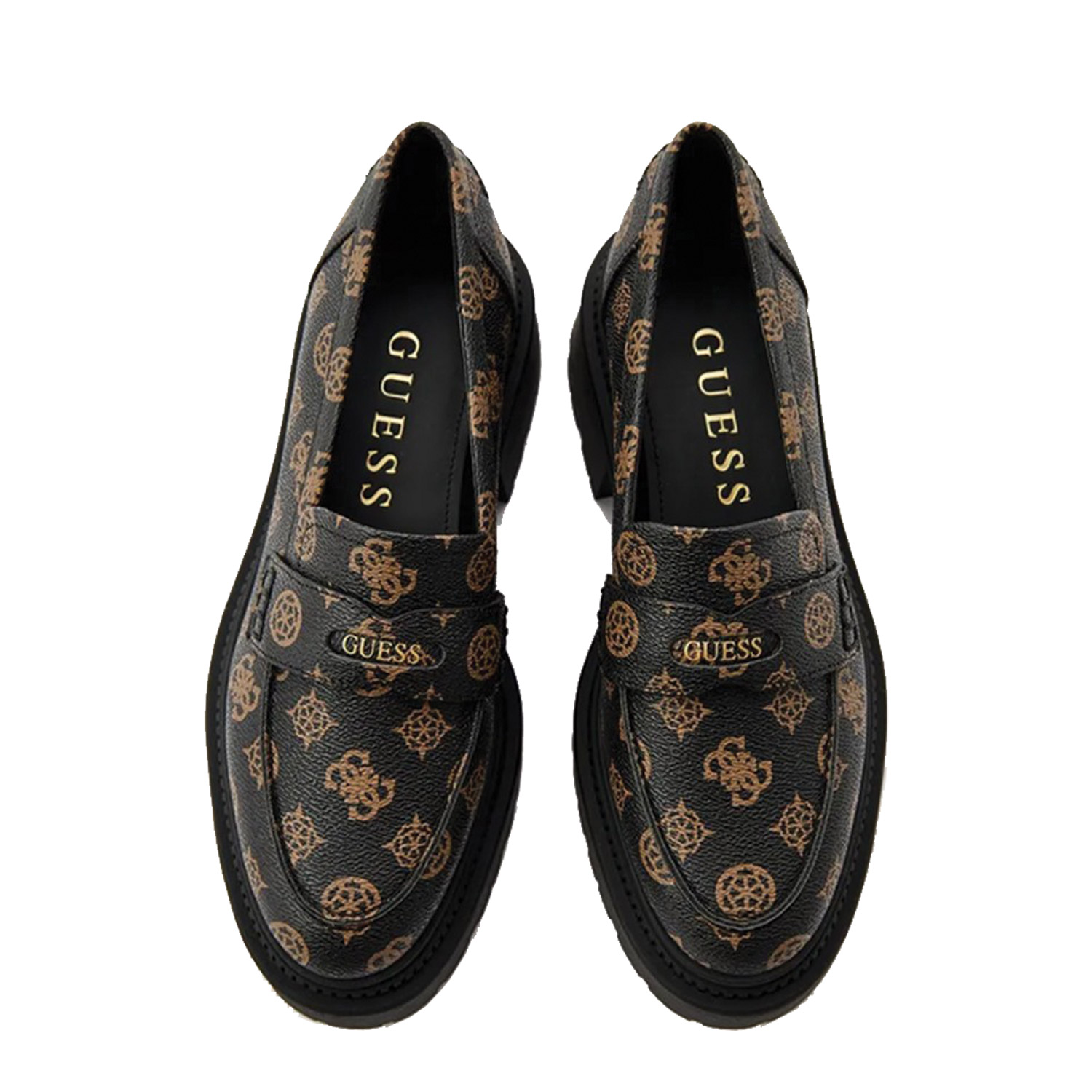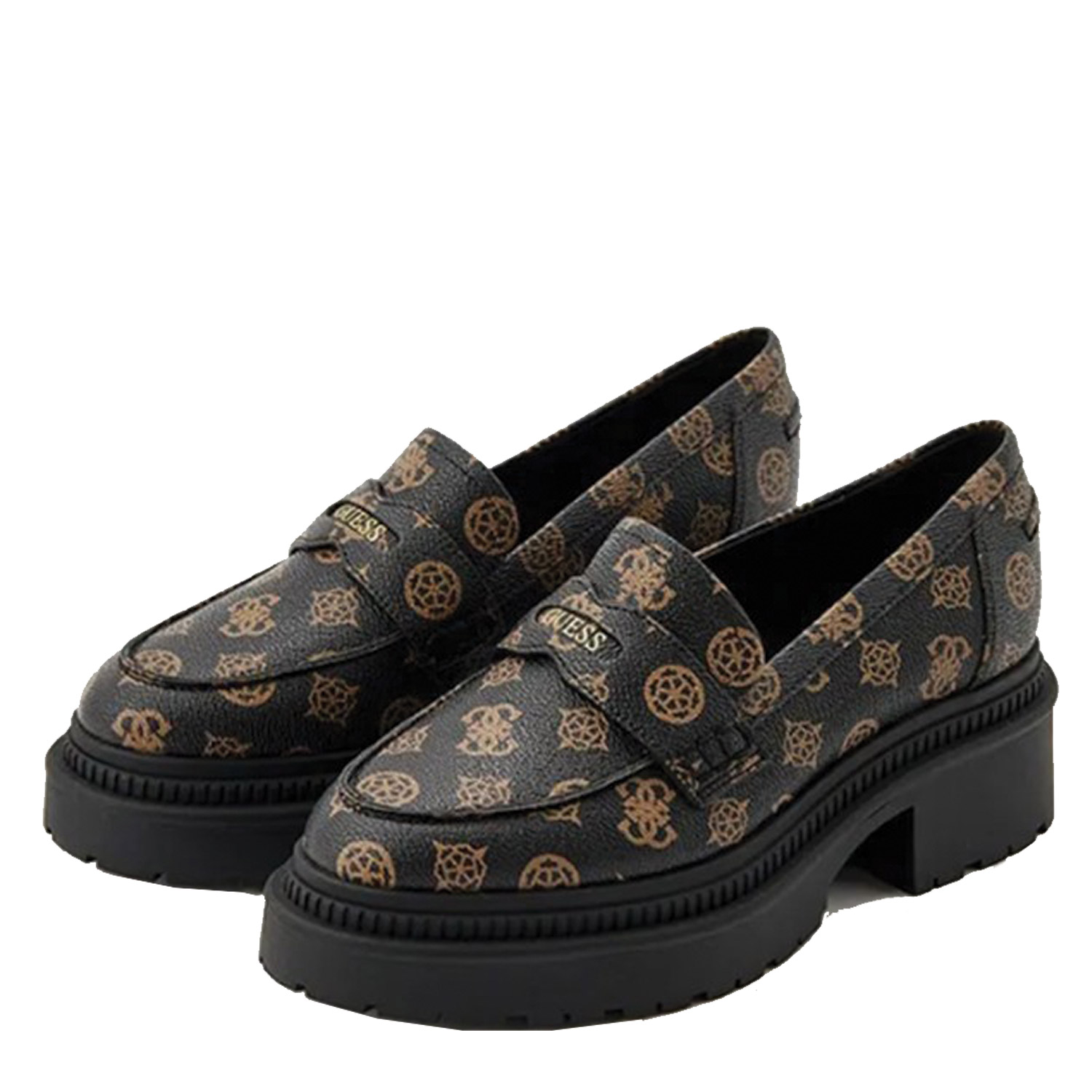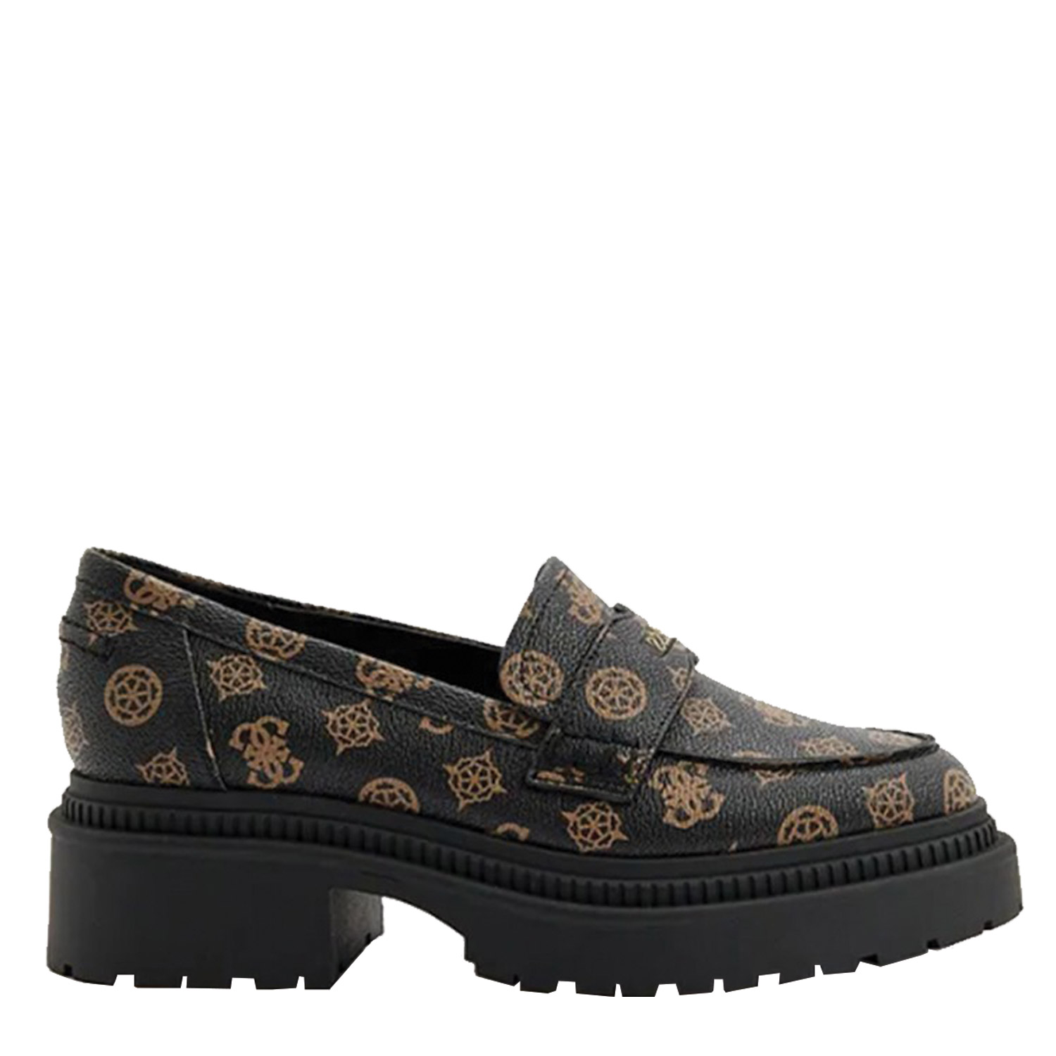Guess γυναικείο loafer, σε καφέ χρώμα, κατασκευασμένο από οικολογικό δέρμα. Ύψος τακουνιού 4εκ.