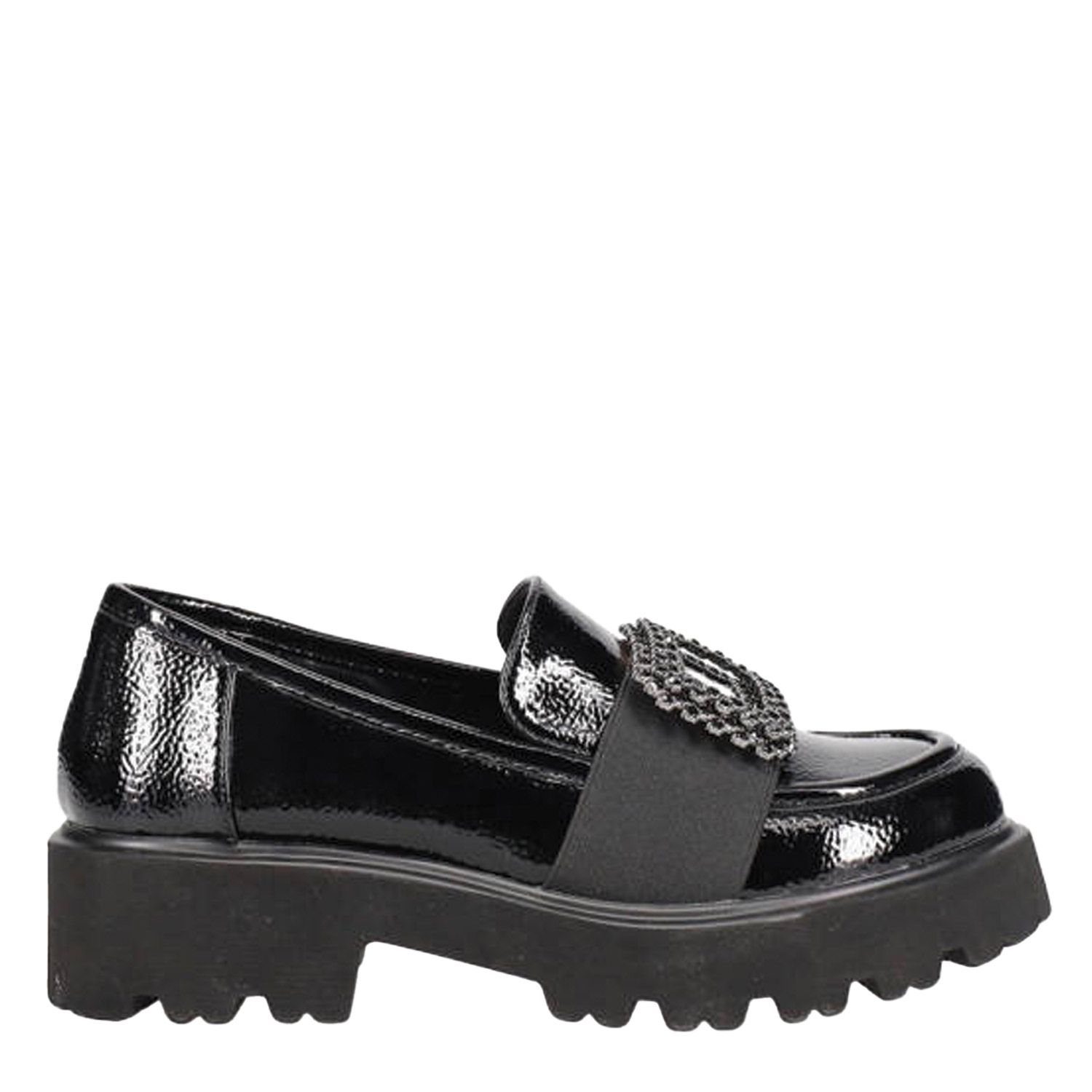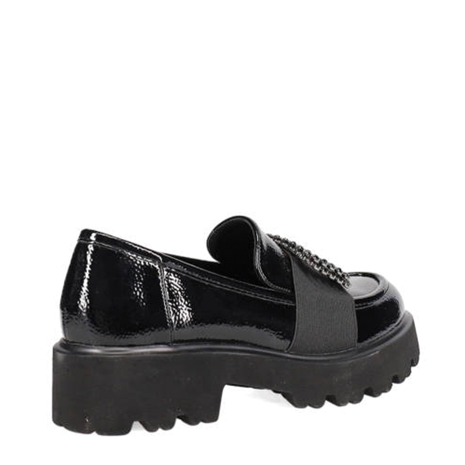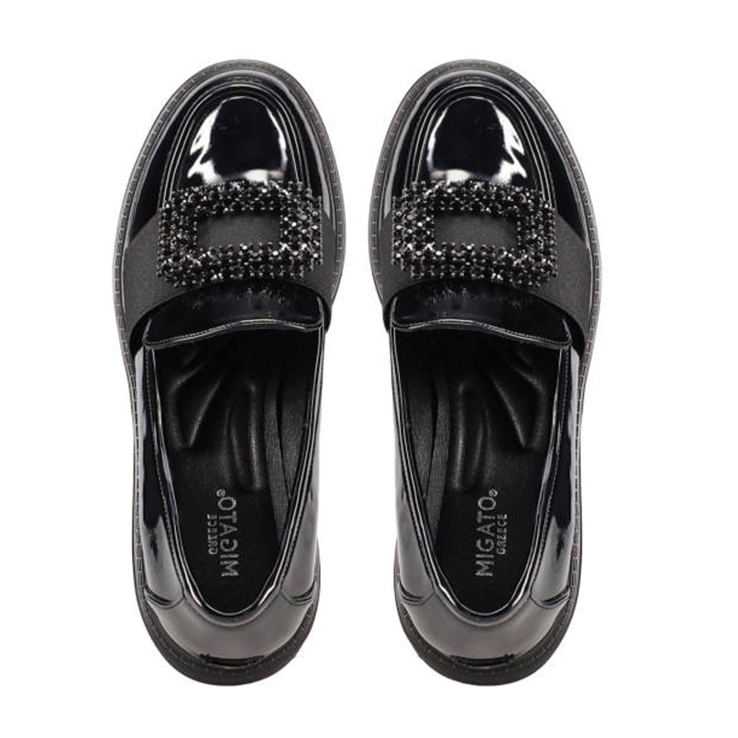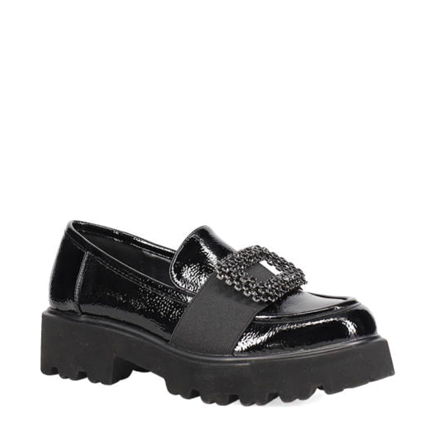 Μαύρο chunky loafer. Διαθέτει διακοσμητική αγκράφα και τρακτερωτή σόλα.