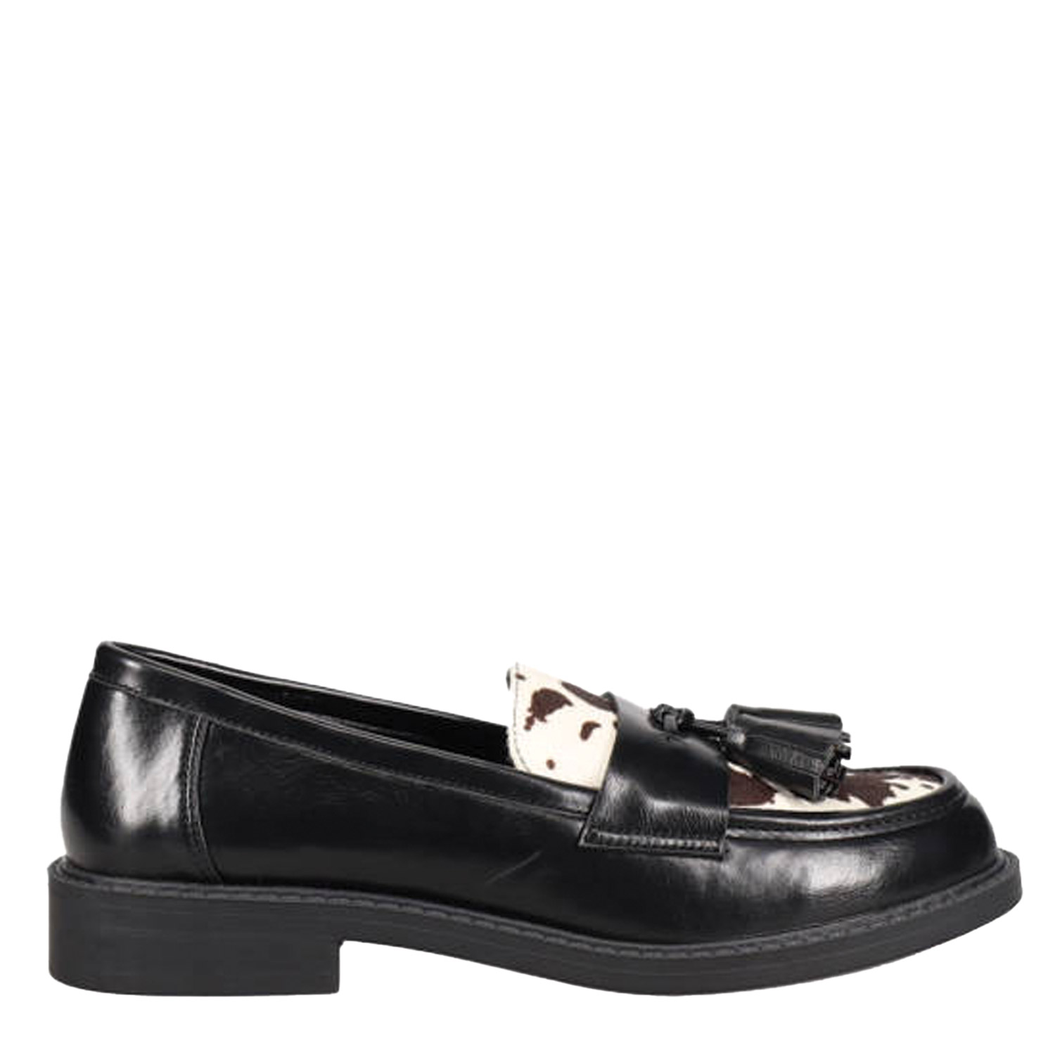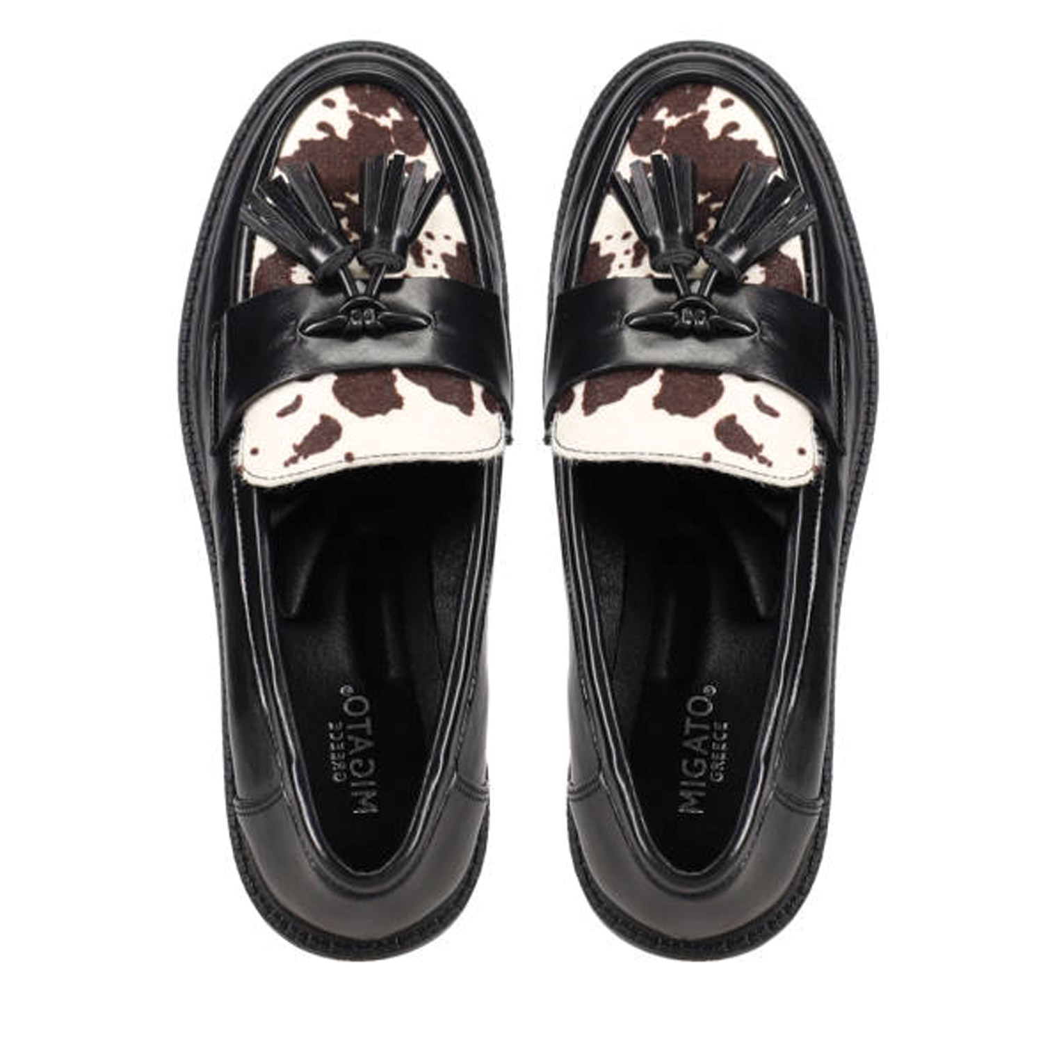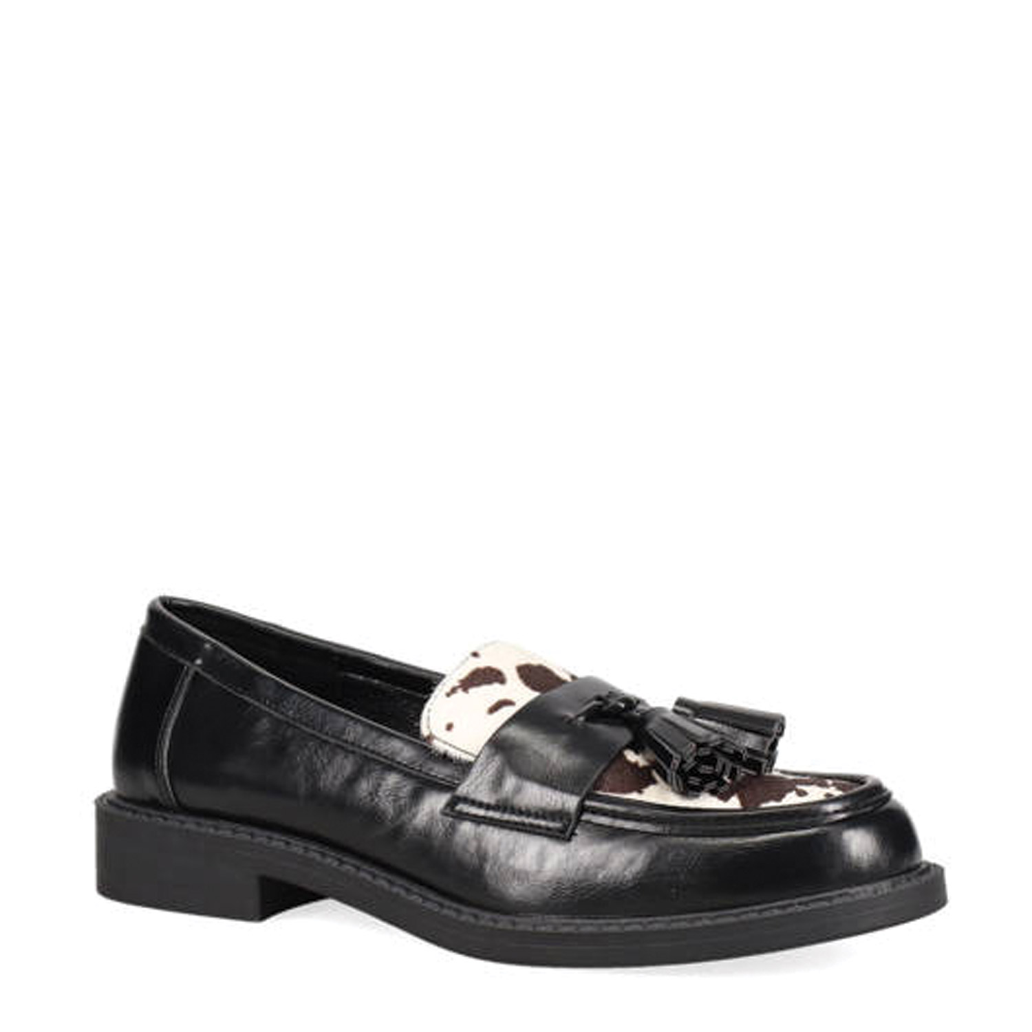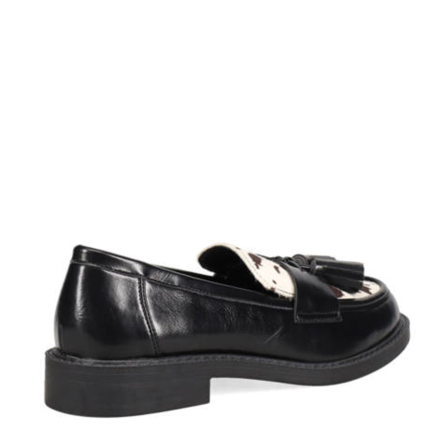 Μαύρο loafer. Διαθέτει animal print λεπτομέρεια και διακοσμητικά κρόσσια.