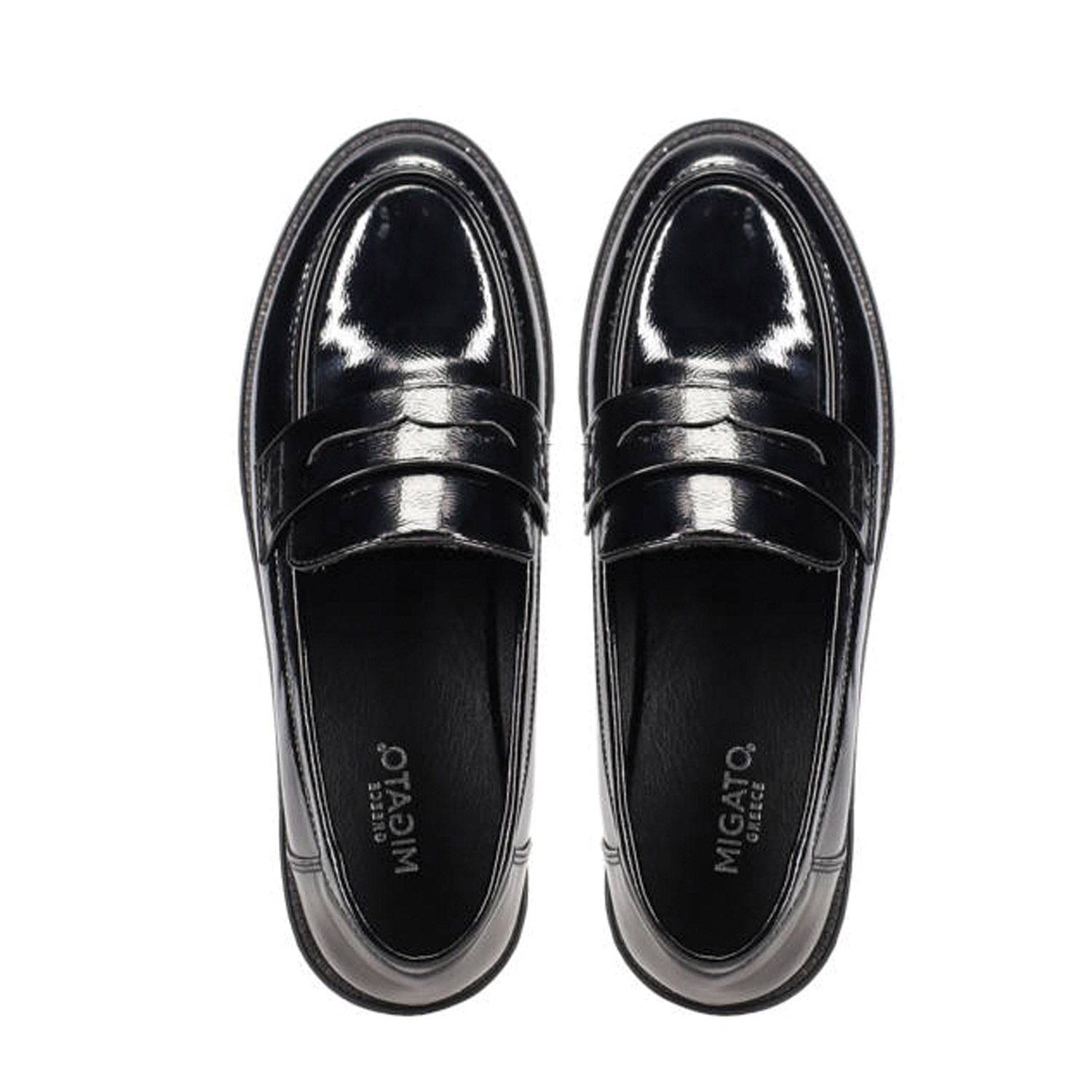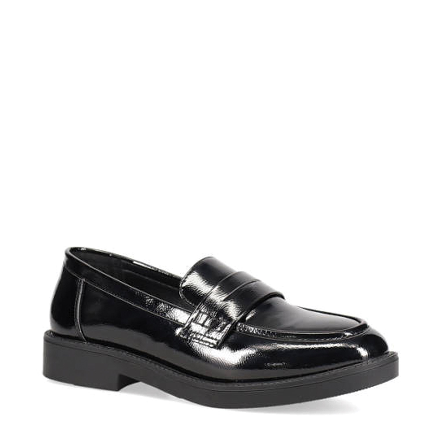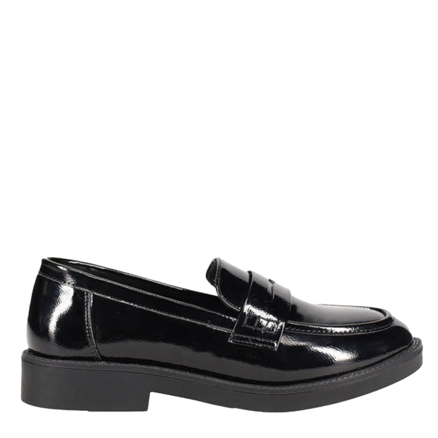 Μαύρο loafer. Διαθέτει χαμηλό τετράγωνο τακούνι.