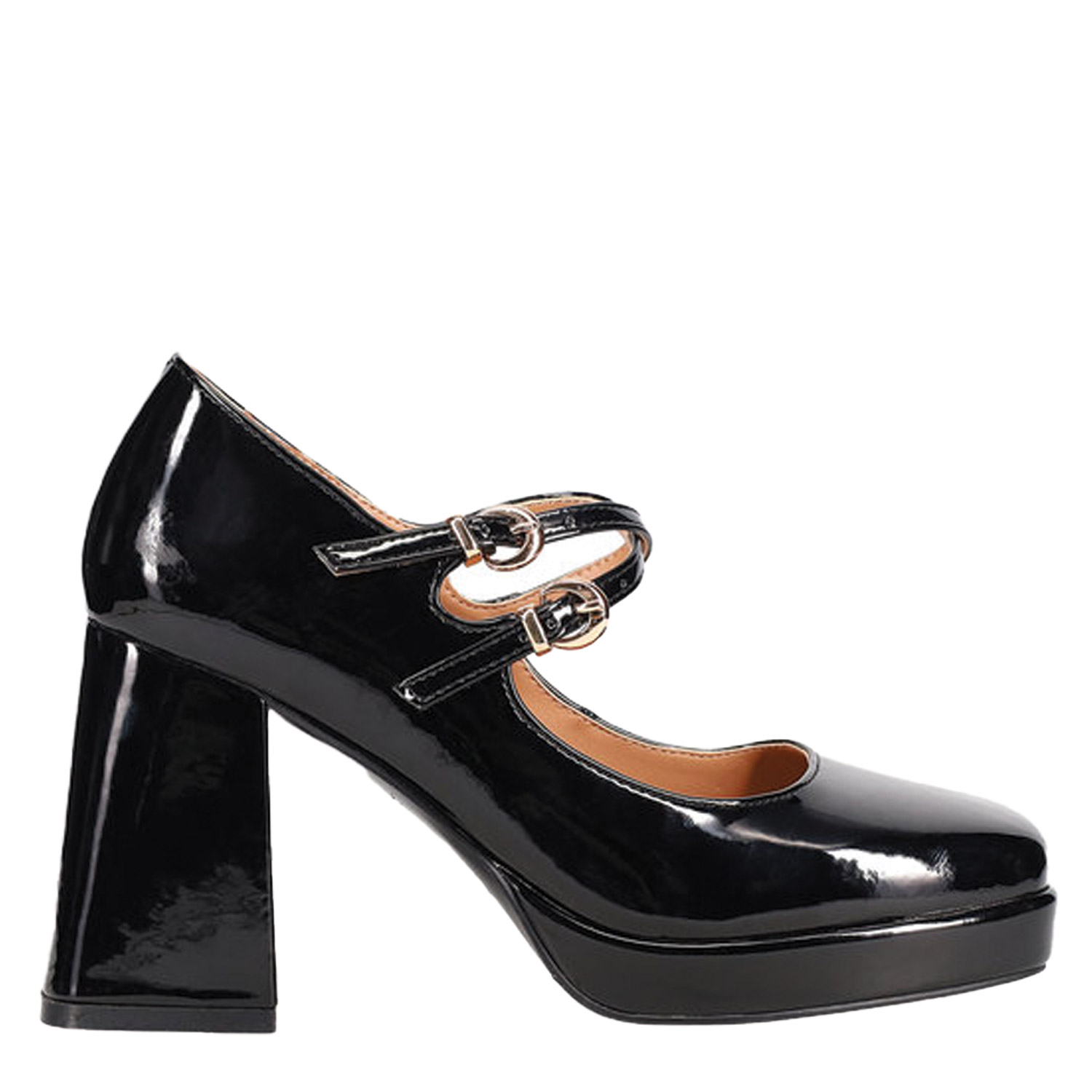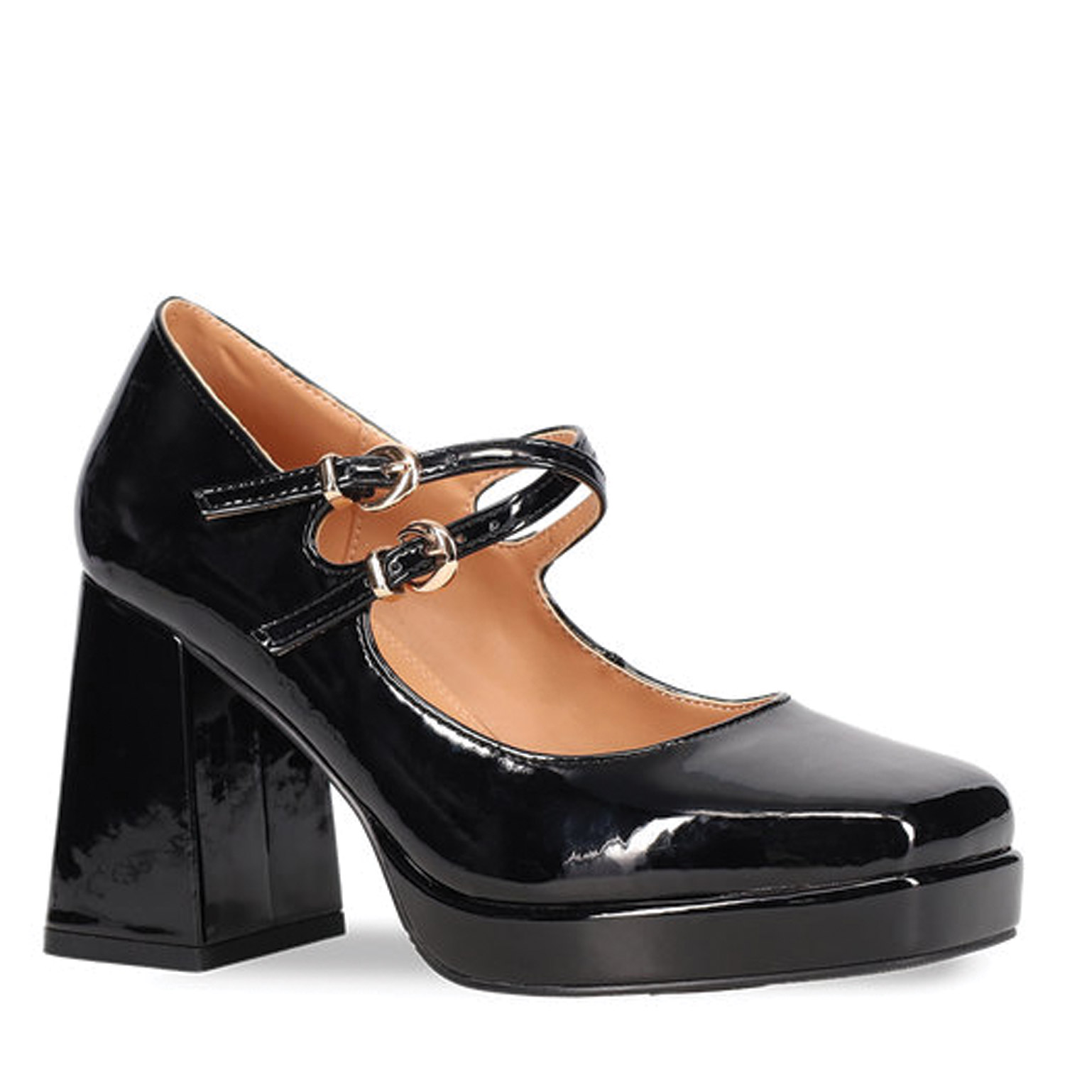 Μαύρη γόβα λουστρίνι. Διαθέτει φιάπα και ψηλό χοντρό τακούνι. Κουμπώνει με χιαστί ρυθμιζόμενα λουράκια αστραγάλου με αγκράφα.