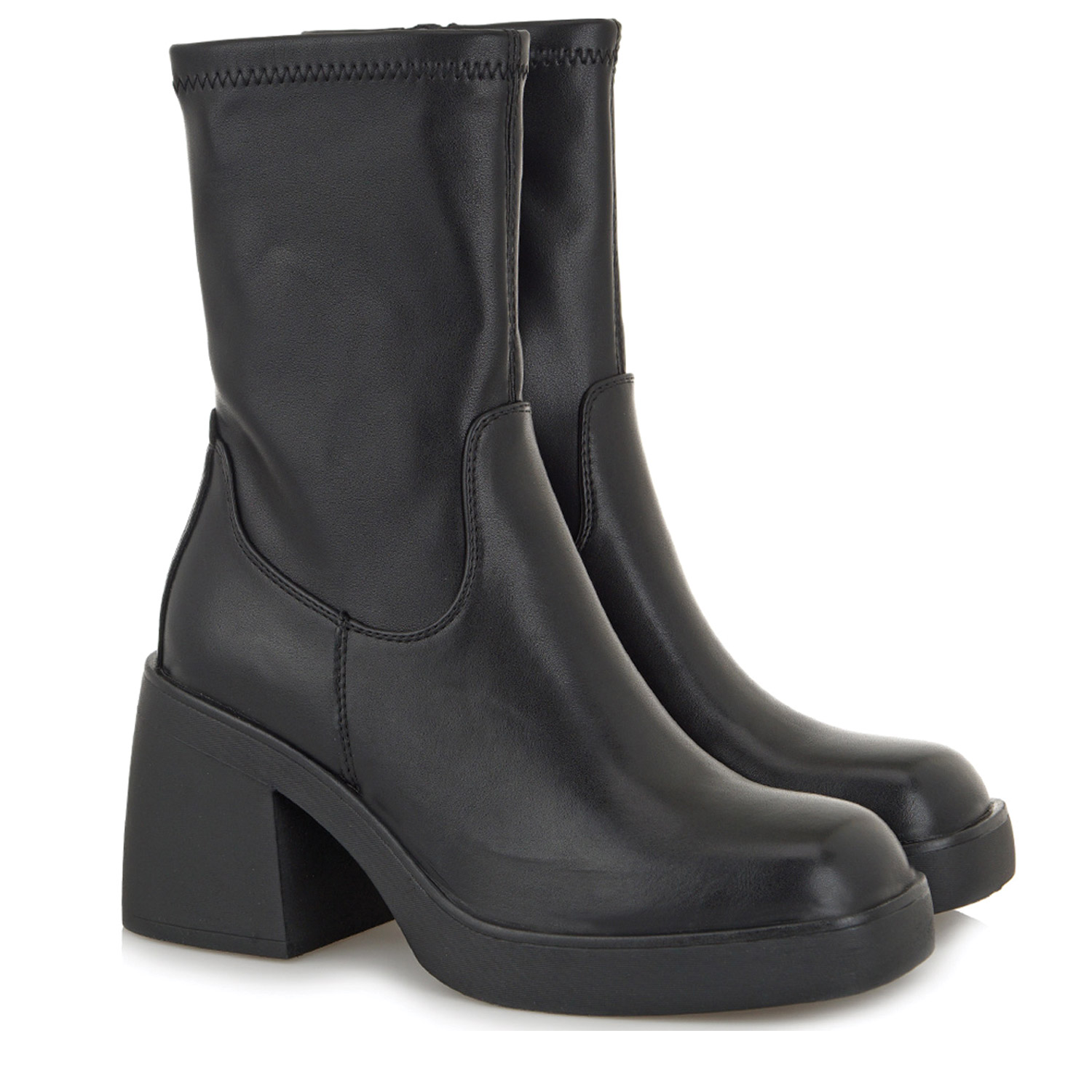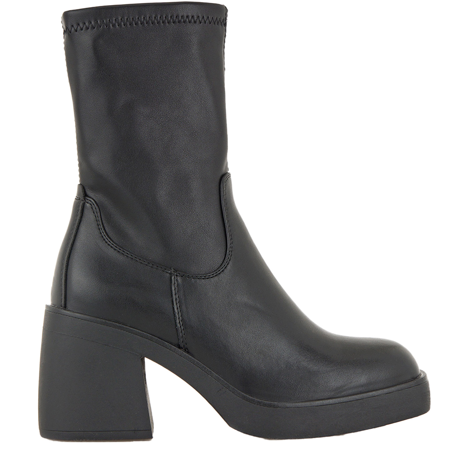 Seven γυναικείο μποτάκι, σε μαύρο χρώμα, κατασκευασμένο από οικολογικό δέρμα. Ύψος τακουνιού 8εκ.