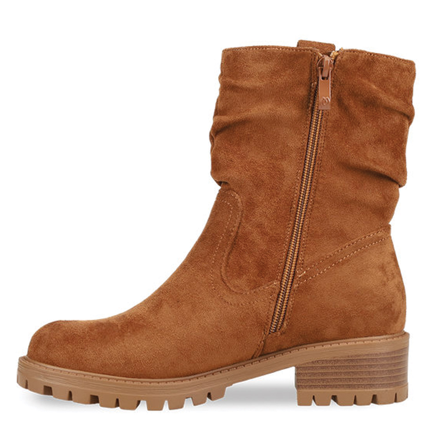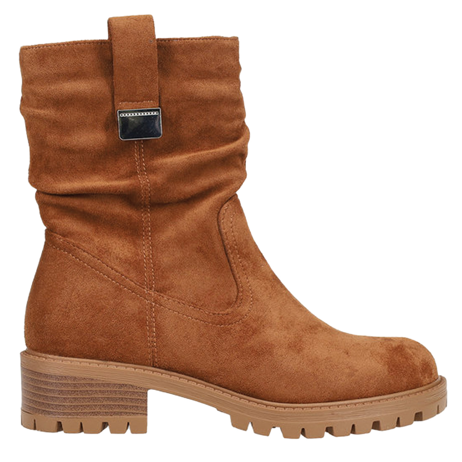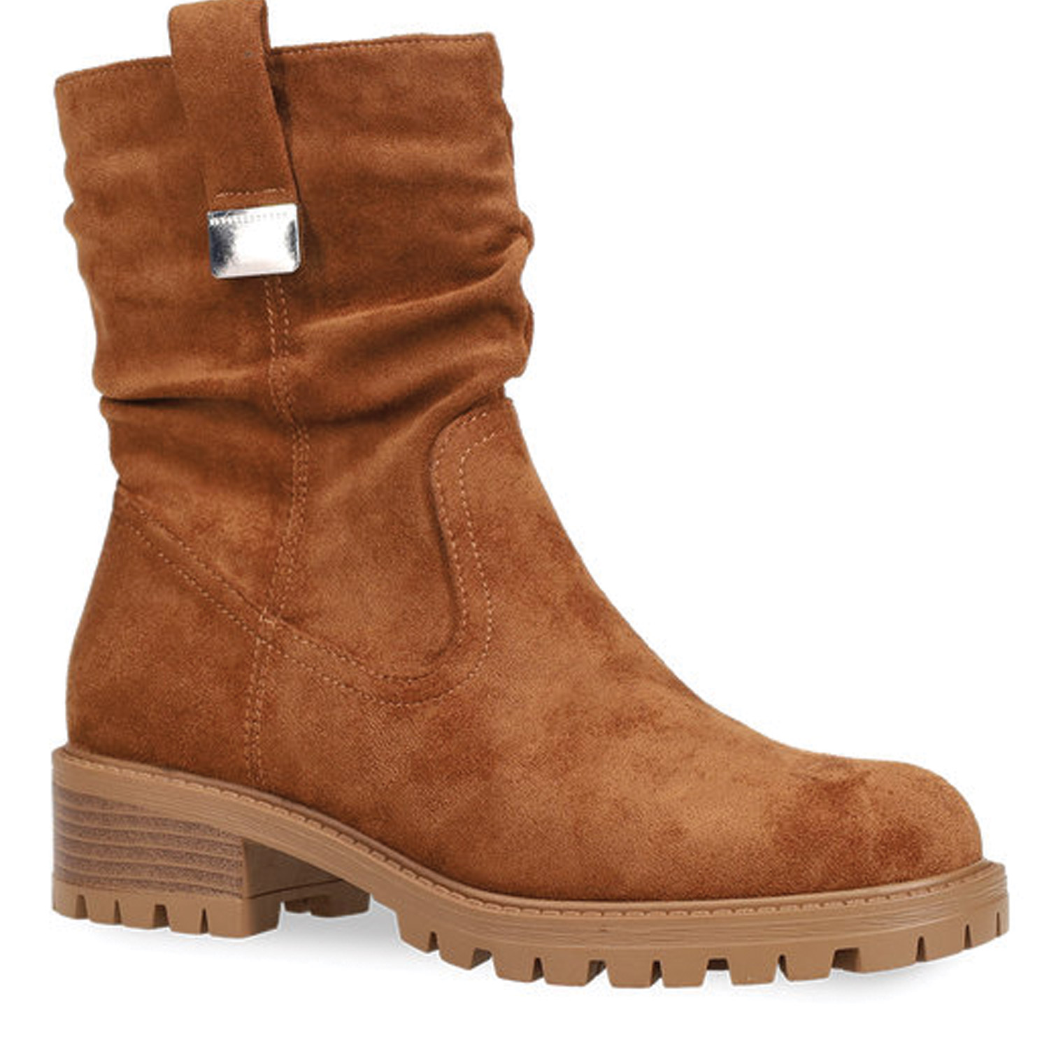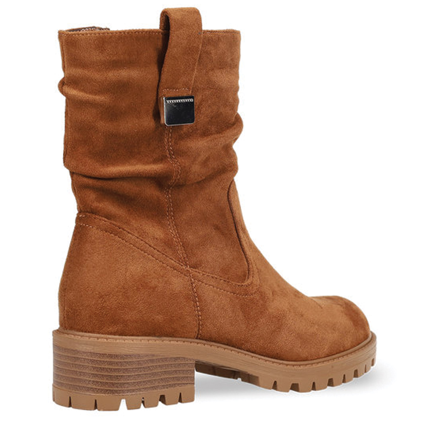 Καμηλό μποτάκι με σουέντ υφή. Διαθέτει τρακτερωτή σόλα και χαμηλό τακούνι. Κλείνει με φερμουάρ στο πλάι.