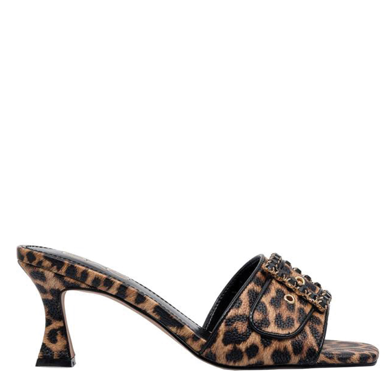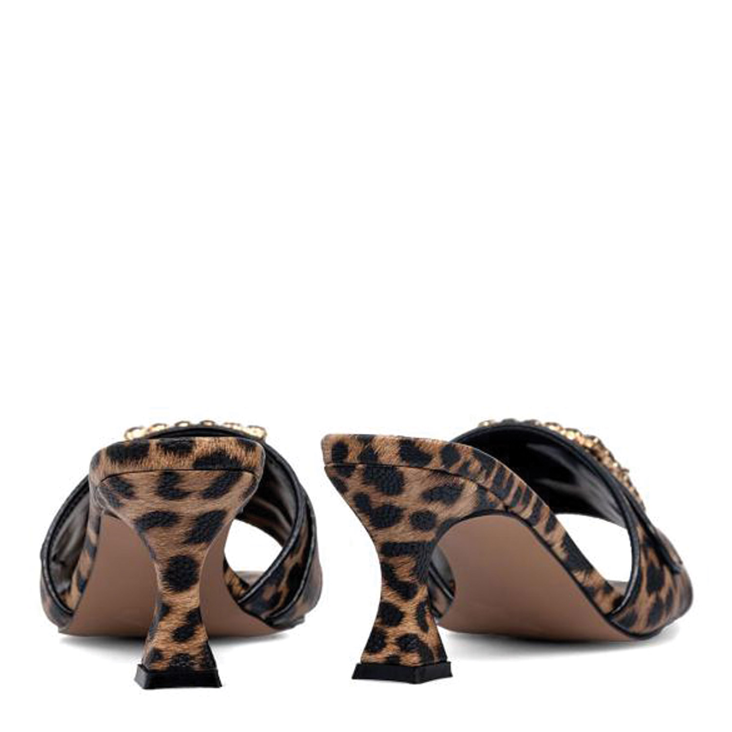 Exe γυναικείο πέδιλο, σε λεοπάρ χρώμα, κατασκευασμένο από σατέν. Ύψος τακουνιού 7εκ.