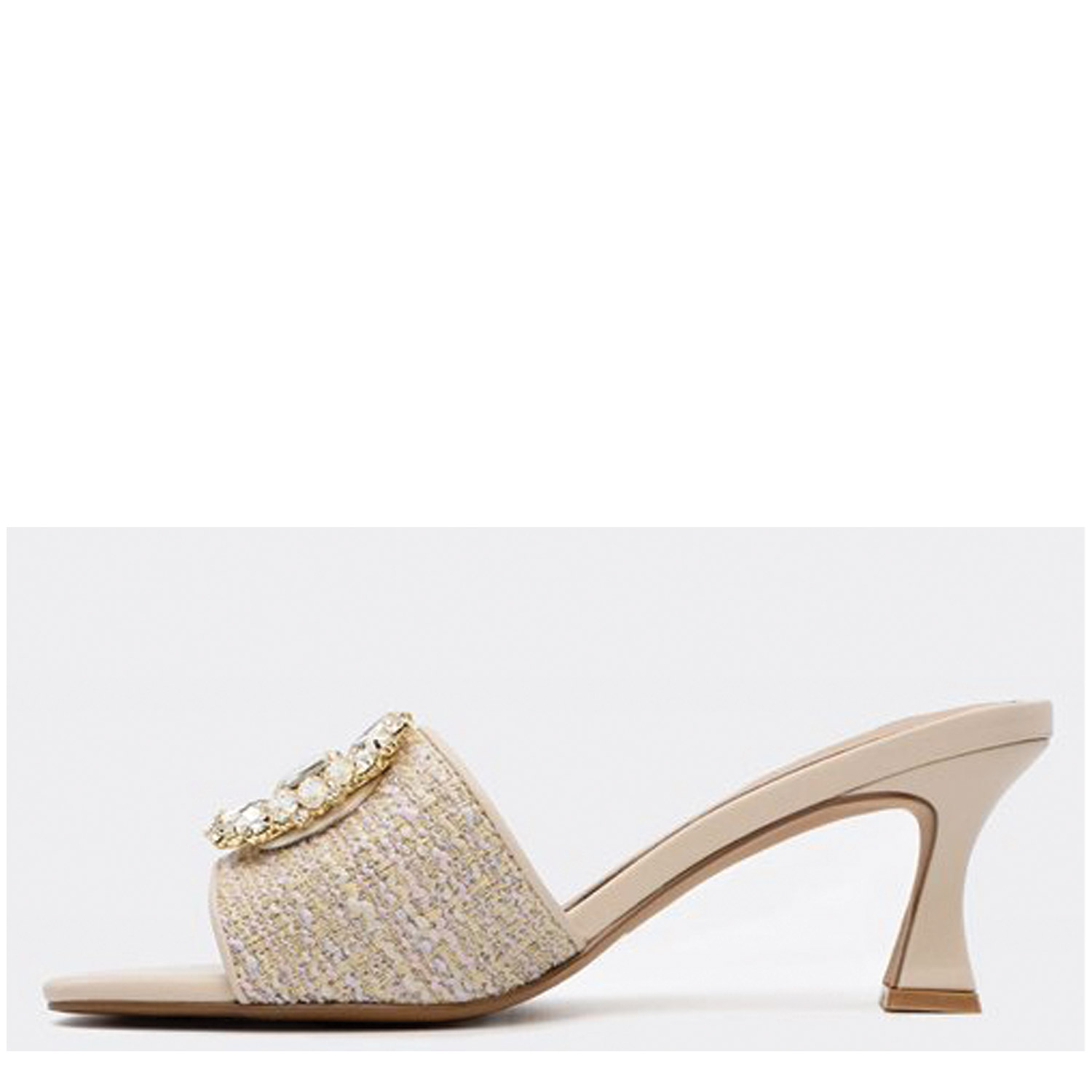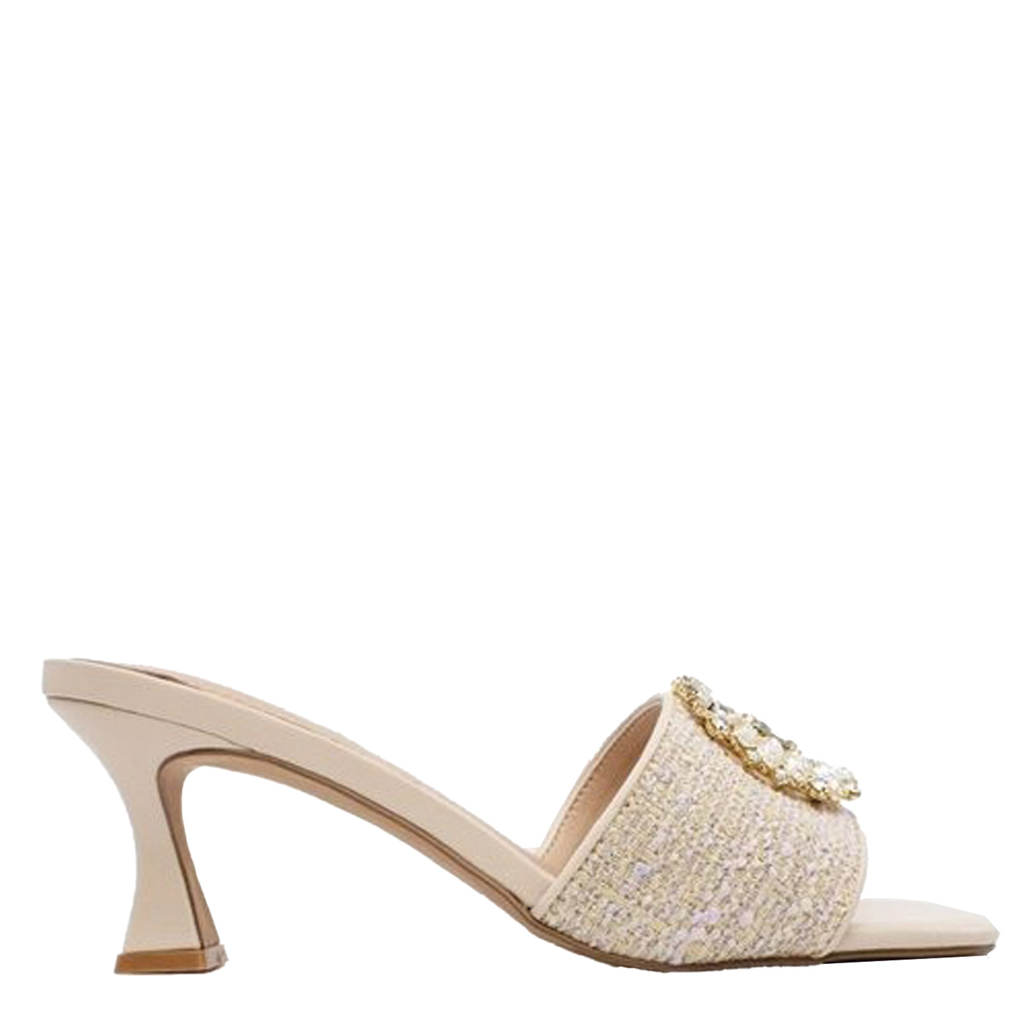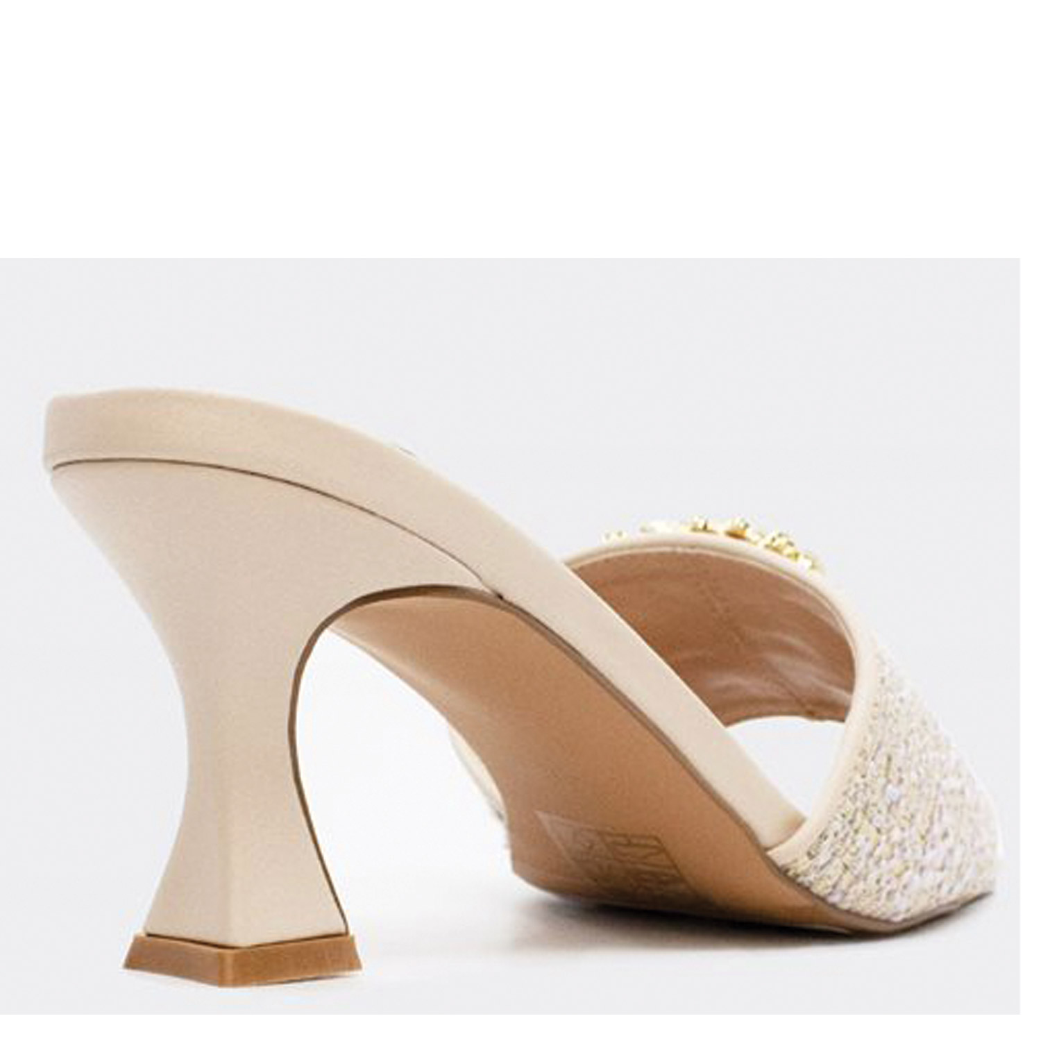 Exe γυναικείο mule, σε μπεζ χρώμα, κατασκευασμένο από οικολογικό δέρμα, με δερμάτινο πάτο. Ύψος τακουνιού  6.5εκ.